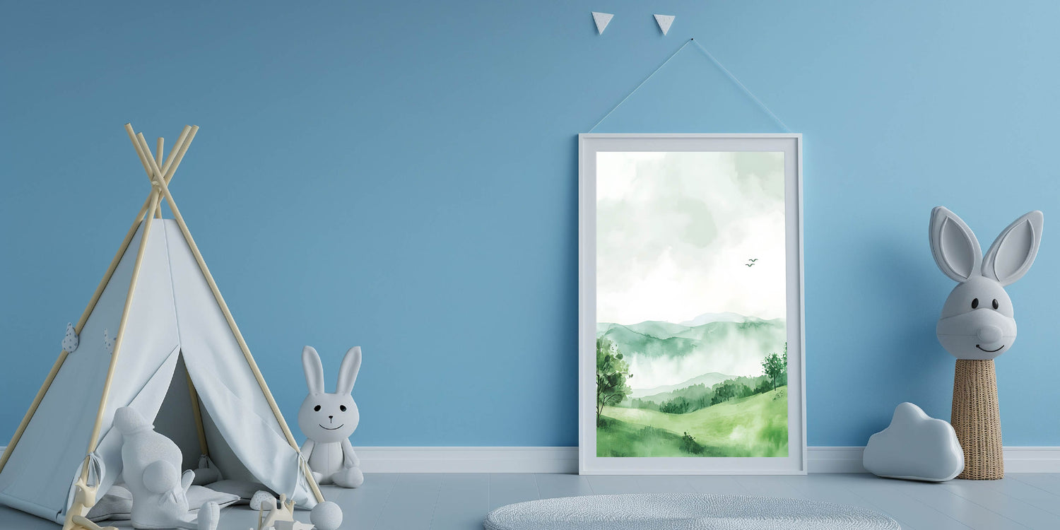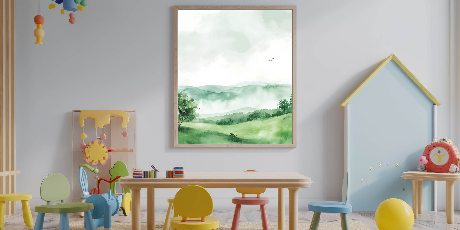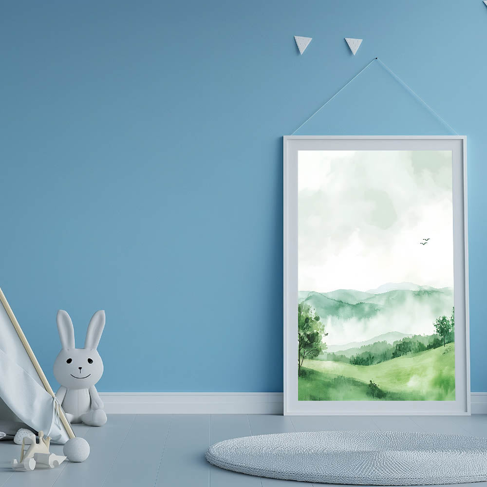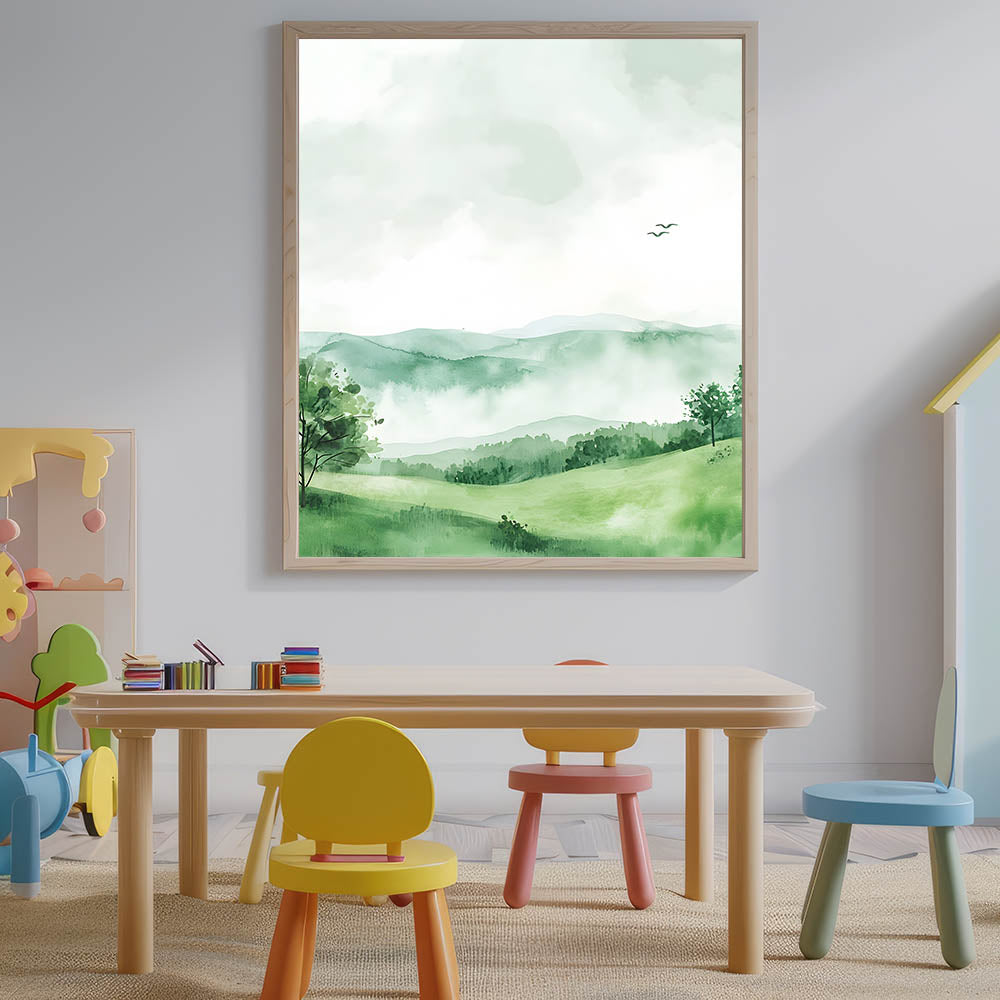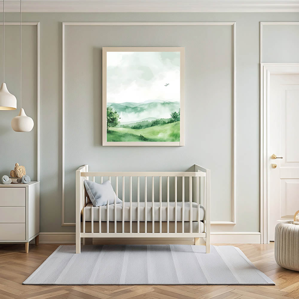 Create a calming and nature-inspired atmosphere with this Misty Green Hills Nursery Wall Art. Featuring a dreamy watercolor landscape of rolling green hills and soft misty skies, this baby room decor brings a sense of serenity and tranquility to nurseries, playrooms, or children's bedrooms.