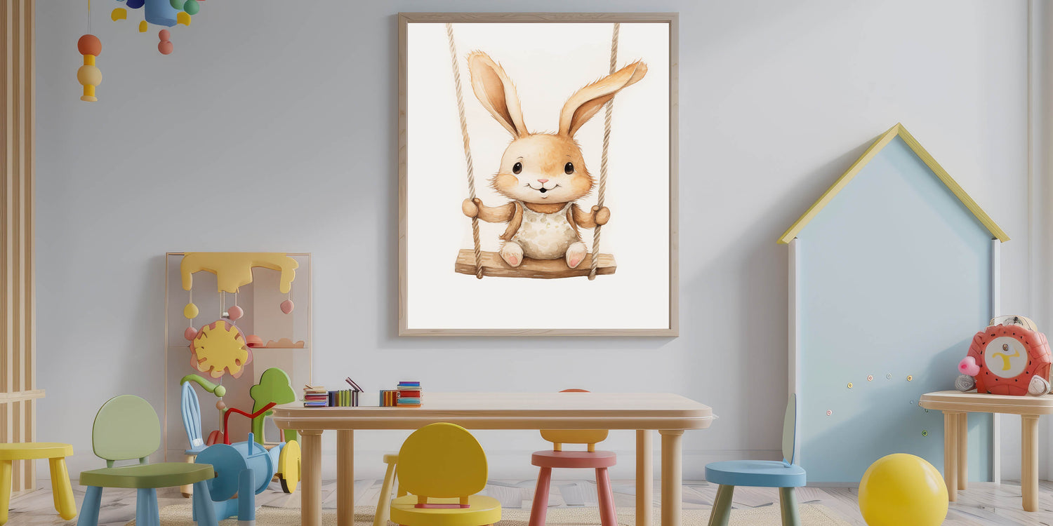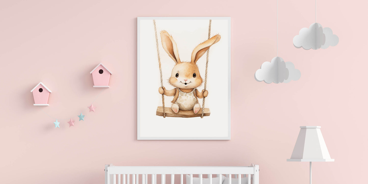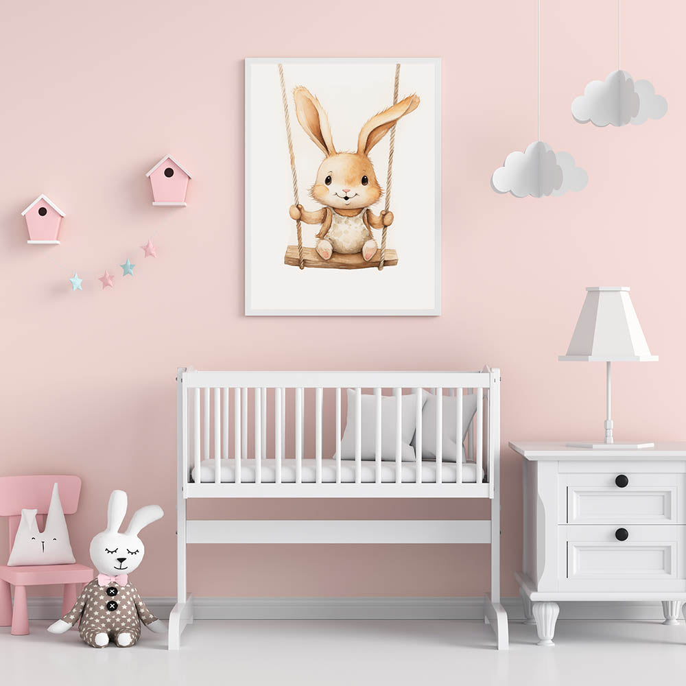Bring joy and charm to your little one’s space with this adorable bunny on a swing nursery wall art. Featuring a beautifully illustrated rabbit happily swinging, this children’s wall art adds a playful and heartwarming touch to any nursery, playroom, or toddler’s bedroom.