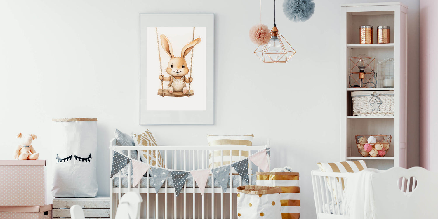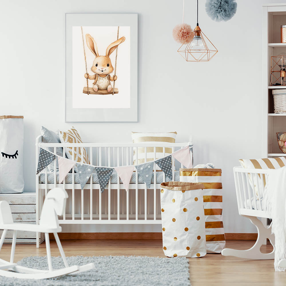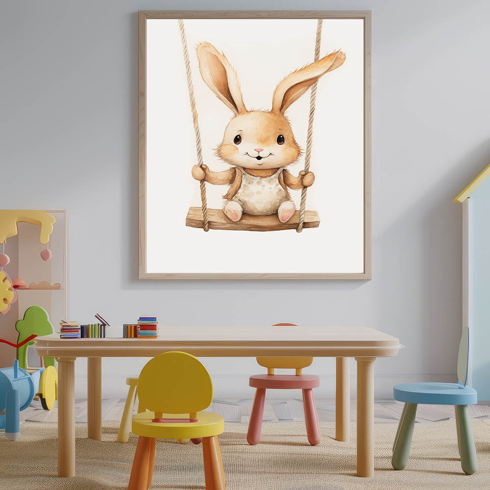 Bring joy and charm to your little one’s space with this adorable bunny on a swing nursery wall art. Featuring a beautifully illustrated rabbit happily swinging, this children’s wall art adds a playful and heartwarming touch to any nursery, playroom, or toddler’s bedroom.