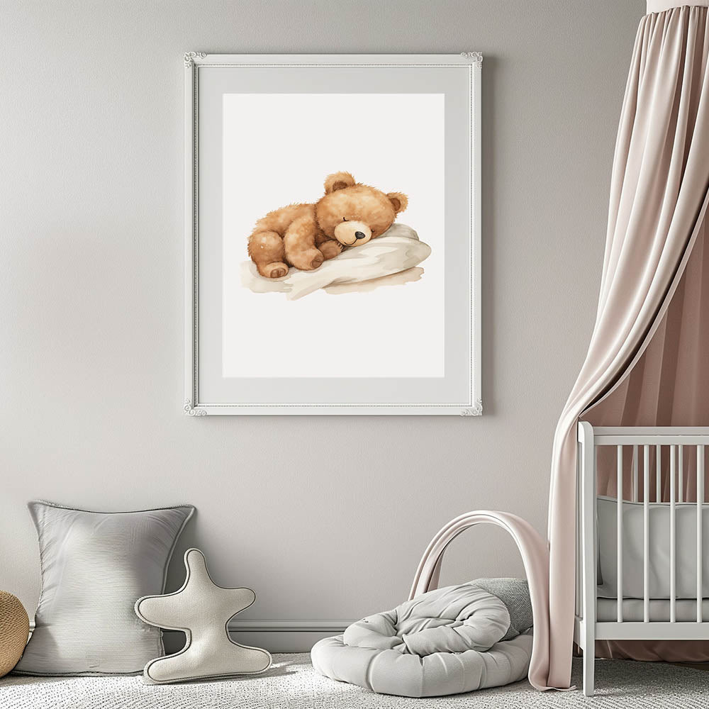Create a peaceful and cozy nursery space with this sleeping teddy bear nursery wall art. Featuring a soft, fluffy teddy bear snuggled on a pillow, this charming baby room decor piece brings a sense of comfort and warmth to any child’s space. The gentle beige and brown tones complement a variety of nursery themes, from woodland to minimalist designs.