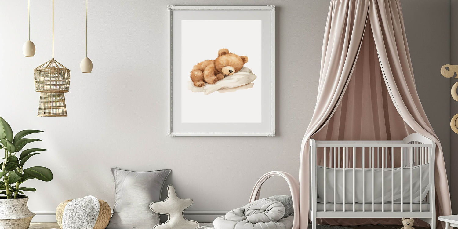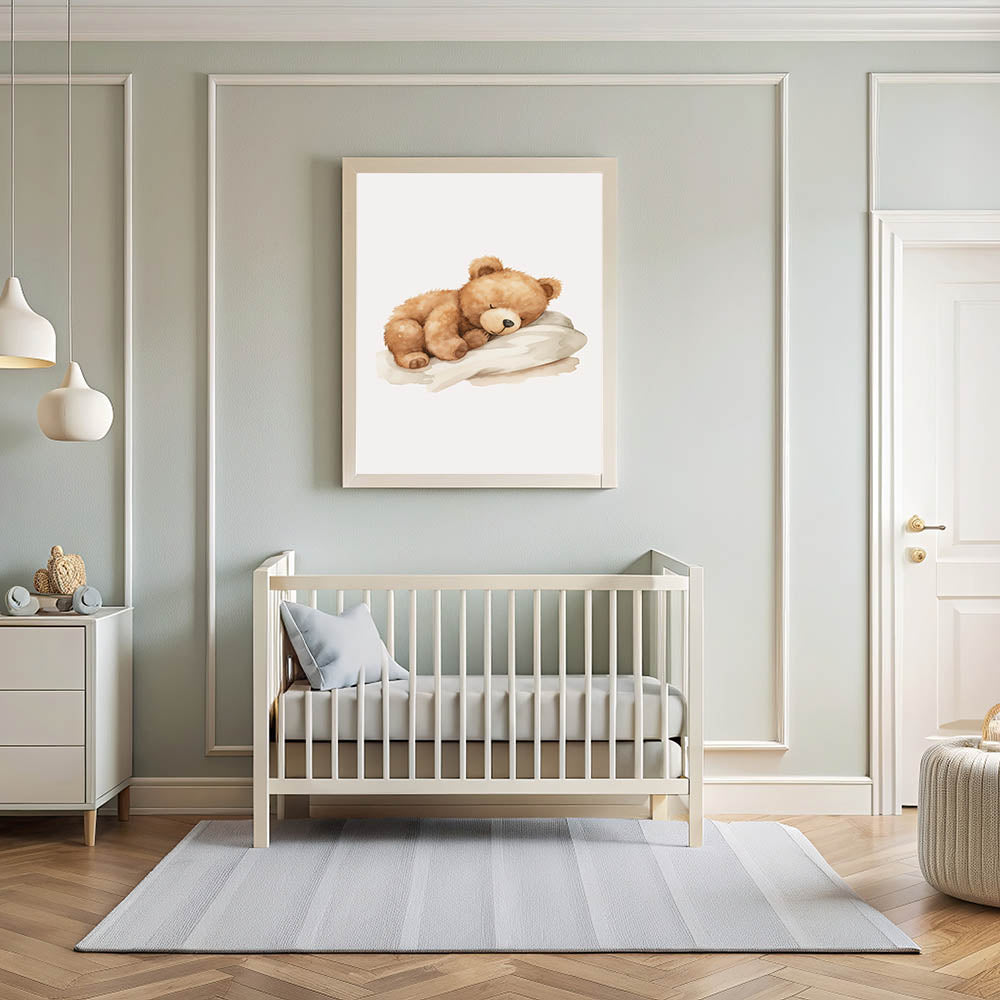 This framed nursery art is the perfect bedtime companion for your little one, adding a calming and whimsical touch to their room. Whether you choose Framed Acrylic Children's Art or a Rolled Canvas Nursery Print, this sleeping teddy bear print will bring warmth and serenity to your baby’s nursery.