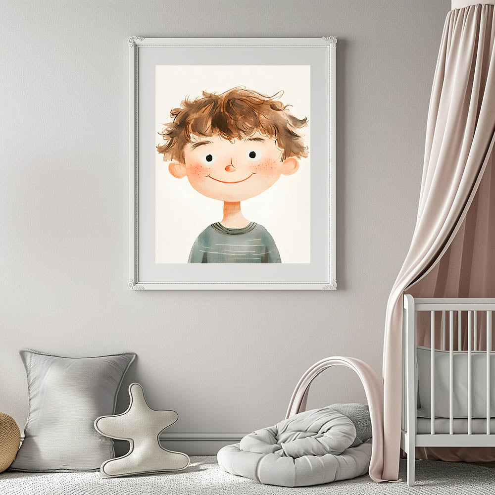 Bring warmth and joy to your child’s space with this Smiling Boy Nursery Wall Art. This delightful watercolor illustration captures the innocence and happiness of childhood with a cheerful young boy, bright eyes, and a charming smile. The soft, earthy tones of brown, peach, and muted green blend beautifully, making it an ideal addition to baby room decor and children’s wall art collections.