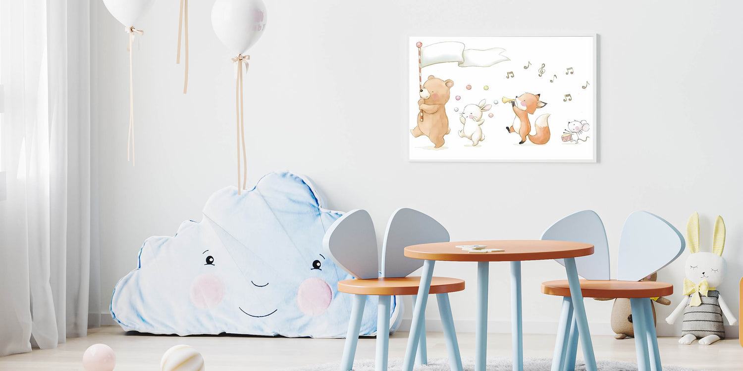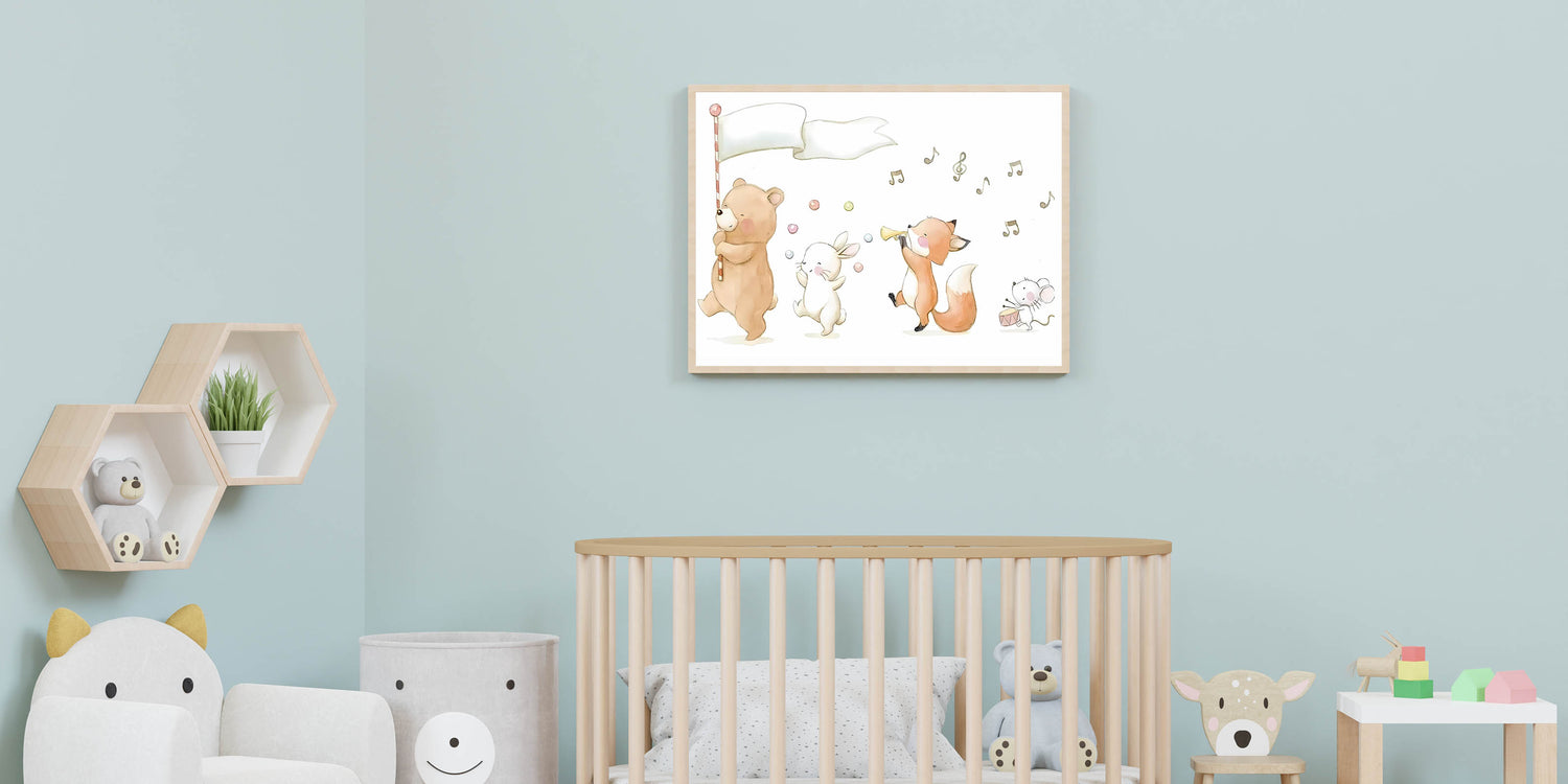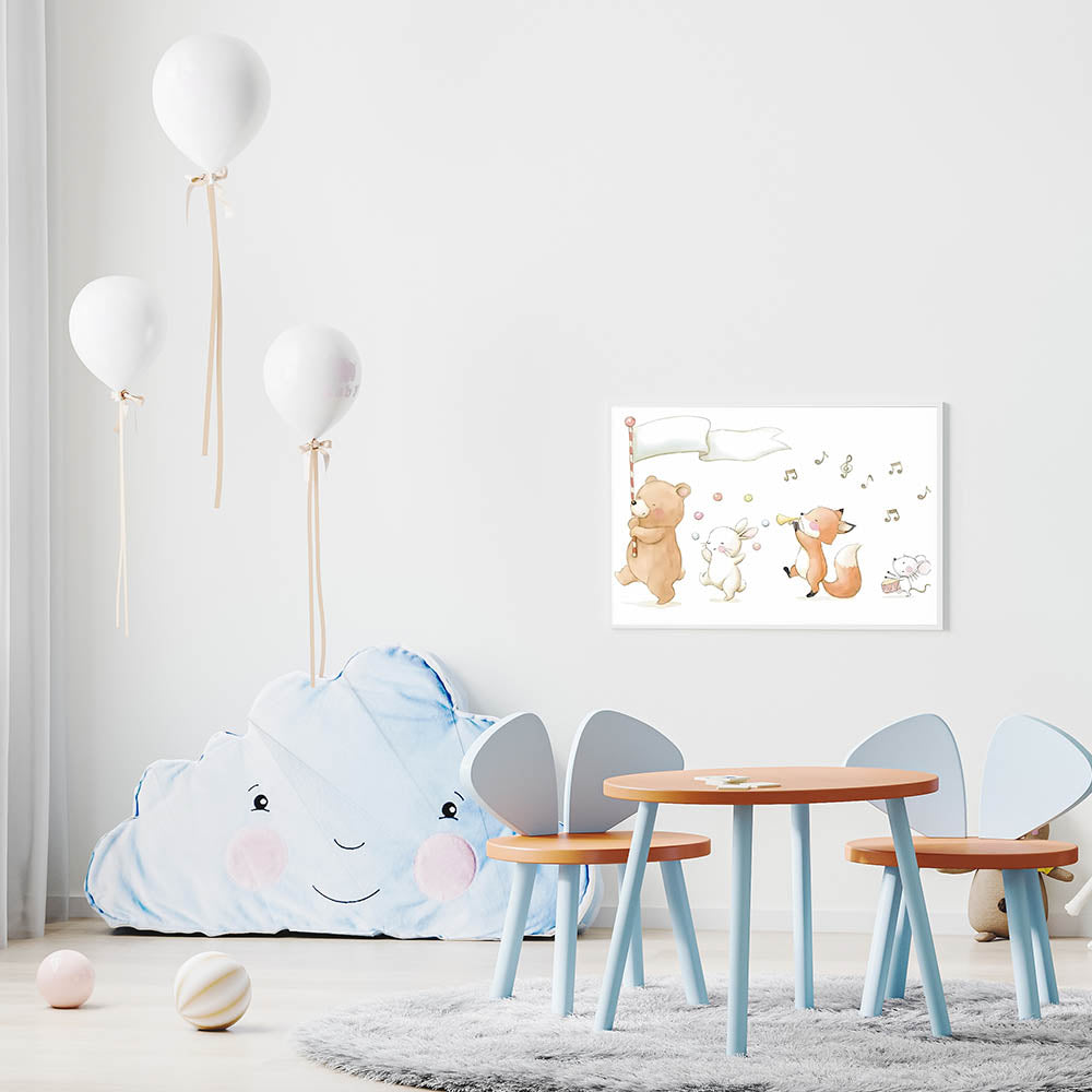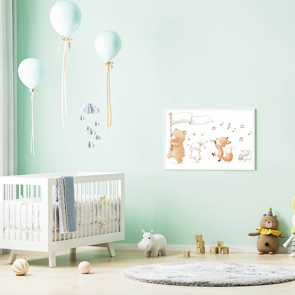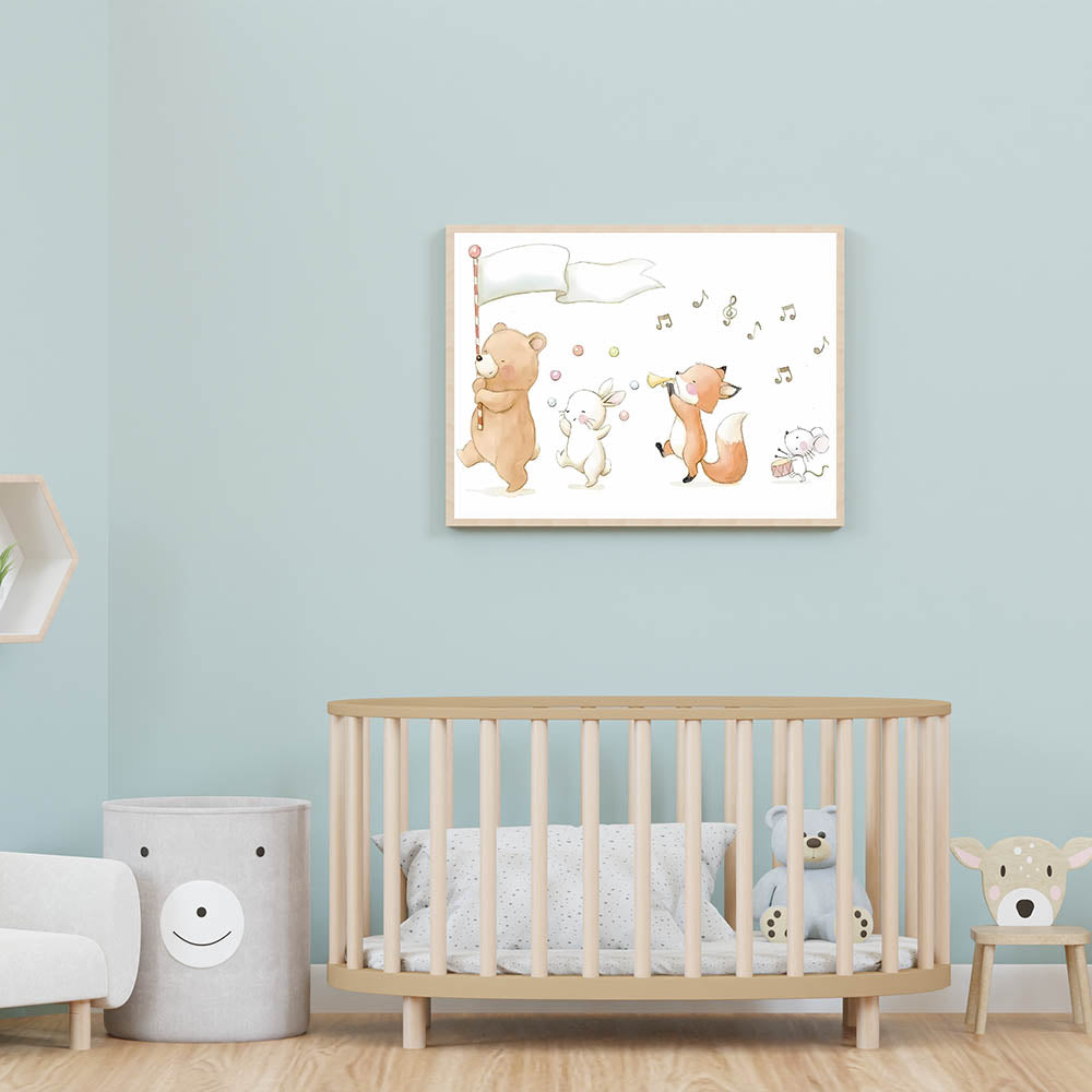 • Playful & Whimsical Design – A parade of happy woodland animals with instruments and music notes, adding fun and movement to kids' room art prints.