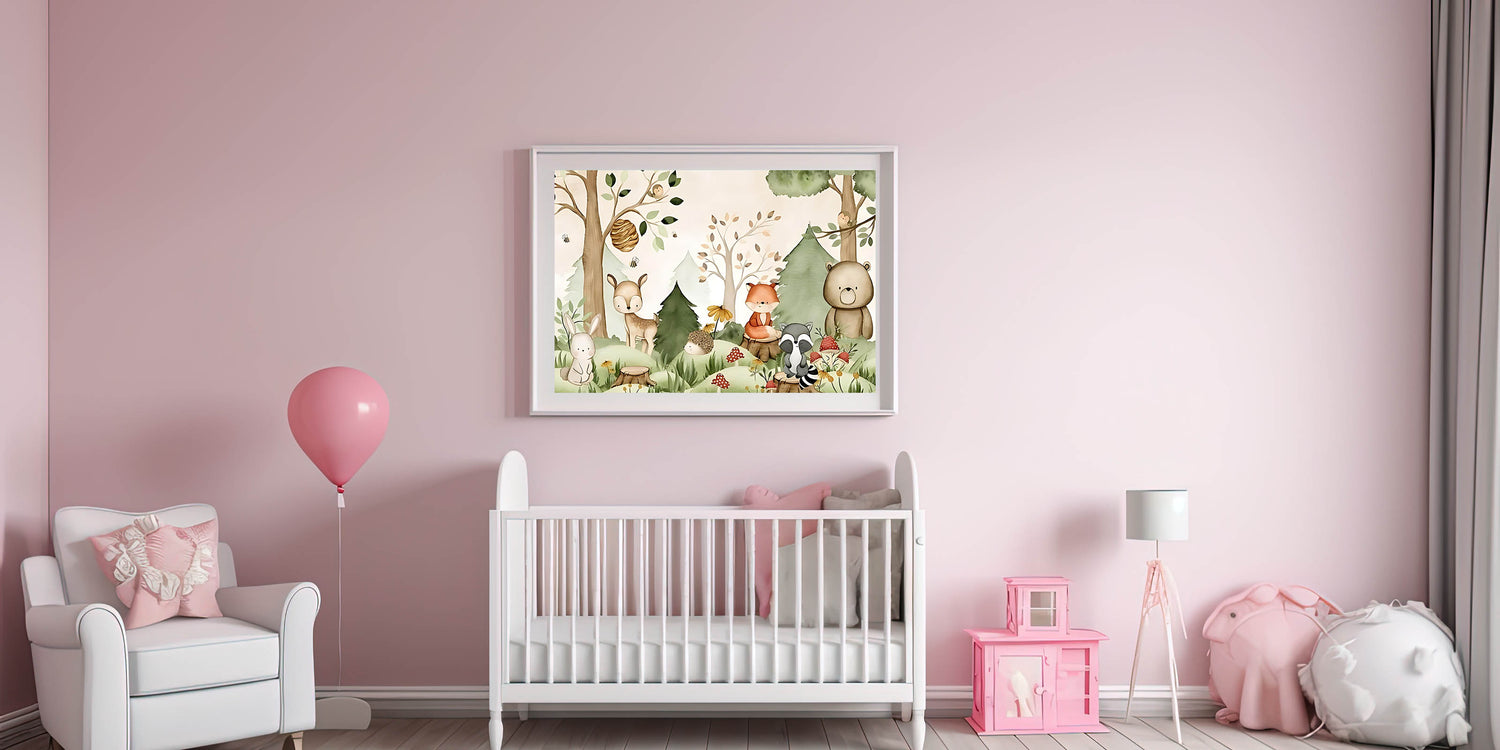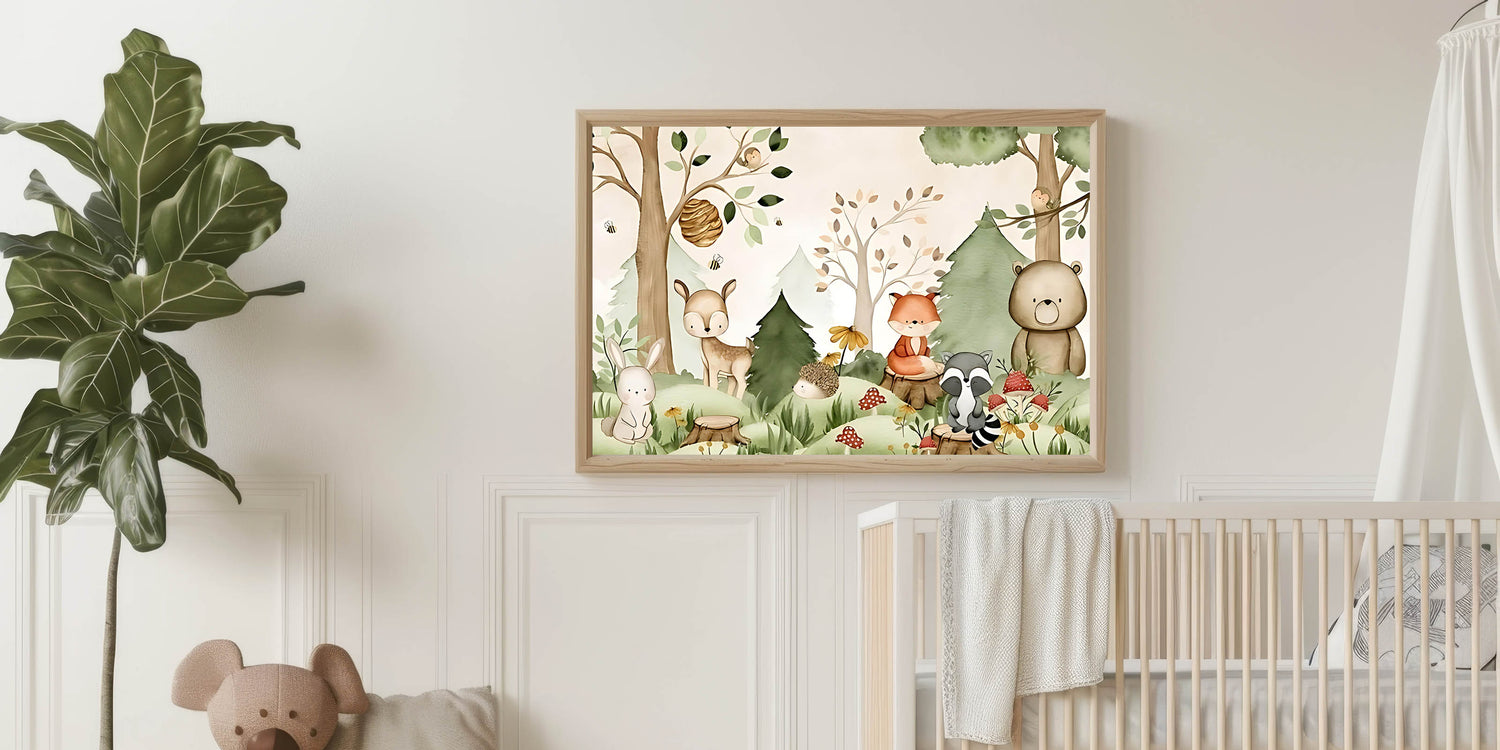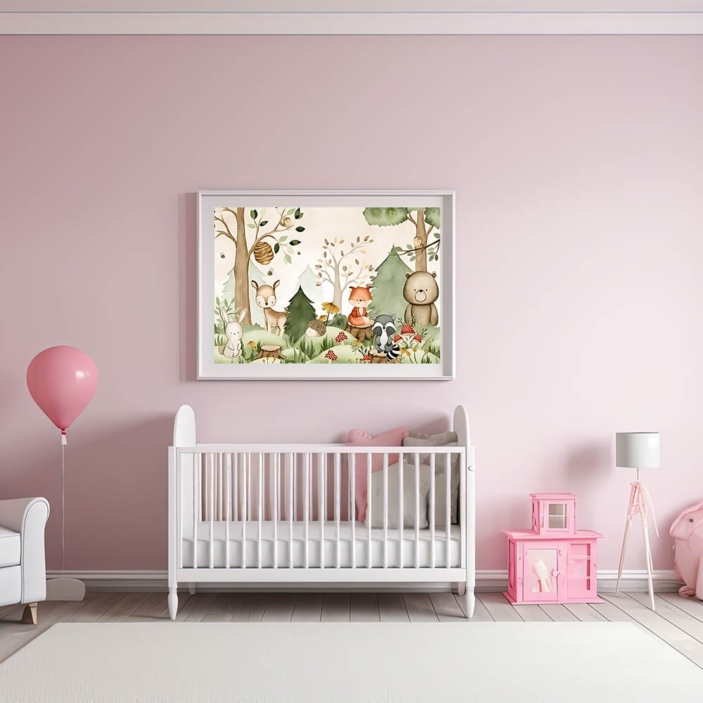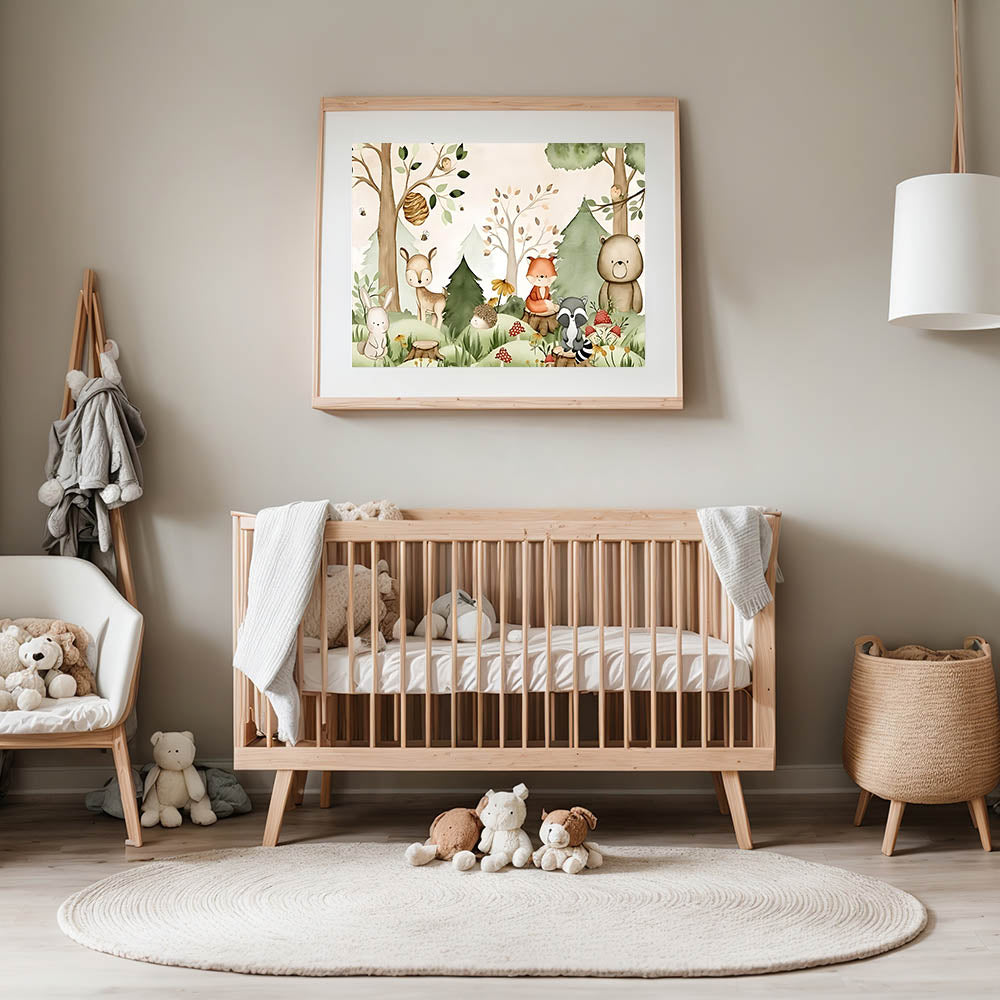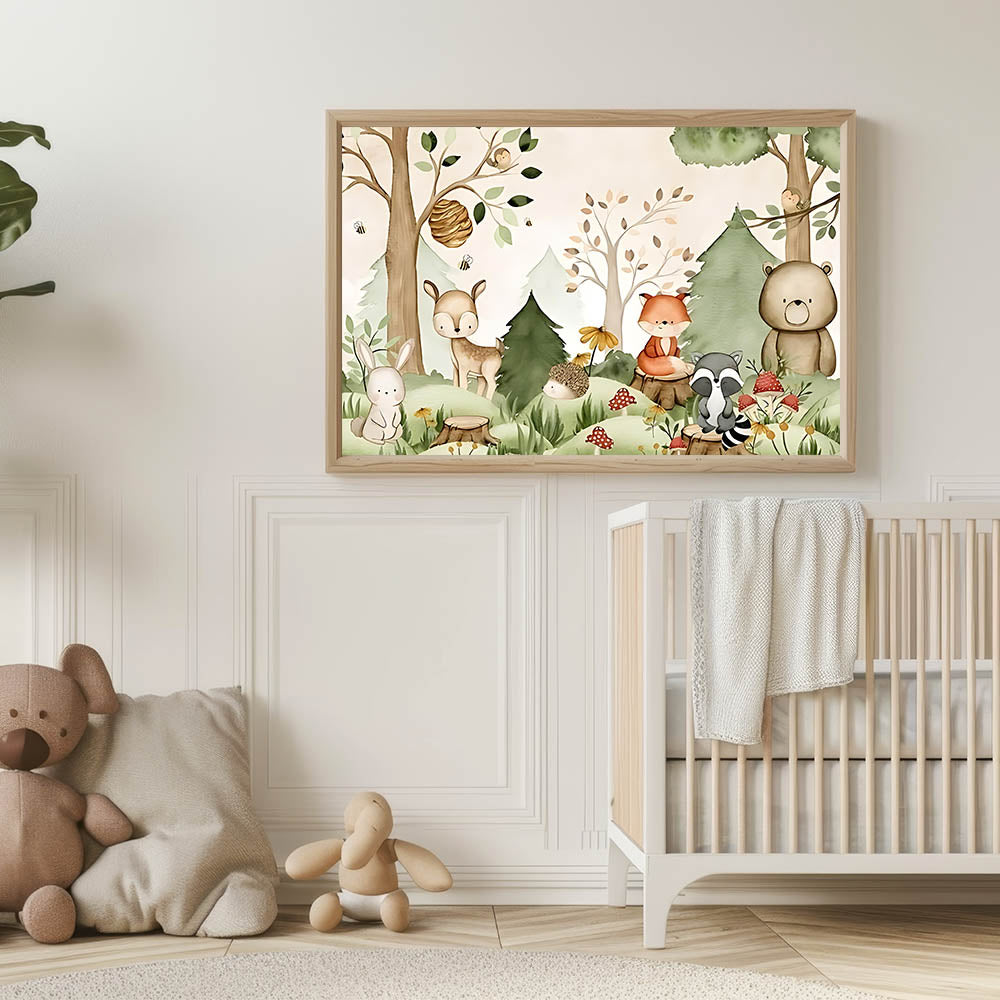 - Charming & Nature-Inspired Design – A peaceful woodland scene with adorable forest animals, creating a warm and inviting atmosphere in kids' room art prints.