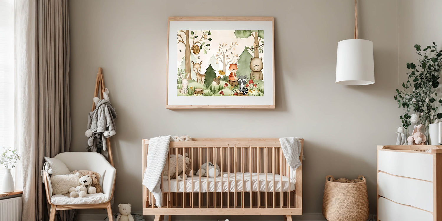 Enhance your child’s space with this nursery canvas print, a framed baby art print, or a durable acrylic nursery print. The earthy greens, browns, and soft beige tones create a soothing and timeless woodland theme for any nursery or playroom.
