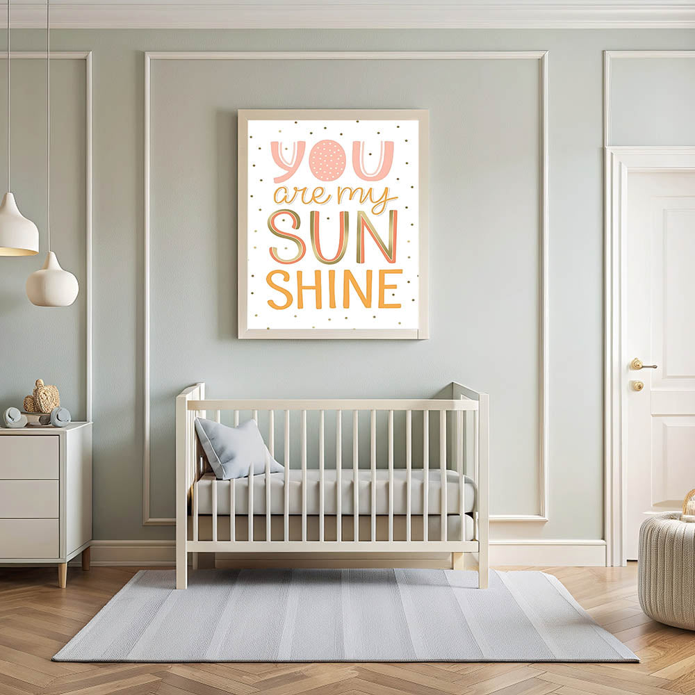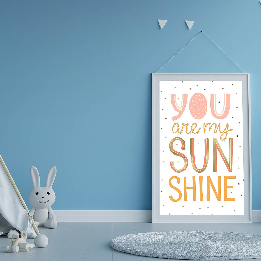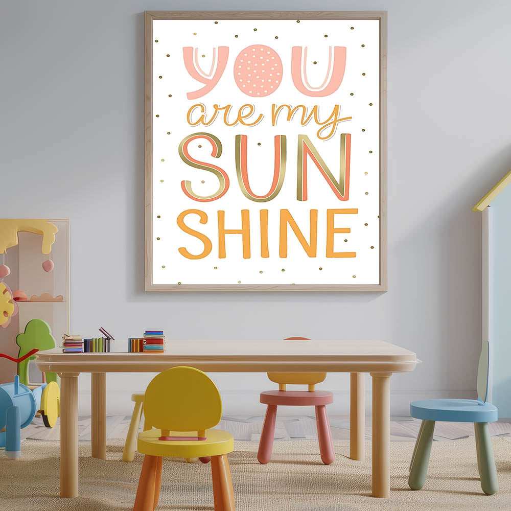 Bring warmth and positivity to your child's space with this You Are My Sunshine nursery wall art. Featuring a cheerful typography design in peach, gold, and orange tones, this uplifting baby room decor adds a joyful and inspiring touch to any nursery. Perfect for a gender-neutral or themed room, this children’s wall art blends beautifully into a kids' room art prints collection.