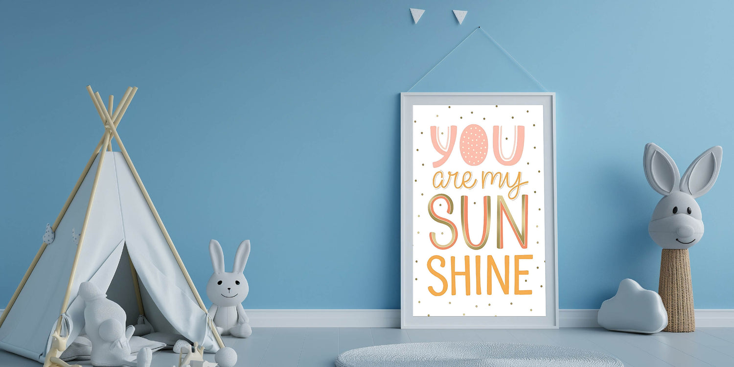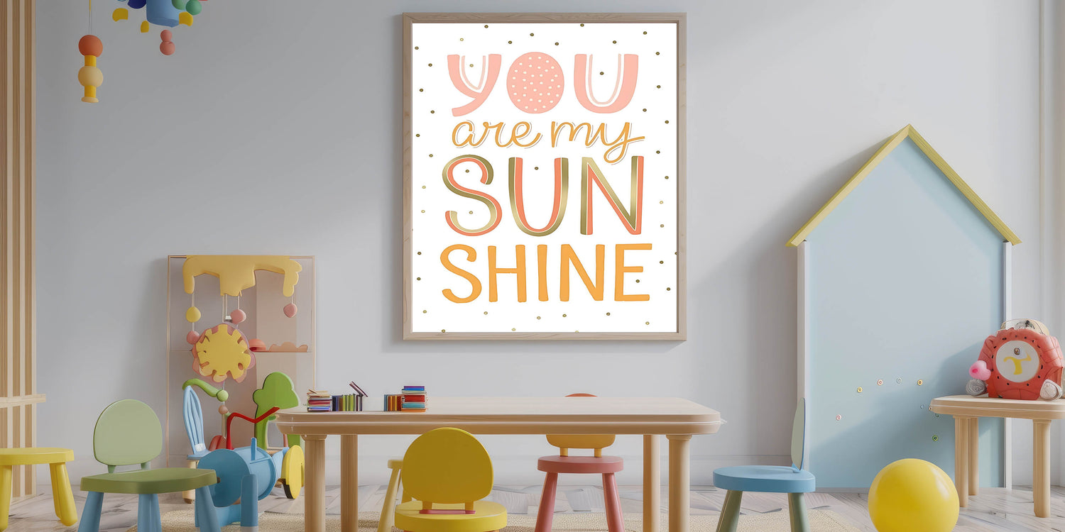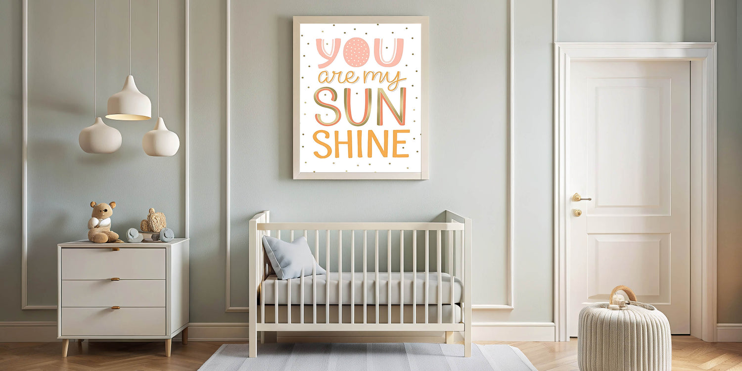 Bring warmth and positivity to your child's space with this You Are My Sunshine nursery wall art. Featuring a cheerful typography design in peach, gold, and orange tones, this uplifting baby room decor adds a joyful and inspiring touch to any nursery. Perfect for a gender-neutral or themed room, this children’s wall art blends beautifully into a kids' room art prints collection.