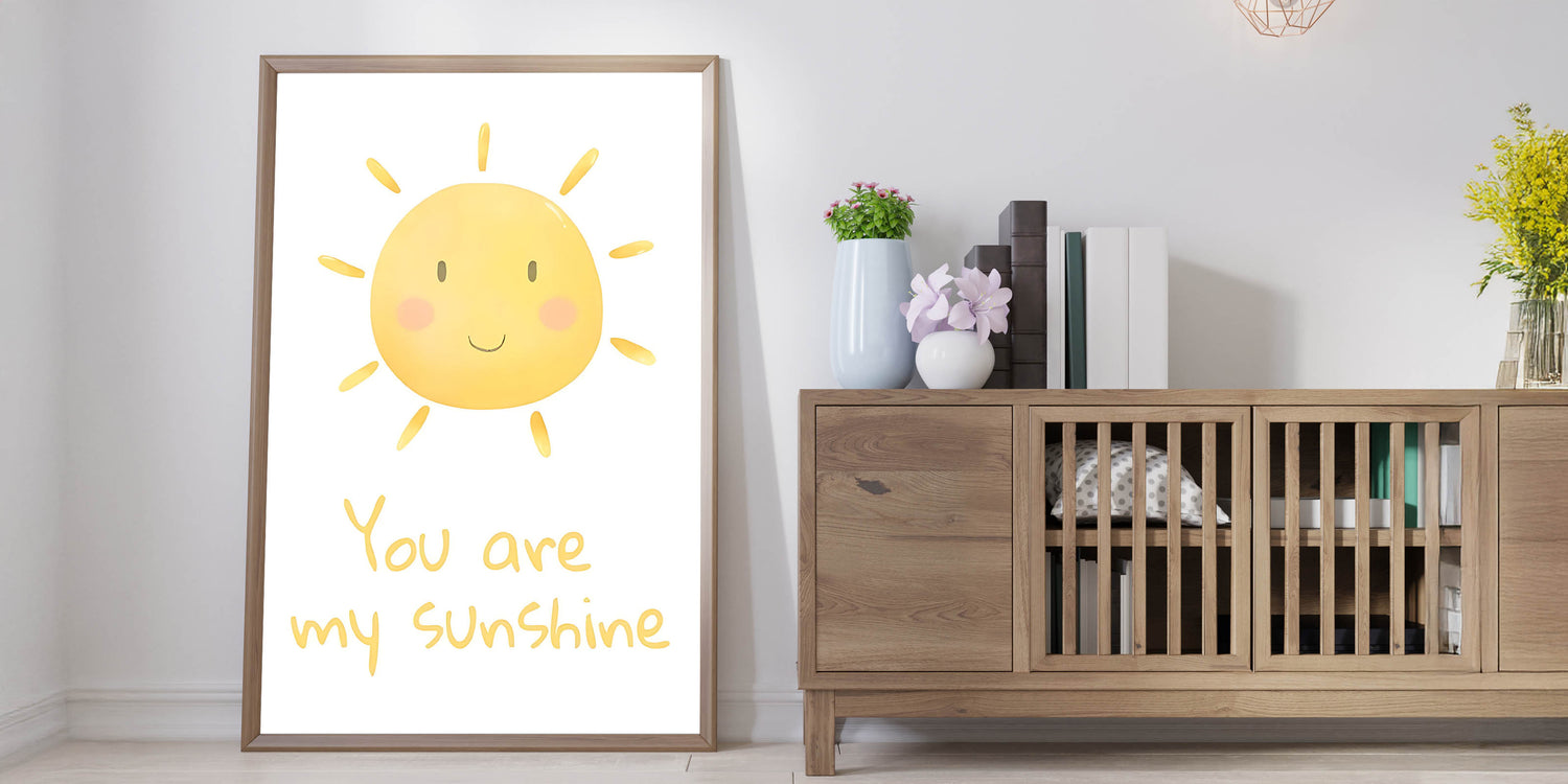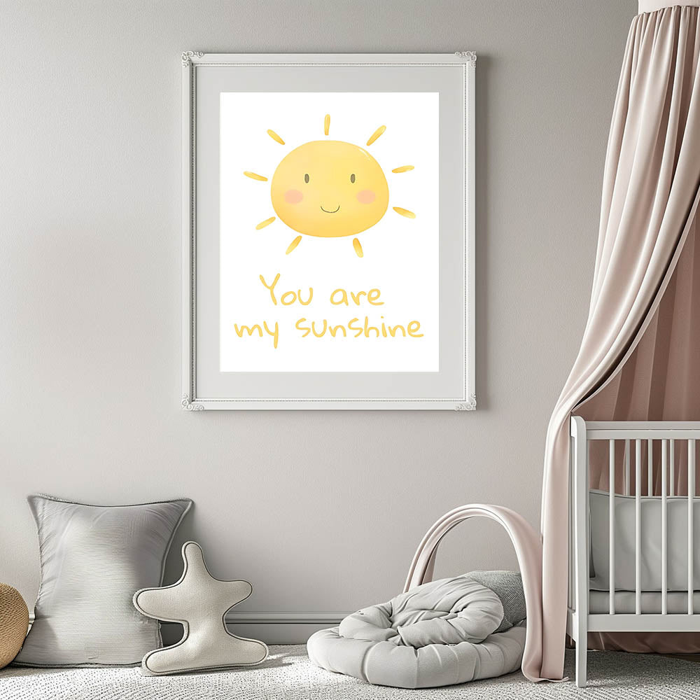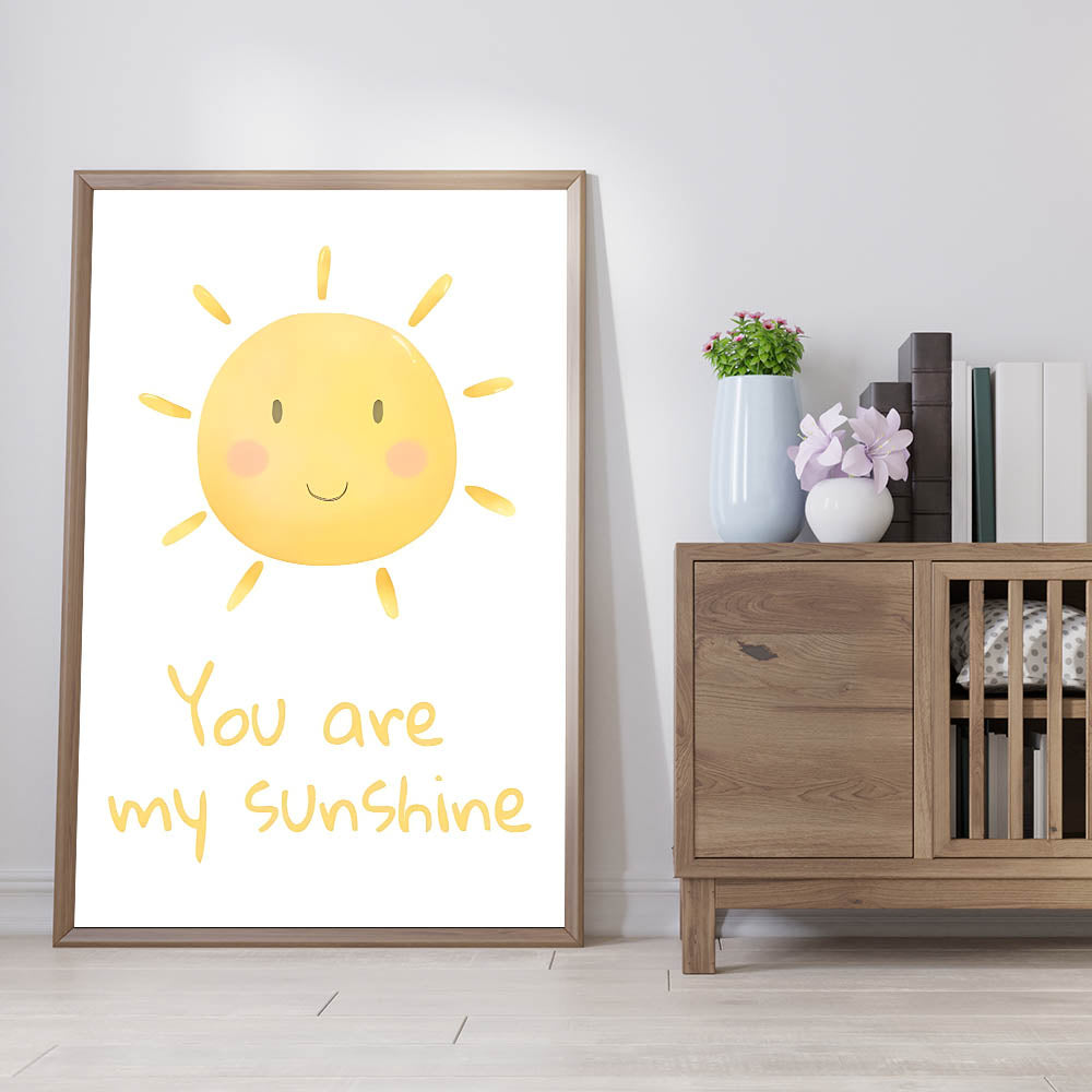 Brighten up your little one's space with this You Are My Sunshine nursery wall art, a heartwarming and cheerful design perfect for baby room decor. Featuring a smiling sun in soft yellow and light peach tones, along with the uplifting message "You are my sunshine", this artwork brings warmth, positivity, and happiness to children’s wall art collections.