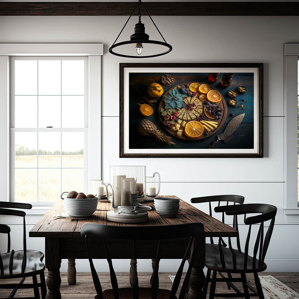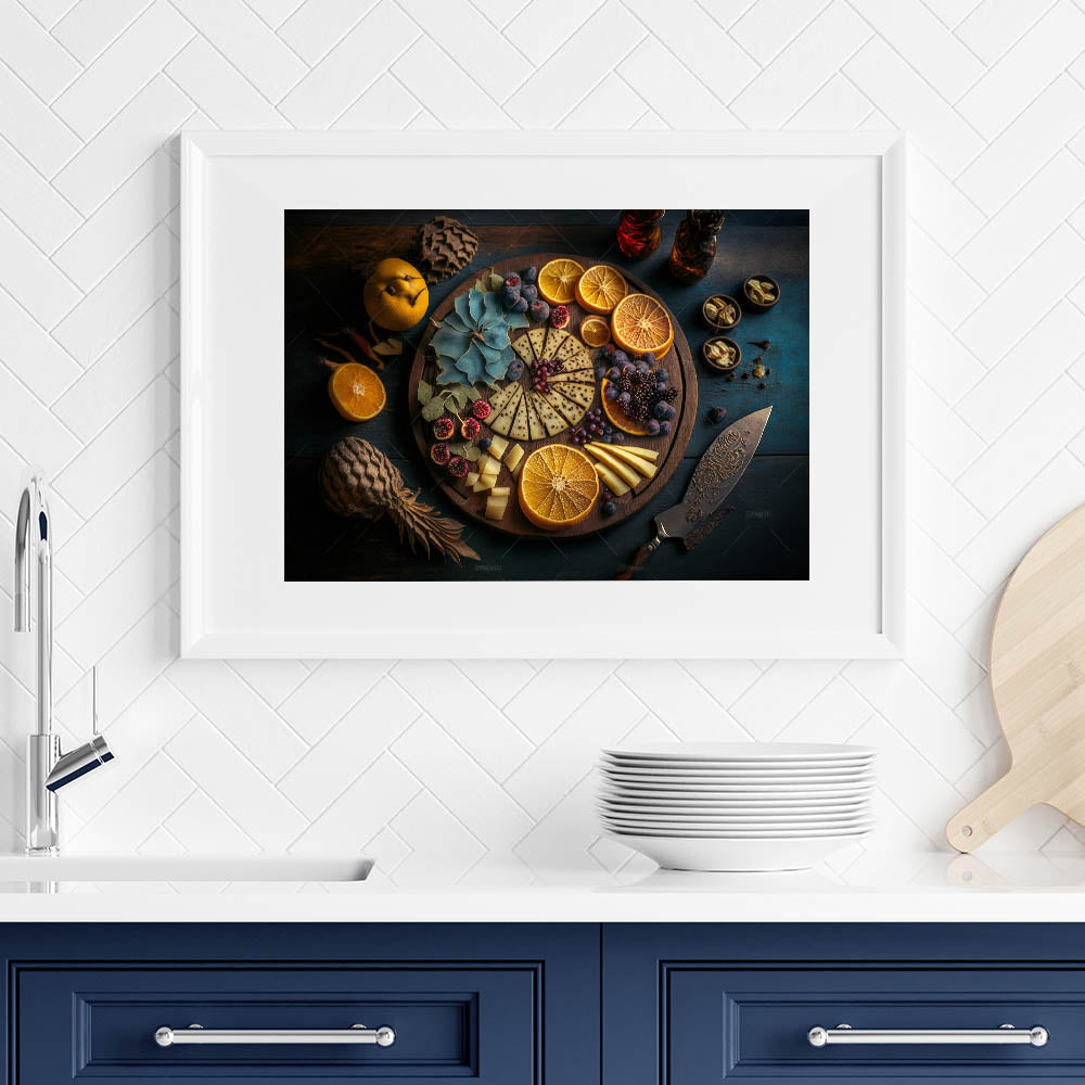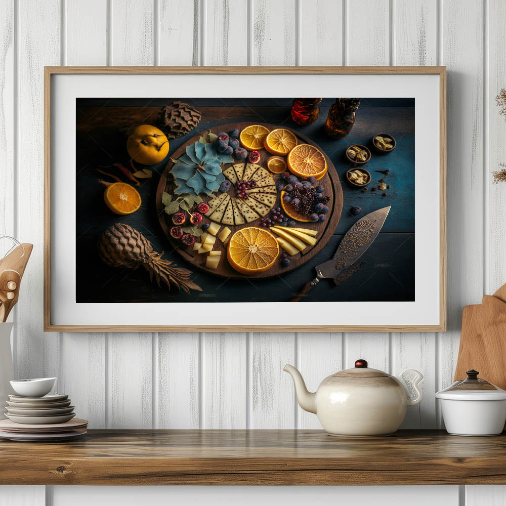 Indulge in the elegance of fine dining with this stunning cheese and citrus platter artwork, featuring a beautifully arranged selection of cheeses, dried oranges, fresh figs, blackberries, and herbs. The dark, moody background contrasts with the warm tones of the rustic wooden board, creating a visually striking composition that brings sophistication to any kitchen.
