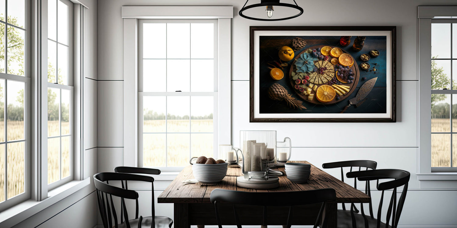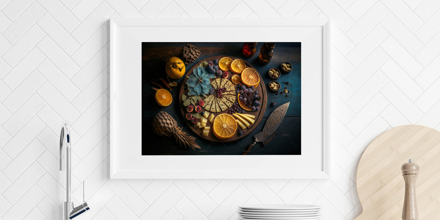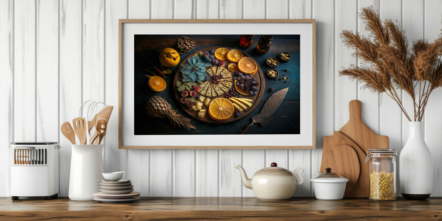 Indulge in the elegance of fine dining with this stunning cheese and citrus platter artwork, featuring a beautifully arranged selection of cheeses, dried oranges, fresh figs, blackberries, and herbs. The dark, moody background contrasts with the warm tones of the rustic wooden board, creating a visually striking composition that brings sophistication to any kitchen.