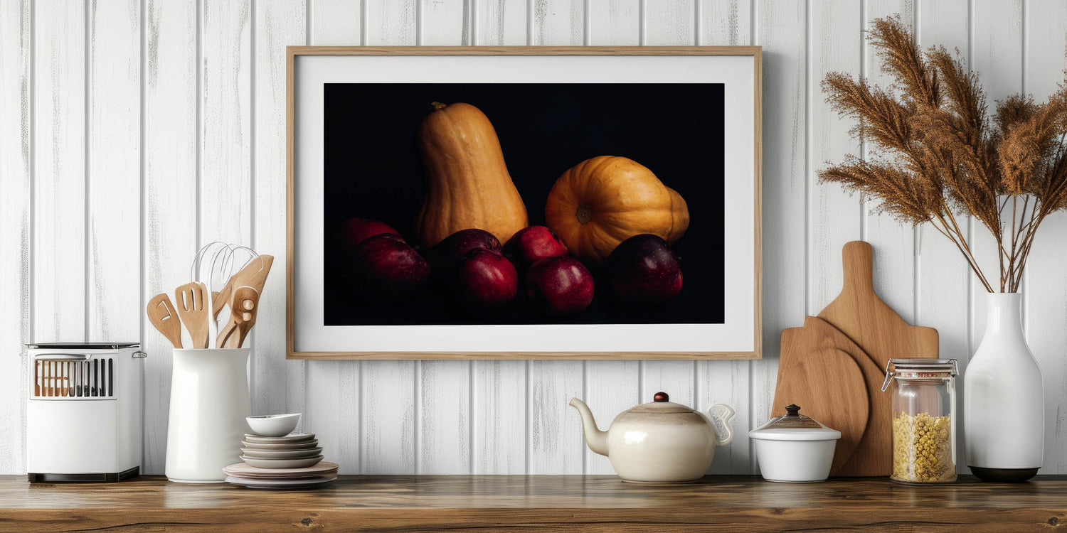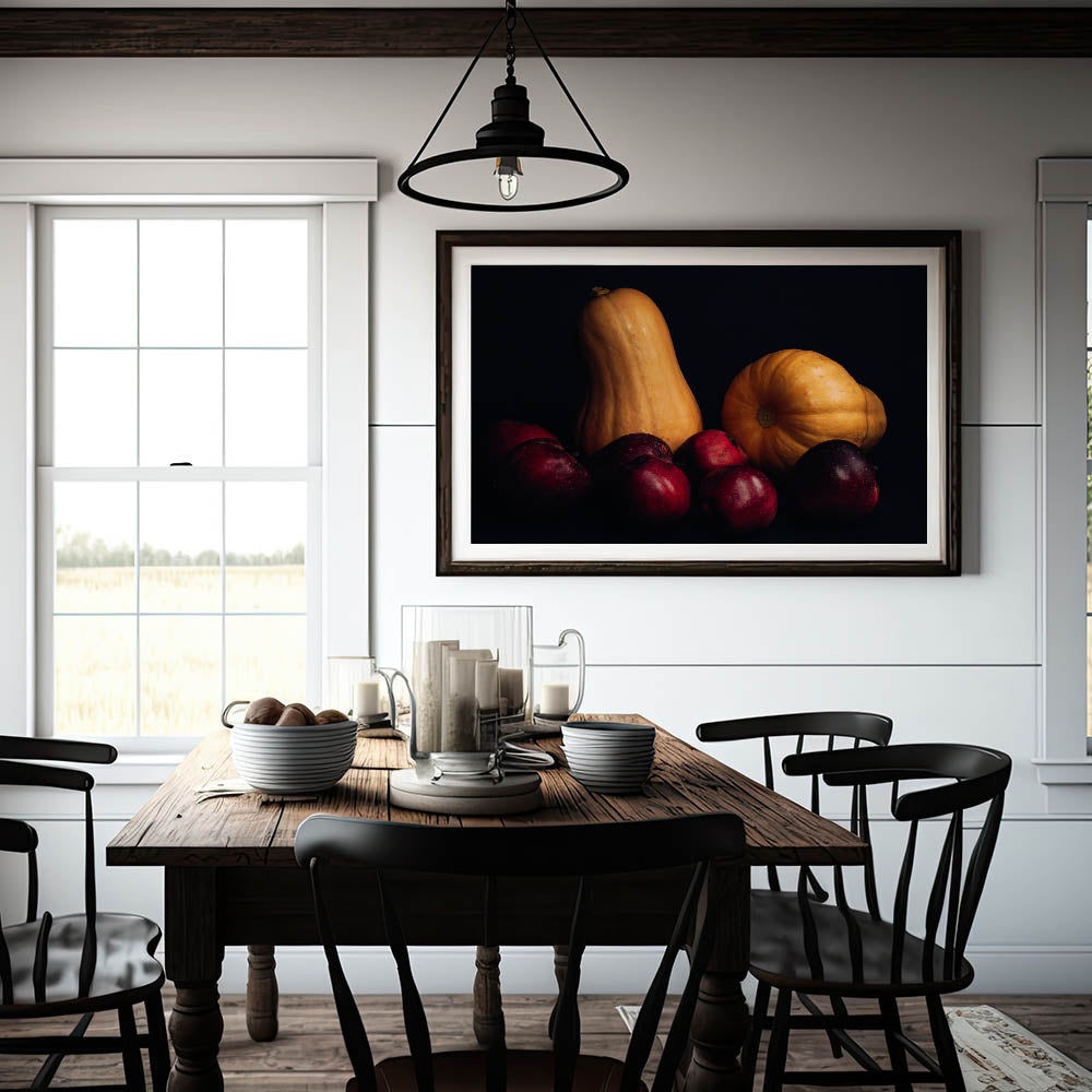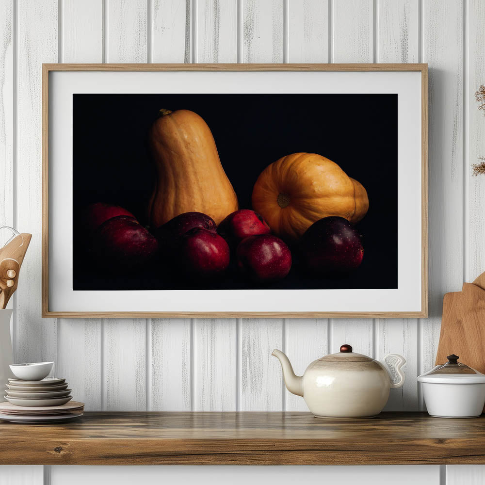 Add a touch of rustic charm to your kitchen with this stunning still life artwork, featuring deep red apples and golden butternut squash against a rich, dark background. The warm, autumnal hues and soft lighting create an elegant and cozy atmosphere, making it an ideal addition to your kitchen decor.