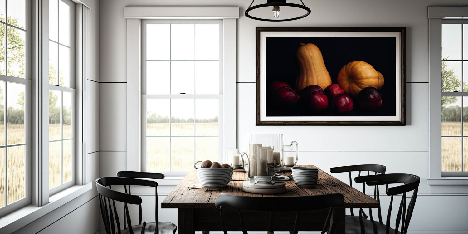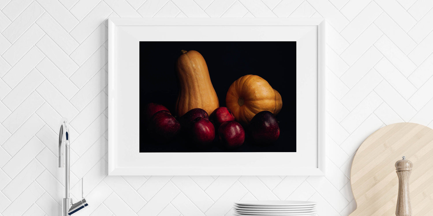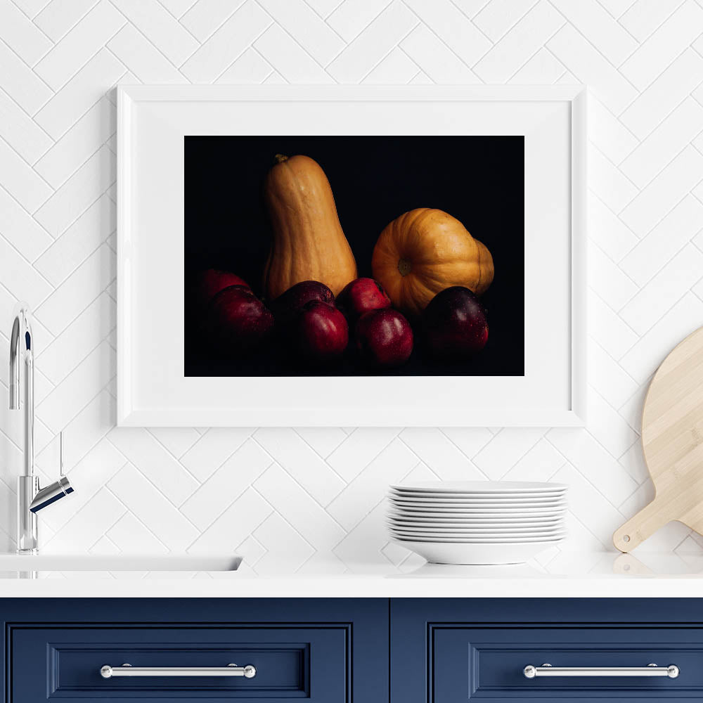 Add a touch of rustic charm to your kitchen with this stunning still life artwork, featuring deep red apples and golden butternut squash against a rich, dark background. The warm, autumnal hues and soft lighting create an elegant and cozy atmosphere, making it an ideal addition to your kitchen decor.