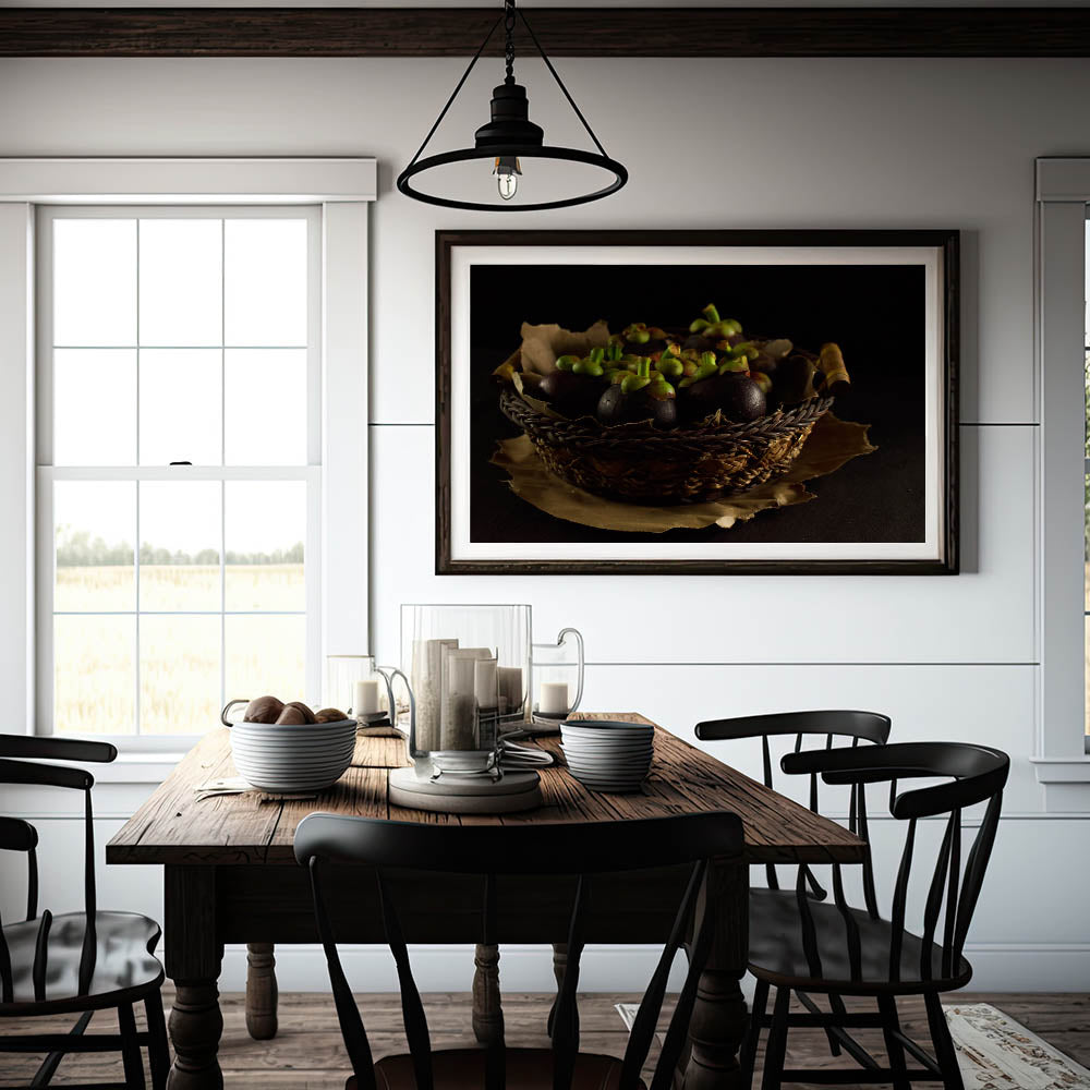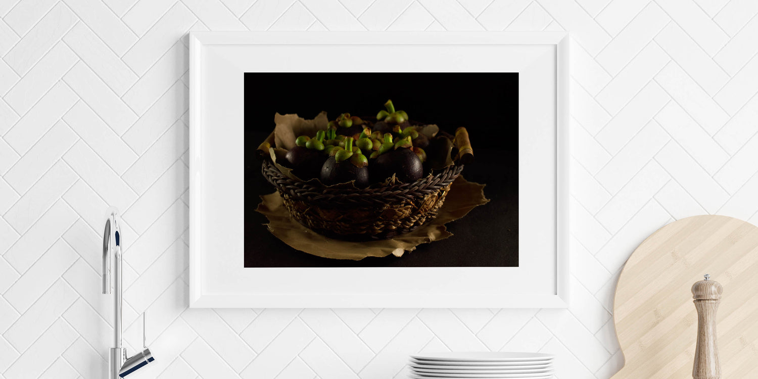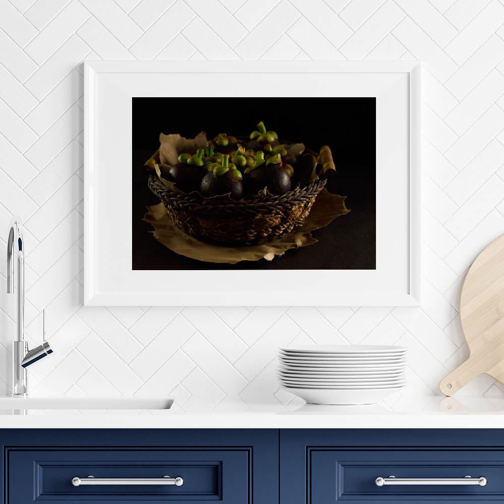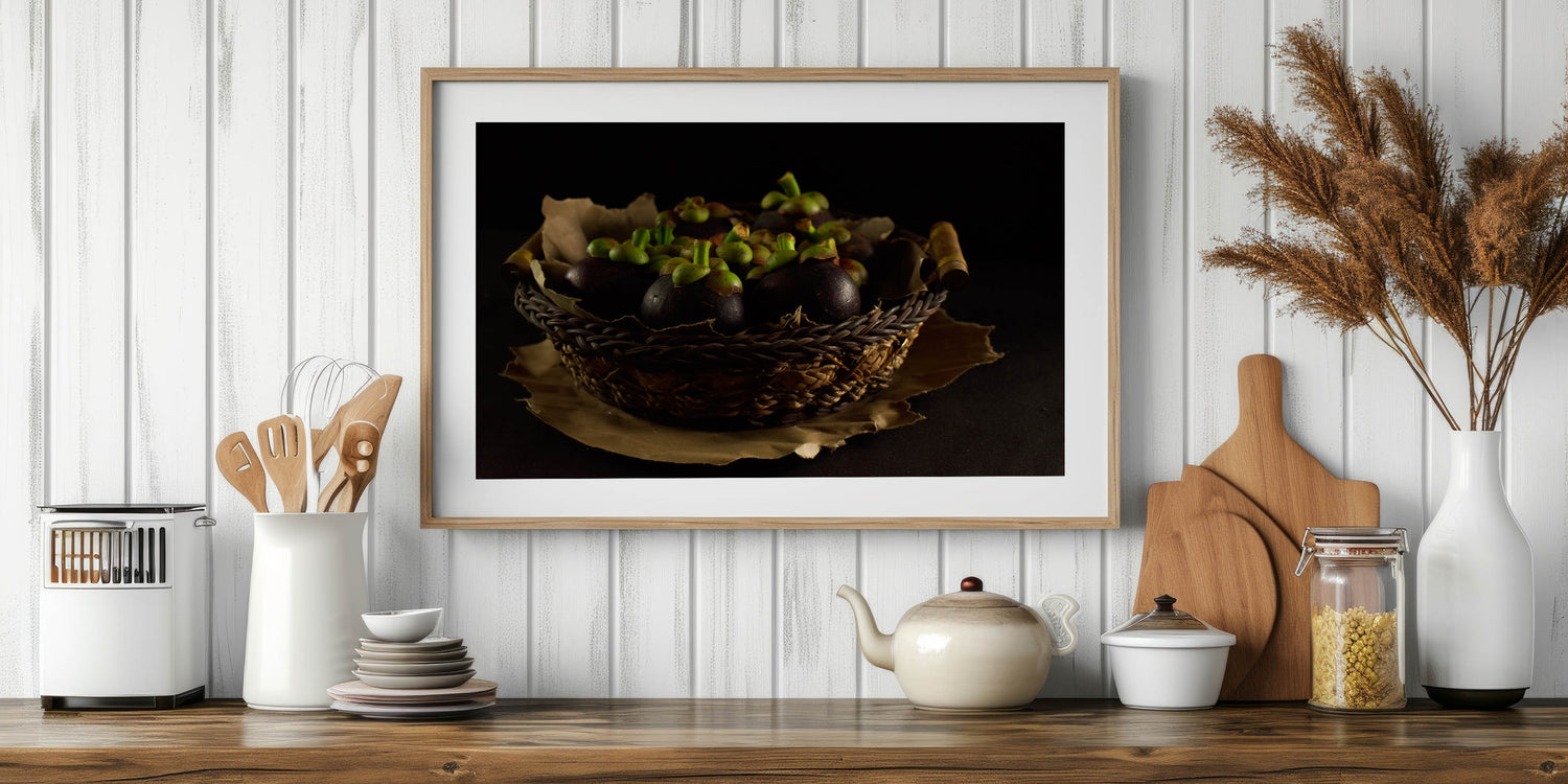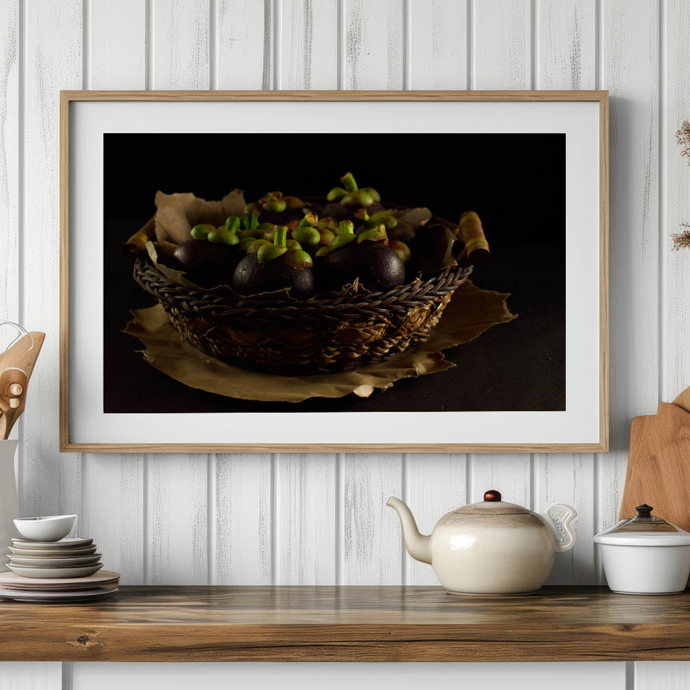 Bring a touch of rustic elegance to your kitchen with this beautifully arranged mangosteen basket still life. Featuring deep purple mangosteens with fresh green stems in a woven wicker basket, this artwork highlights the beauty of organic textures and earthy tones. The moody dark background enhances the rich colors, making this a striking centerpiece for any vintage or farmhouse kitchen decor.