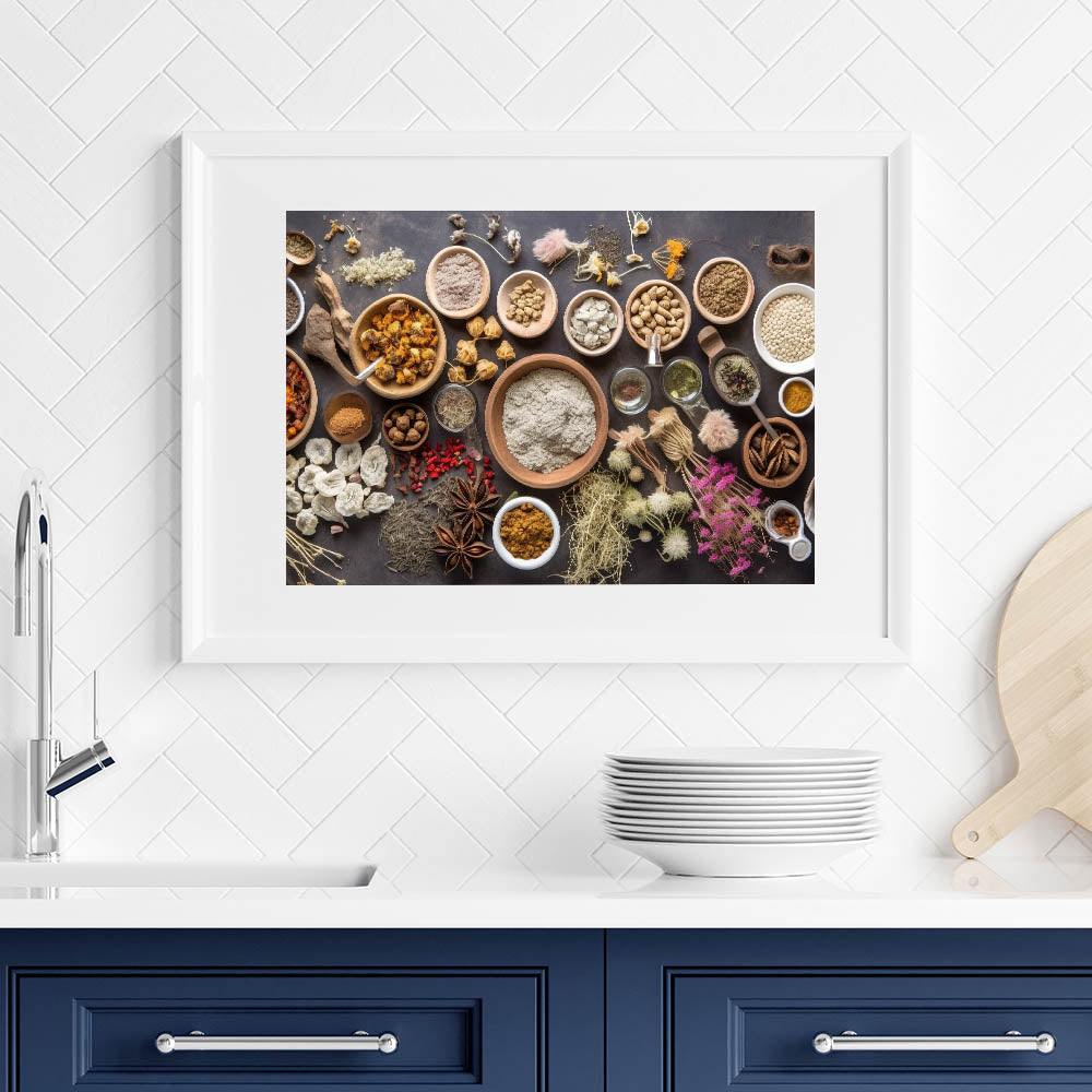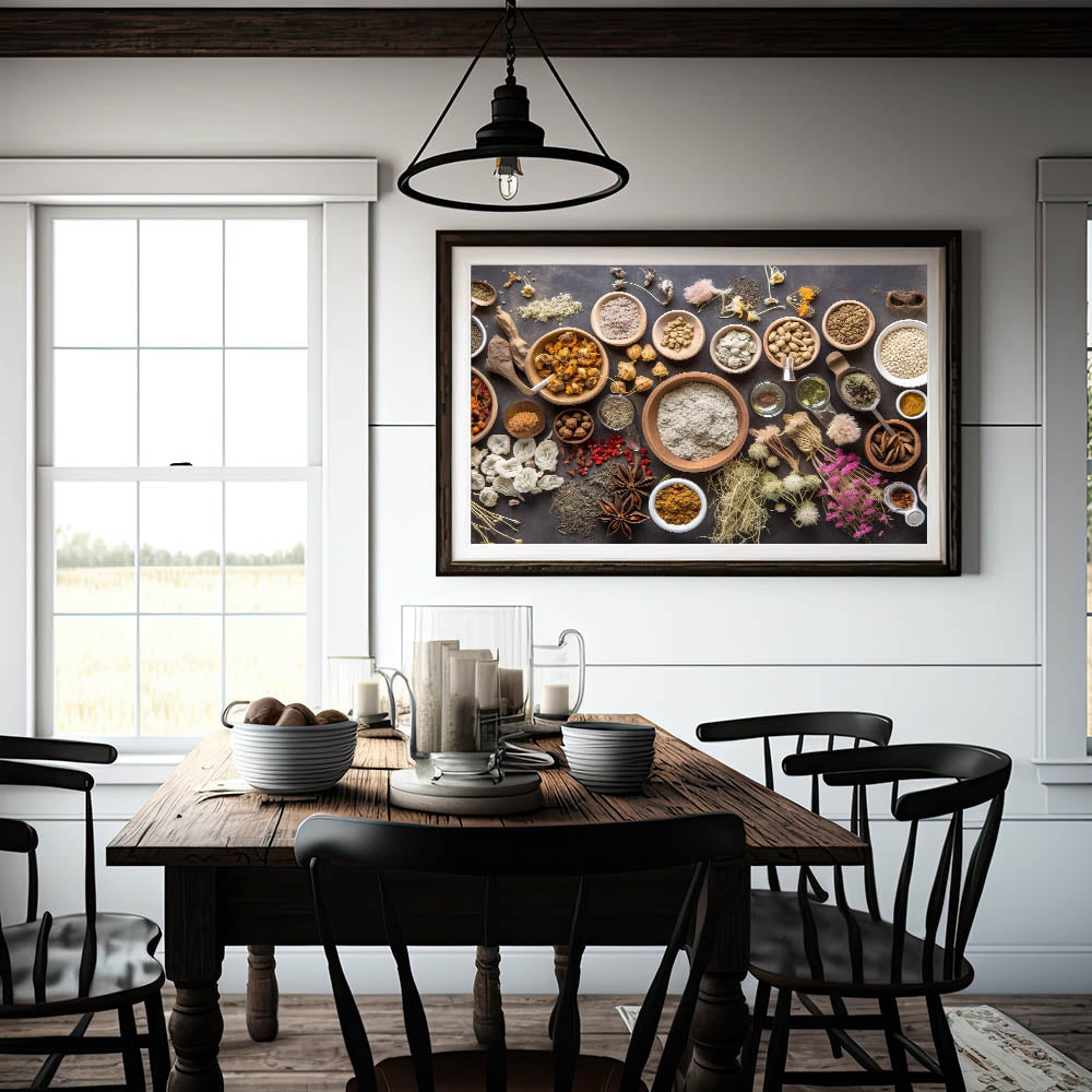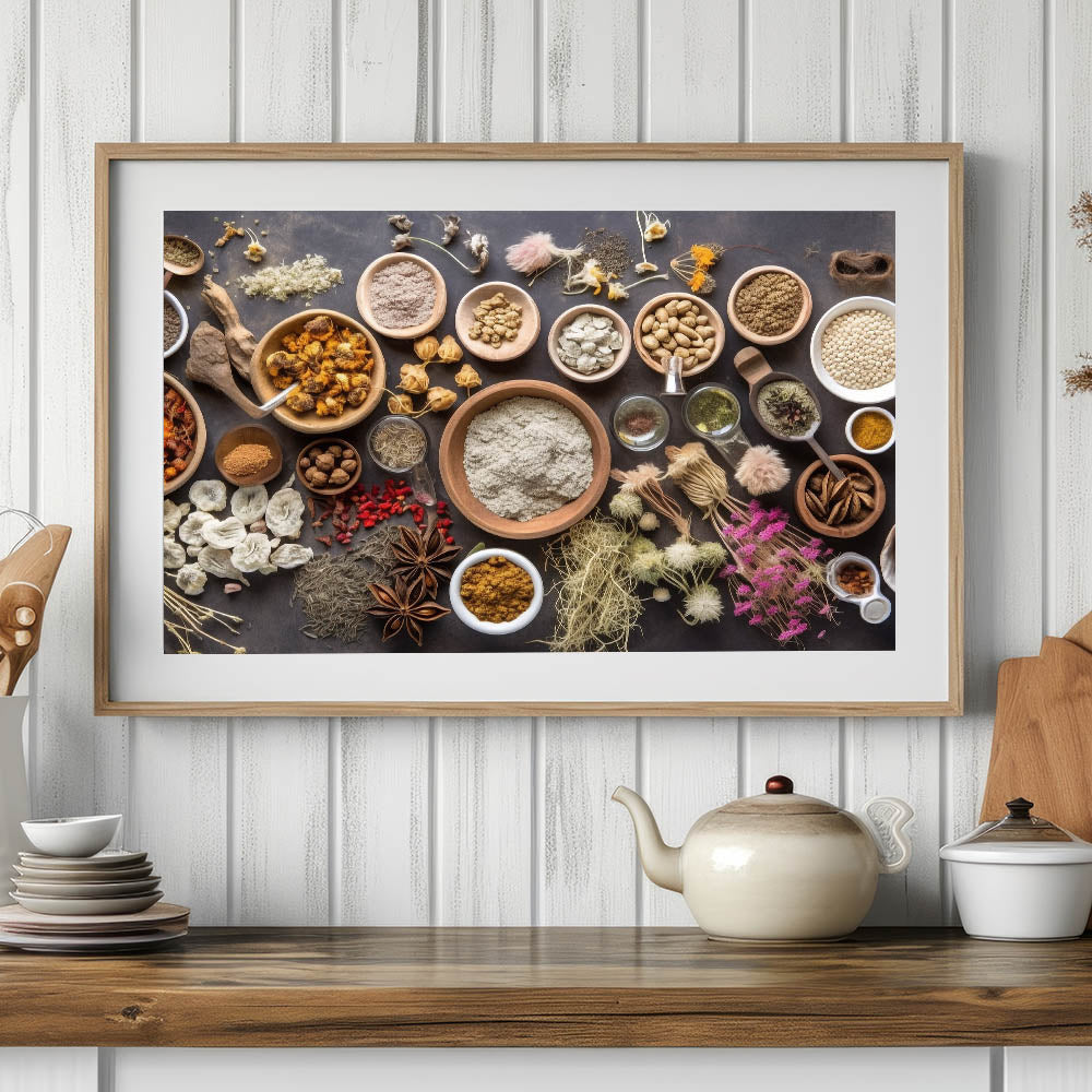 Enhance your kitchen wall decor with this modern kitchen art, featuring a beautifully arranged selection of herbs, spices, dried botanicals, and grains. The earthy tones, natural textures, and rustic wooden bowls create a warm and inviting atmosphere, making it perfect for chefs, home cooks, and food lovers who appreciate the beauty of culinary elements.