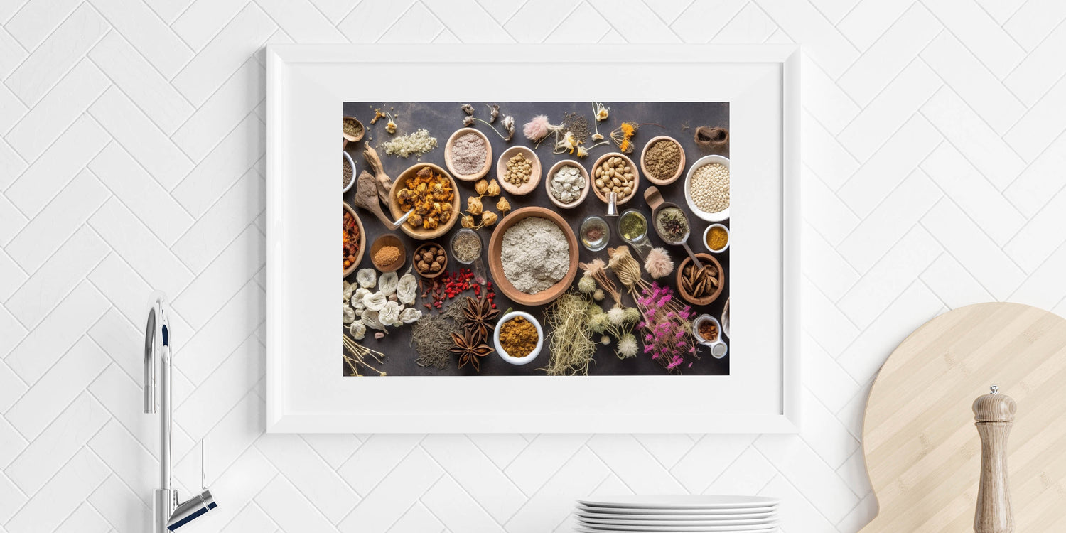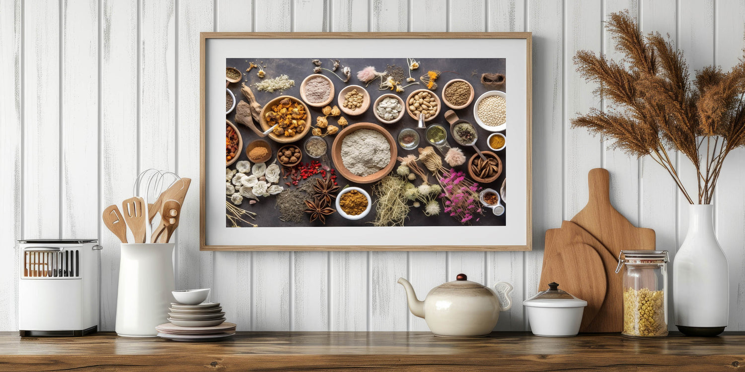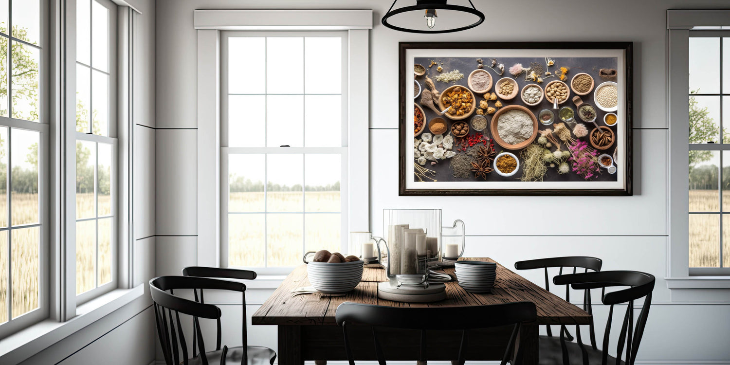 Enhance your kitchen wall decor with this modern kitchen art, featuring a beautifully arranged selection of herbs, spices, dried botanicals, and grains. The earthy tones, natural textures, and rustic wooden bowls create a warm and inviting atmosphere, making it perfect for chefs, home cooks, and food lovers who appreciate the beauty of culinary elements.