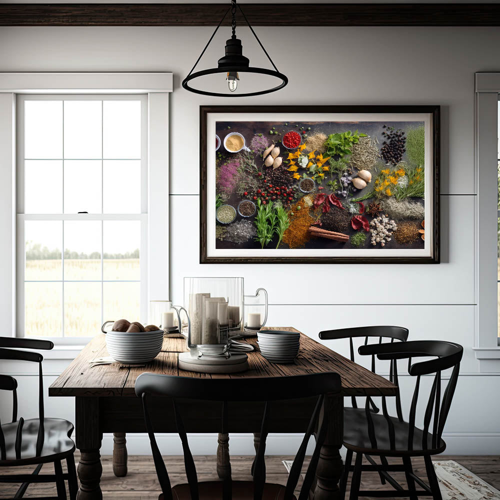 Transform your kitchen wall decor with this captivating modern kitchen art featuring a stunning array of fresh and dried herbs, vibrant spices, and natural seasonings. This kitchen artwork beautifully captures the essence of culinary creativity, making it a must-have for food lovers, home chefs, and those who appreciate organic aesthetics. The rich earthy tones, deep greens, fiery reds, and golden hues create a warm and inviting ambiance, perfect for kitchens, dining rooms, and food-themed spaces.