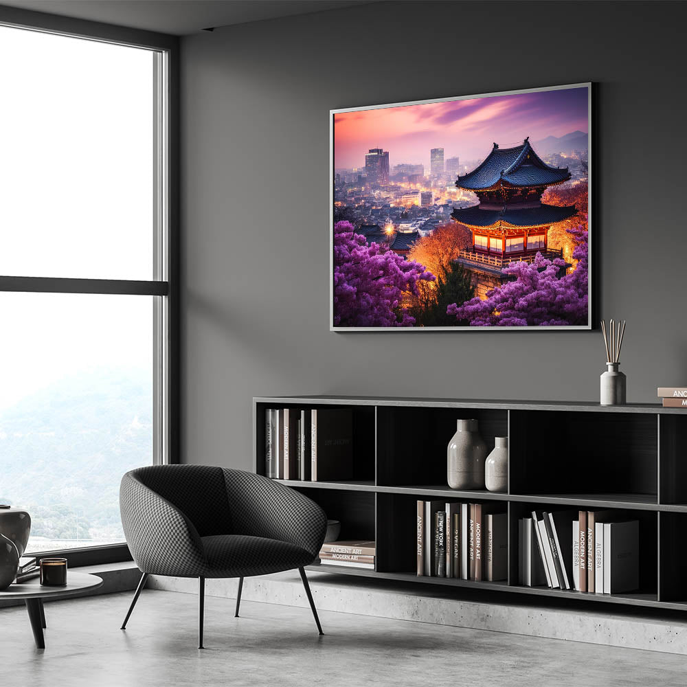 This stunning wall art captures the perfect blend of traditional Korean architecture and the vibrant energy of a modern cityscape. The foreground features beautiful cherry blossoms in full bloom, their bright pink petals creating a vivid contrast against the glowing city lights in the distance. The traditional Korean pagoda, nestled among the trees, stands as a symbol of cultural heritage amidst a bustling urban landscape. This artwork brings the essence of Korea's past and present into any space.