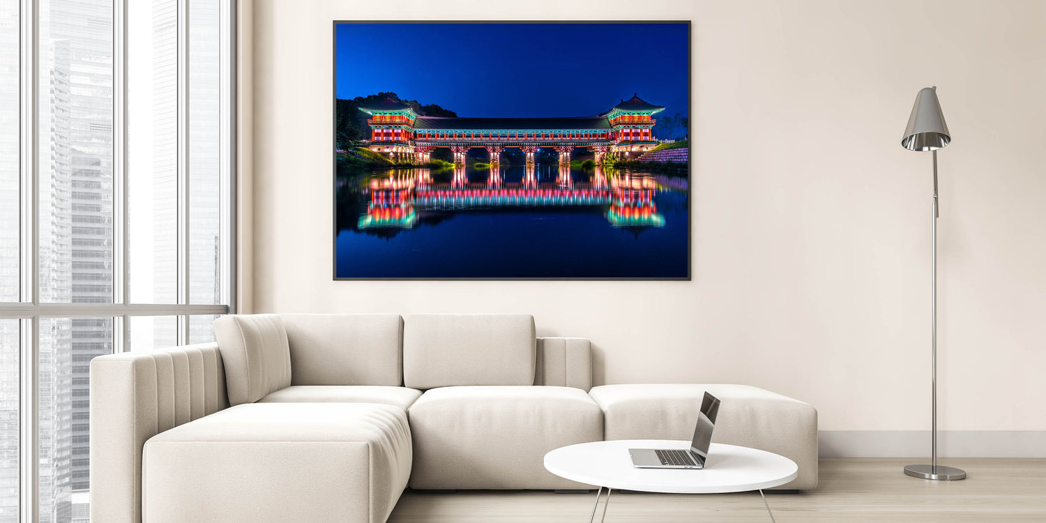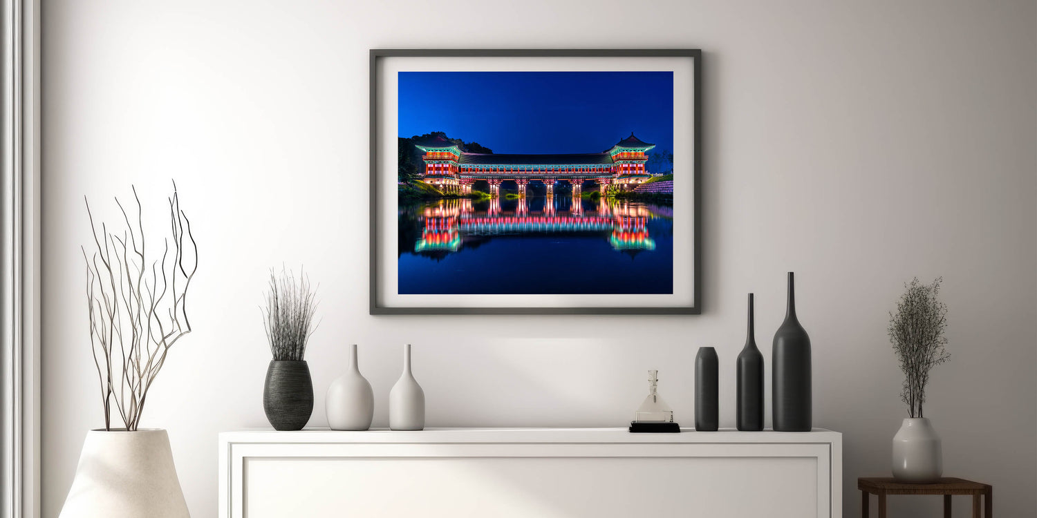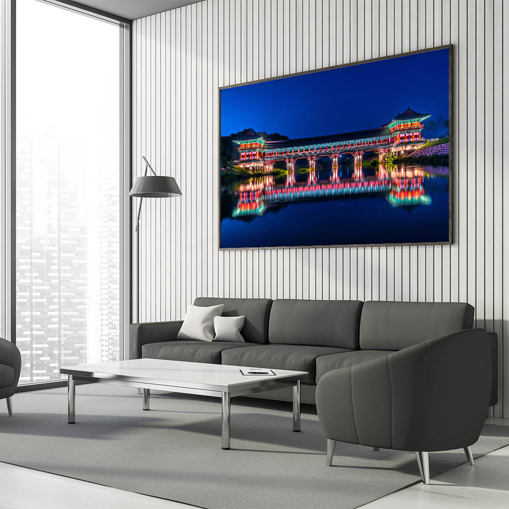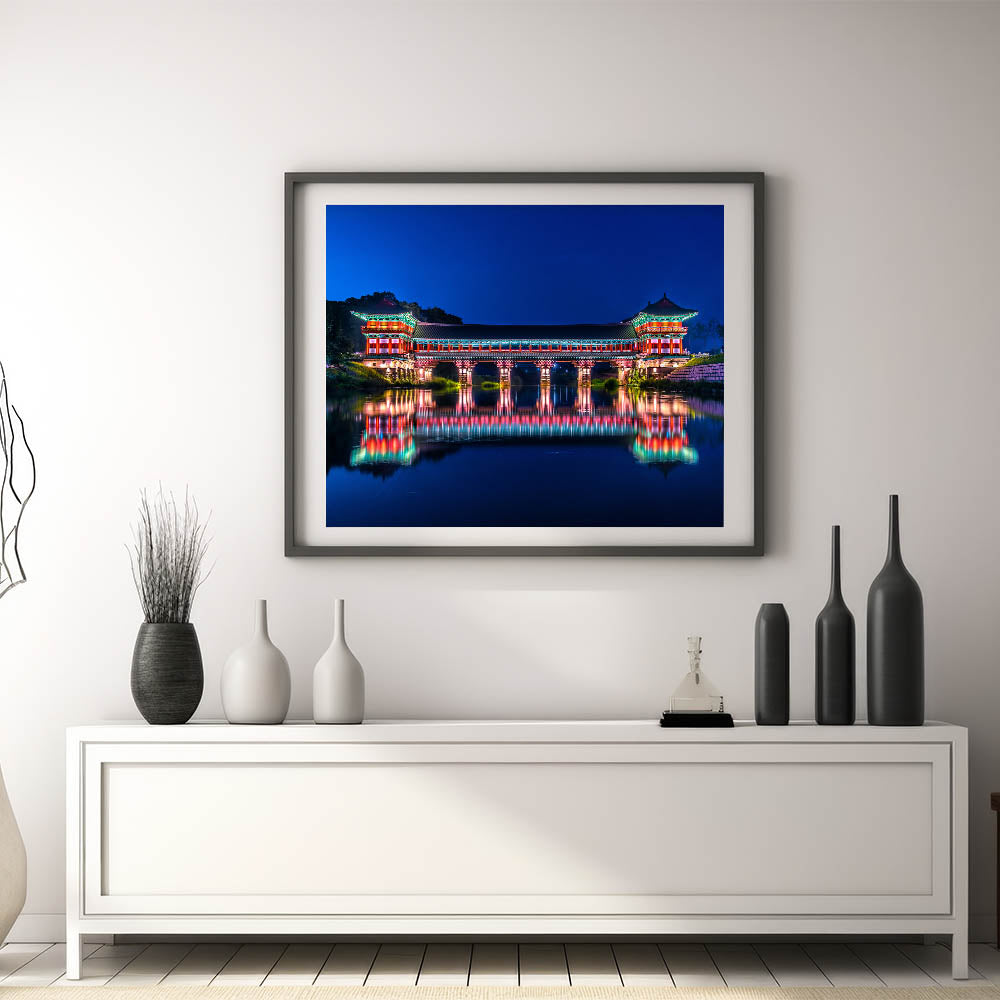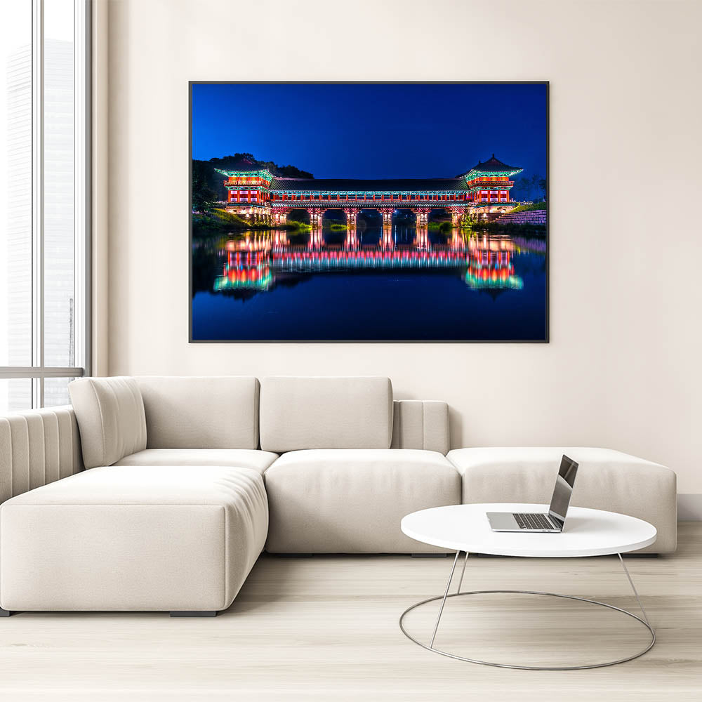 This striking Korean wall art features a beautifully illuminated traditional bridge reflected on calm waters under a serene night sky. The vibrant colors and intricate details of the bridge's architecture come to life, creating a mesmerizing visual experience that blends Korean heritage with modern lighting techniques. This artwork is perfect for enhancing the ambiance of any room, bringing a sense of peace and elegance to your space.
