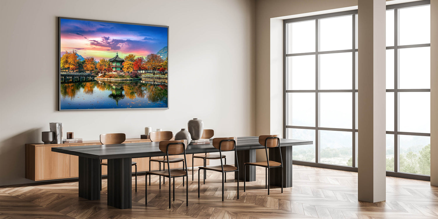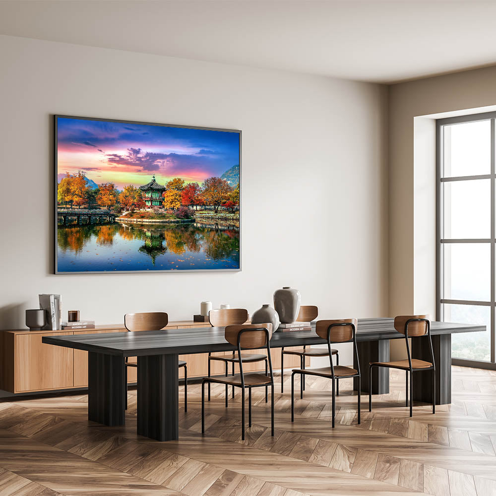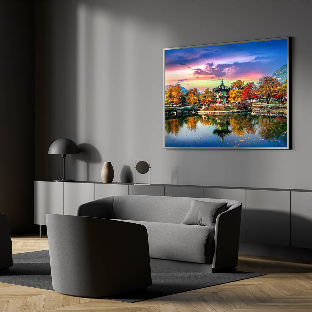 Celebrate the vibrant colors of autumn in Korea with this stunning wall art featuring a traditional pavilion reflected in a serene pond. The vivid fall foliage, combined with the tranquil water reflections, creates a captivating and peaceful scene that highlights the beauty of Korea’s natural and architectural heritage. The harmony between nature and structure makes this artwork ideal for adding warmth and elegance to your home or office decor.