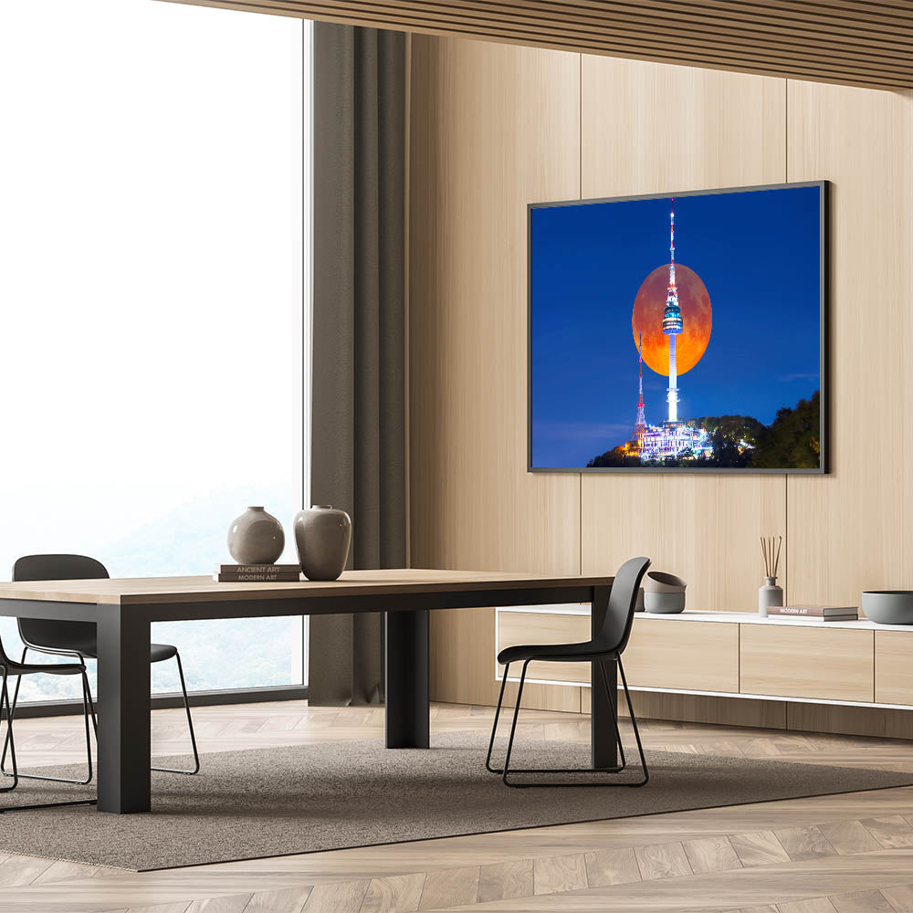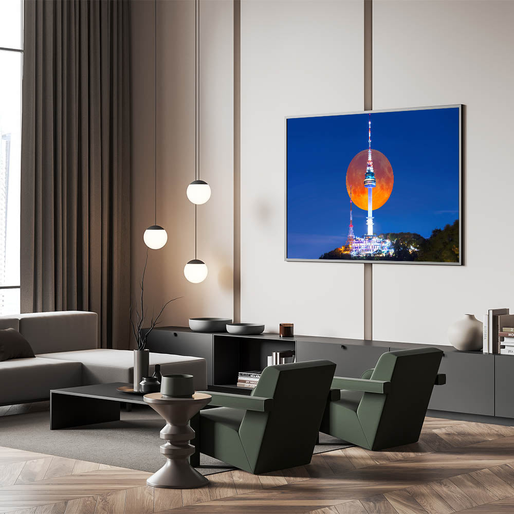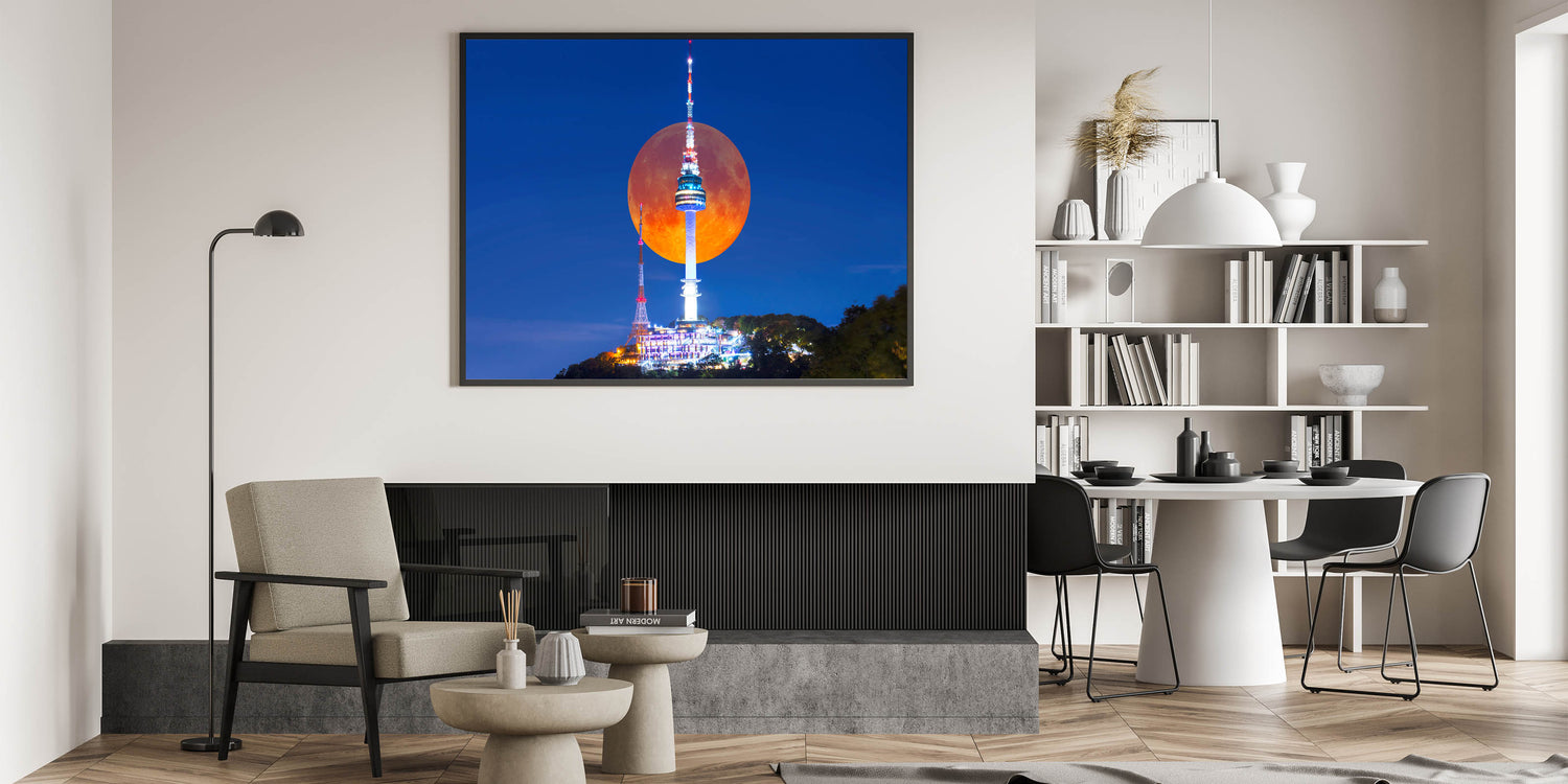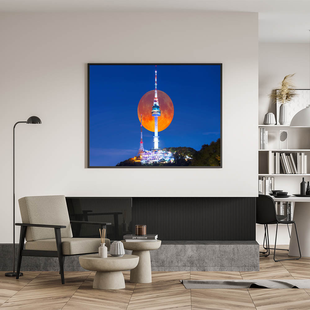 Add a striking piece of modern Korean art to your collection with this stunning depiction of Seoul Tower illuminated by a vivid full moon. The brilliant contrast of the brightly lit tower and the vibrant orange moon makes this artwork a perfect centerpiece for contemporary decor. The iconic Namsan Seoul Tower, standing tall against the deep blue night sky, symbolizes the fusion of modernity and tradition, a hallmark of South Korea’s dynamic cultural landscape.