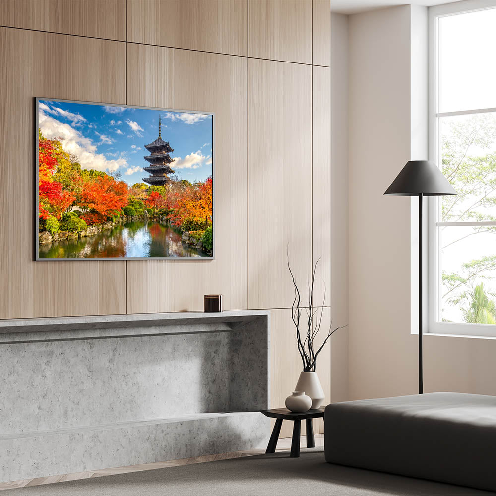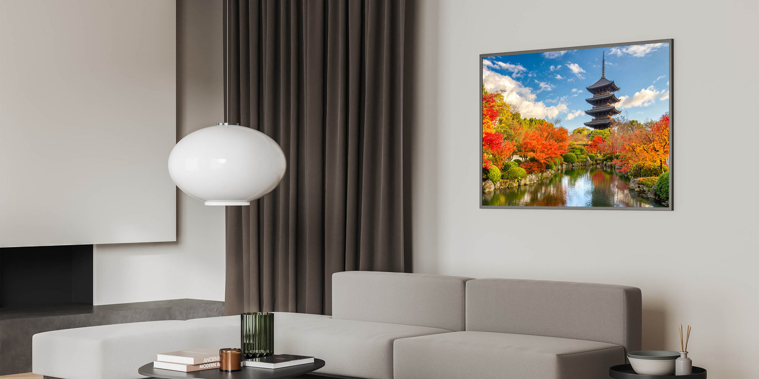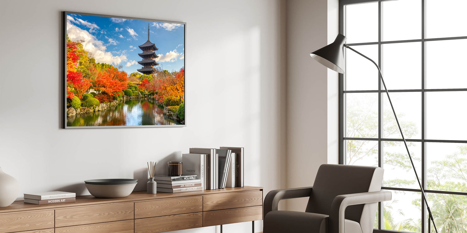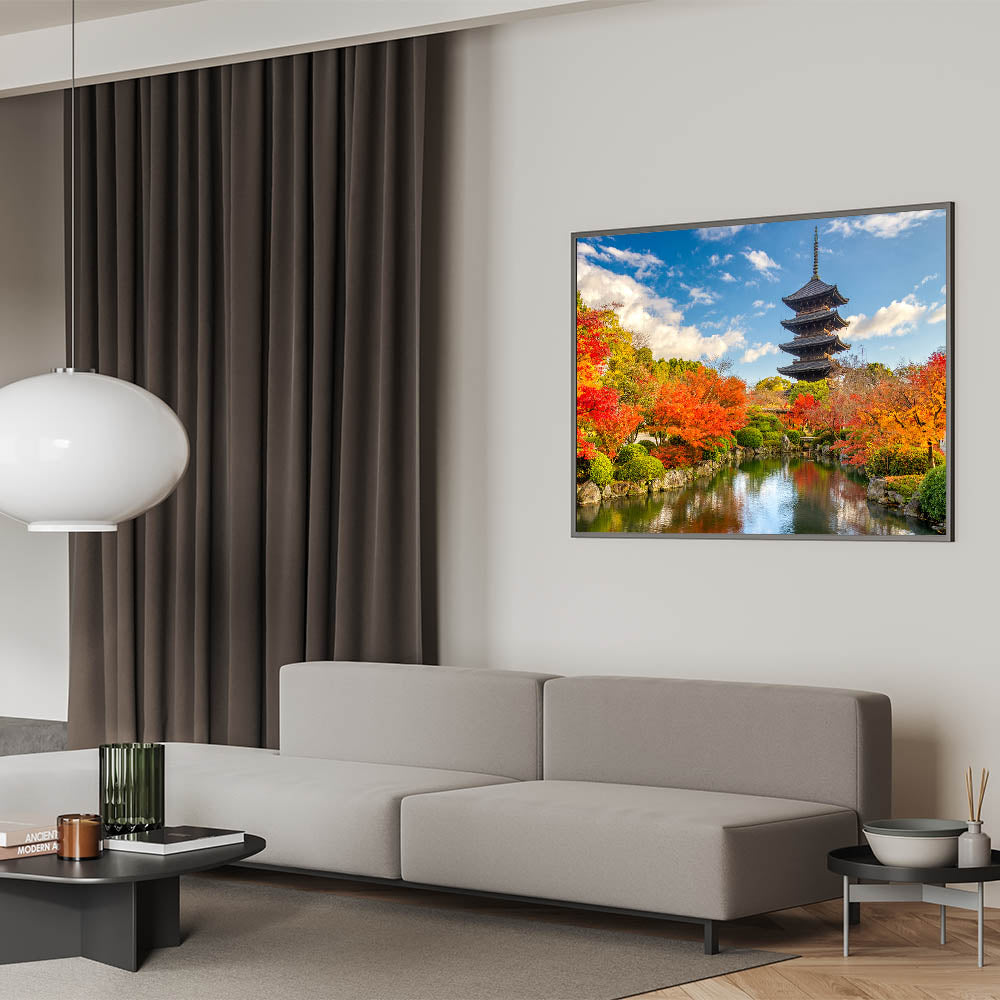 This Kyoto autumn landscape print beautifully captures the harmonious balance between architecture and nature, making it a perfect piece for anyone looking to bring a touch of Japanese serenity into their home or office.