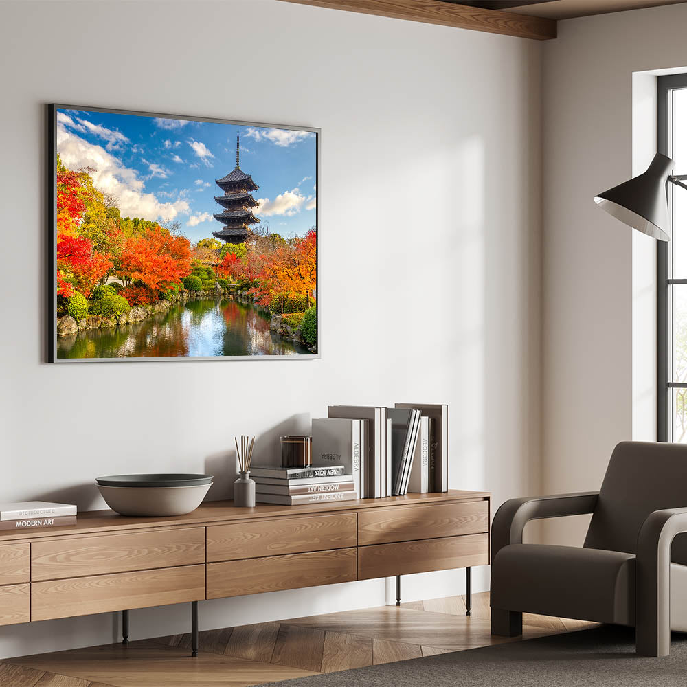 Celebrate Kyoto’s Autumn Beauty This captivating Kyoto wall art showcases a traditional pagoda surrounded by vibrant autumn foliage, with the stunning reflections in the tranquil pond enhancing the scene's serenity. The rich reds, oranges, and greens of the trees create a colorful and calming atmosphere, making this artwork a perfect addition to any space. The intricate architecture of the pagoda adds a sense of history and culture, balancing the natural beauty of the landscape.