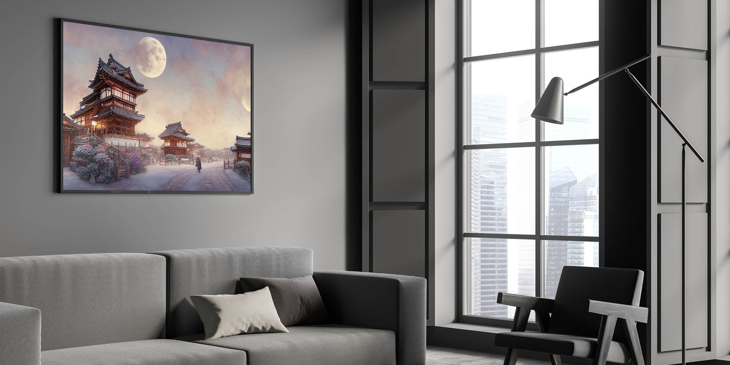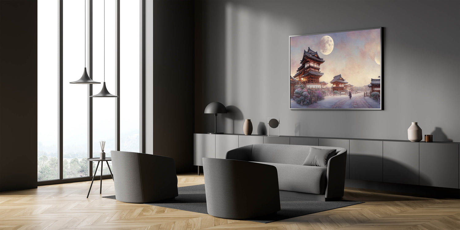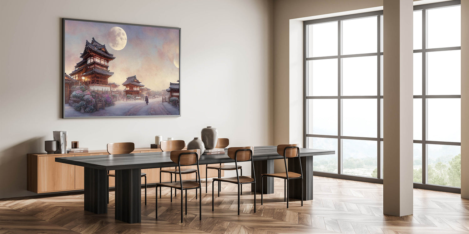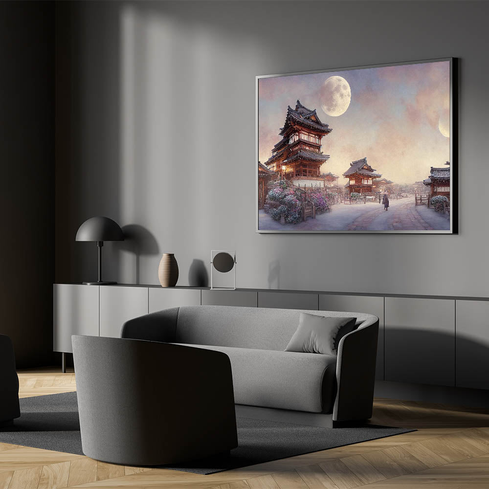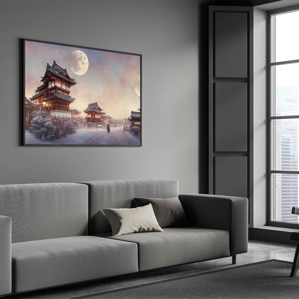 This Kyoto moonlit village print brings a sense of quiet elegance and magic to any room, celebrating the beauty of Japanese architecture and the serene charm of moonlit nights.