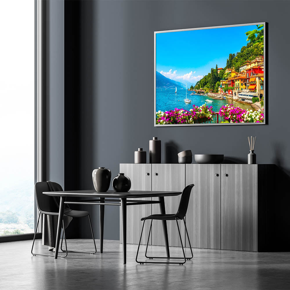 Brighten your space with the lively charm of this beautiful Lake Como wall art, showcasing a colorful Italian village nestled along the edge of the lake. The vivid colors of the homes, flowers, and greenery contrast beautifully with the sparkling blue waters of the lake, creating a joyful and inviting atmosphere. This artwork is perfect for anyone looking to add a vibrant touch to their home or office décor while evoking the serene beauty of Italy's most famous lakeside scenery.