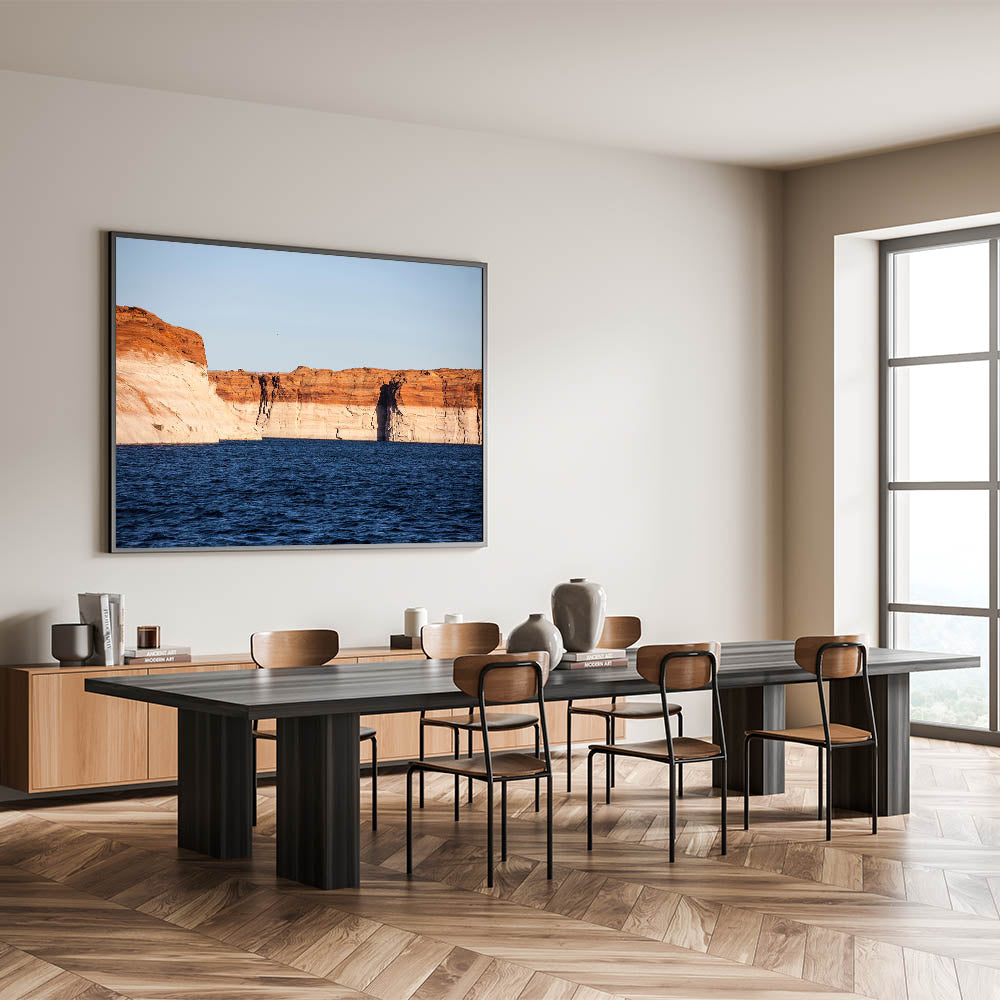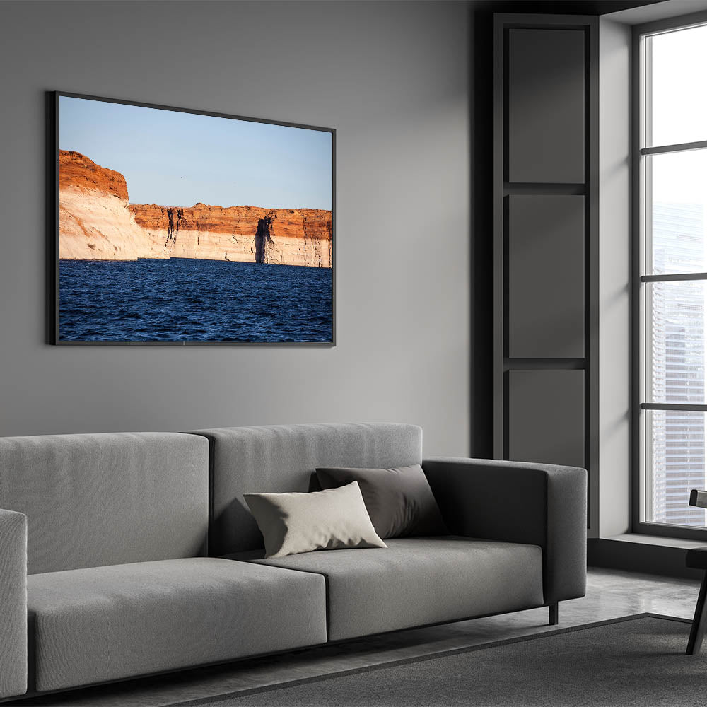 Capture the rugged beauty of Lake Powell's stunning landscapes with this dramatic wall art, featuring the striking red and white cliffs reflected against the deep blue waters. This Lake Powell canvas art is perfect for adding a bold statement to your decor, while also evoking the serene atmosphere of one of Arizona’s most breathtaking natural wonders. Whether you’re looking to decorate your home, office, or gallery space, this piece brings the stunning Lake Powell views to life.