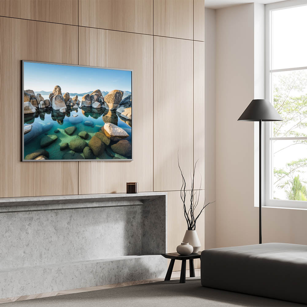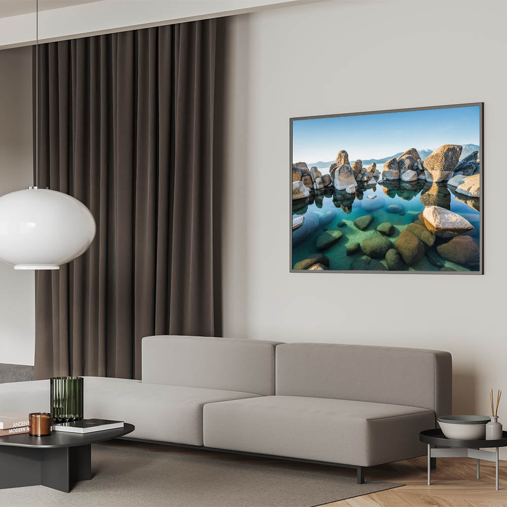 This beautiful artwork showcases the crystal-clear waters of Lake Tahoe, where the reflection of large boulders creates a captivating and serene scene. The vivid blues and greens of the water, combined with the natural tones of the rocks, make this piece a perfect addition to any space. Available in stretched canvas, framed prints, and acrylic glass, this Lake Tahoe landscape art brings a sense of tranquility and natural beauty to your home decor.