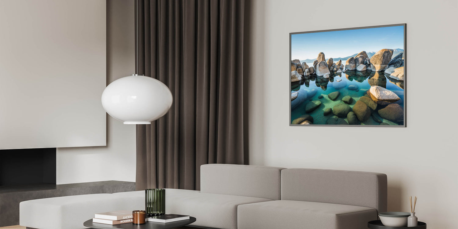 Transform your home or office with this serene Lake Tahoe landscape from our art collection. Its calm waters and natural tones will add a sense of peace and elegance to any space.