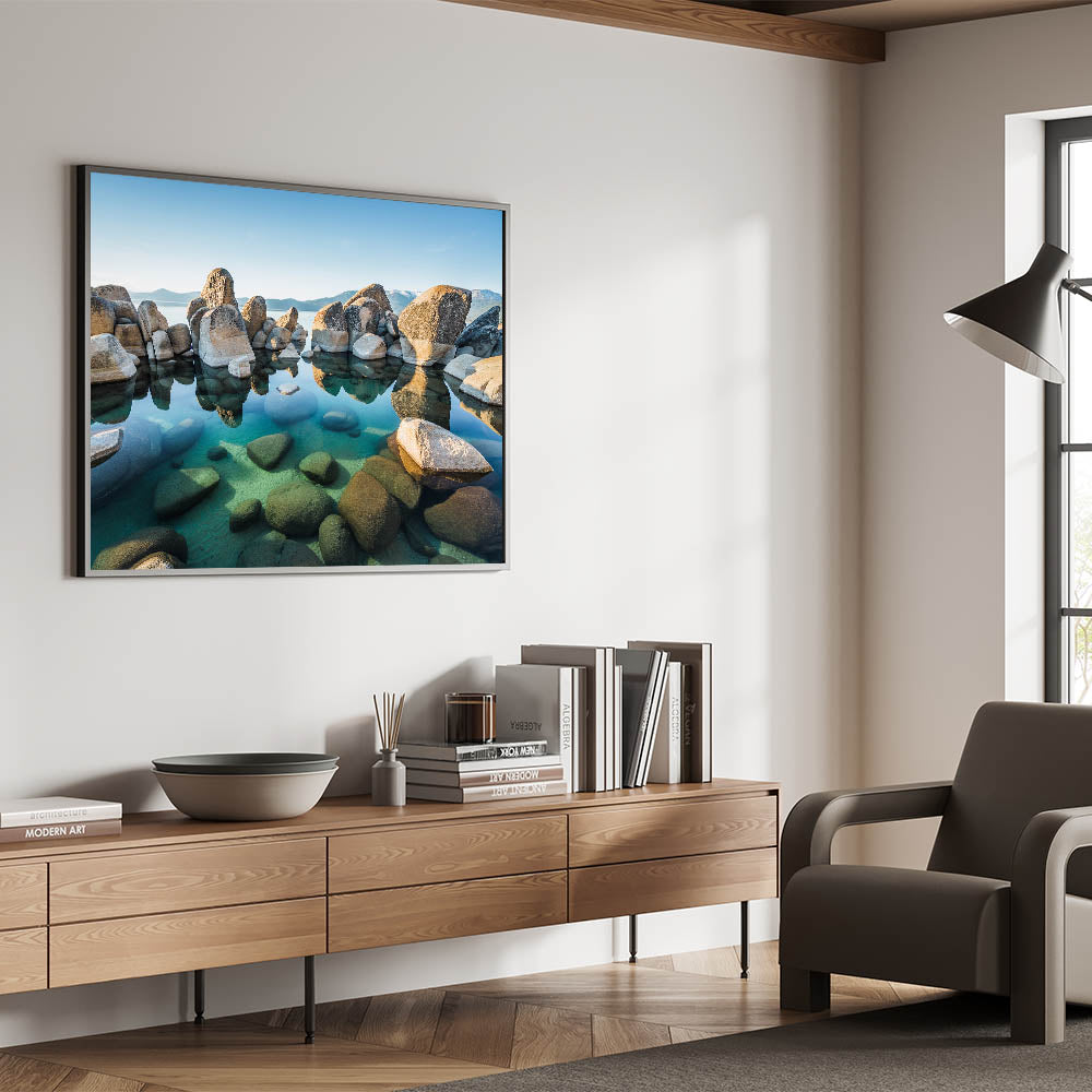 - Captivating Reflection Scene: Stunning Lake Tahoe print featuring clear waters, reflecting large boulders in vivid detail.