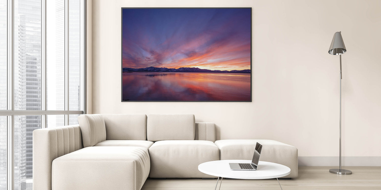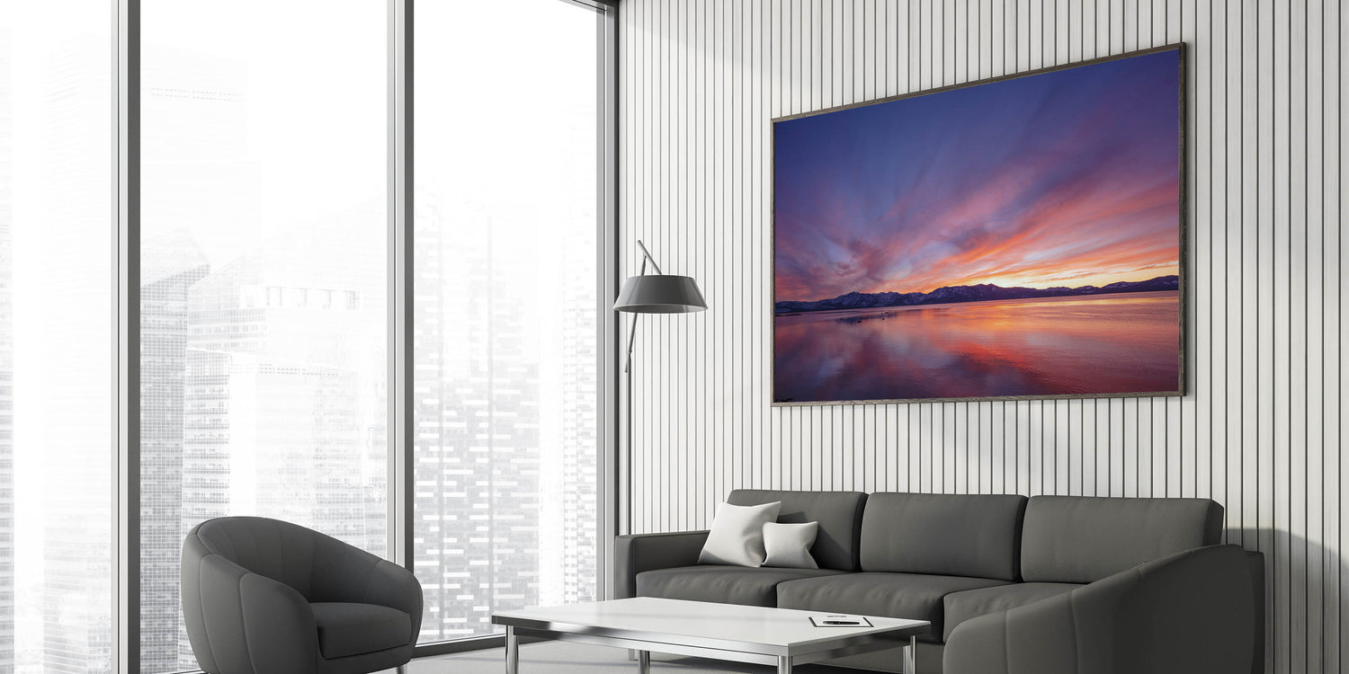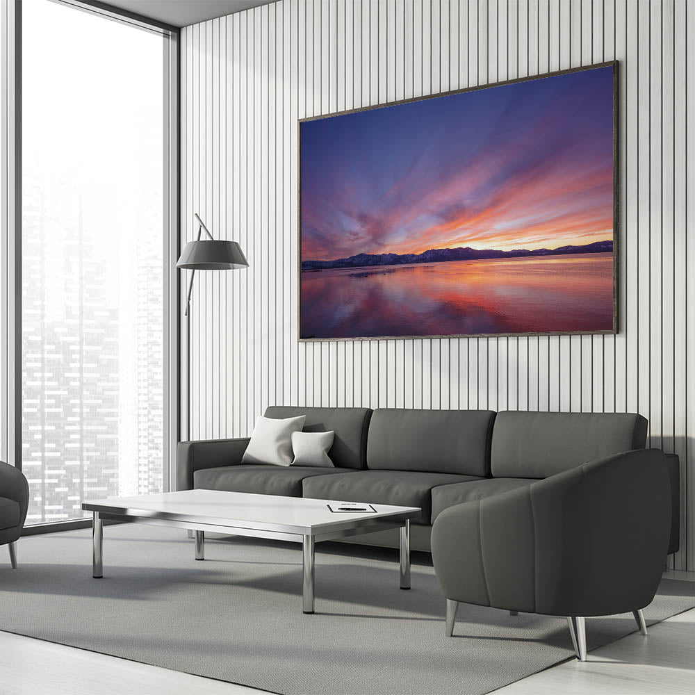 Bring the peaceful beauty of Lake Tahoe into your home or office with this vibrant sunset scene from our Lake Tahoe art collection. Its stunning colors and serene reflections will transform any space into a calming retreat.