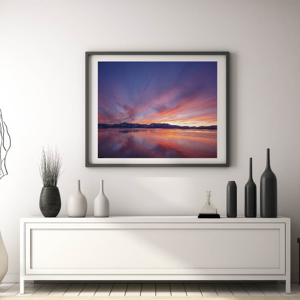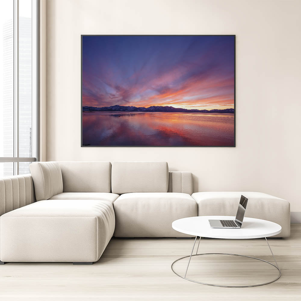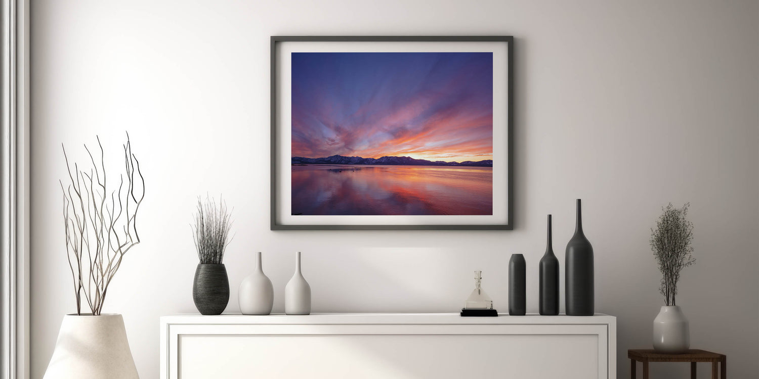 Bring the peaceful beauty of Lake Tahoe into your home or office with this vibrant sunset scene from our Lake Tahoe art collection. Its stunning colors and serene reflections will transform any space into a calming retreat.
