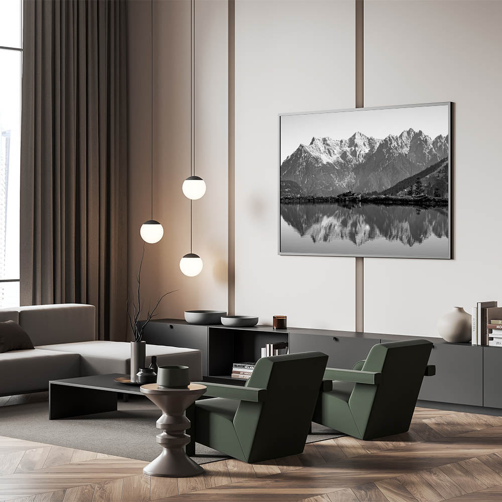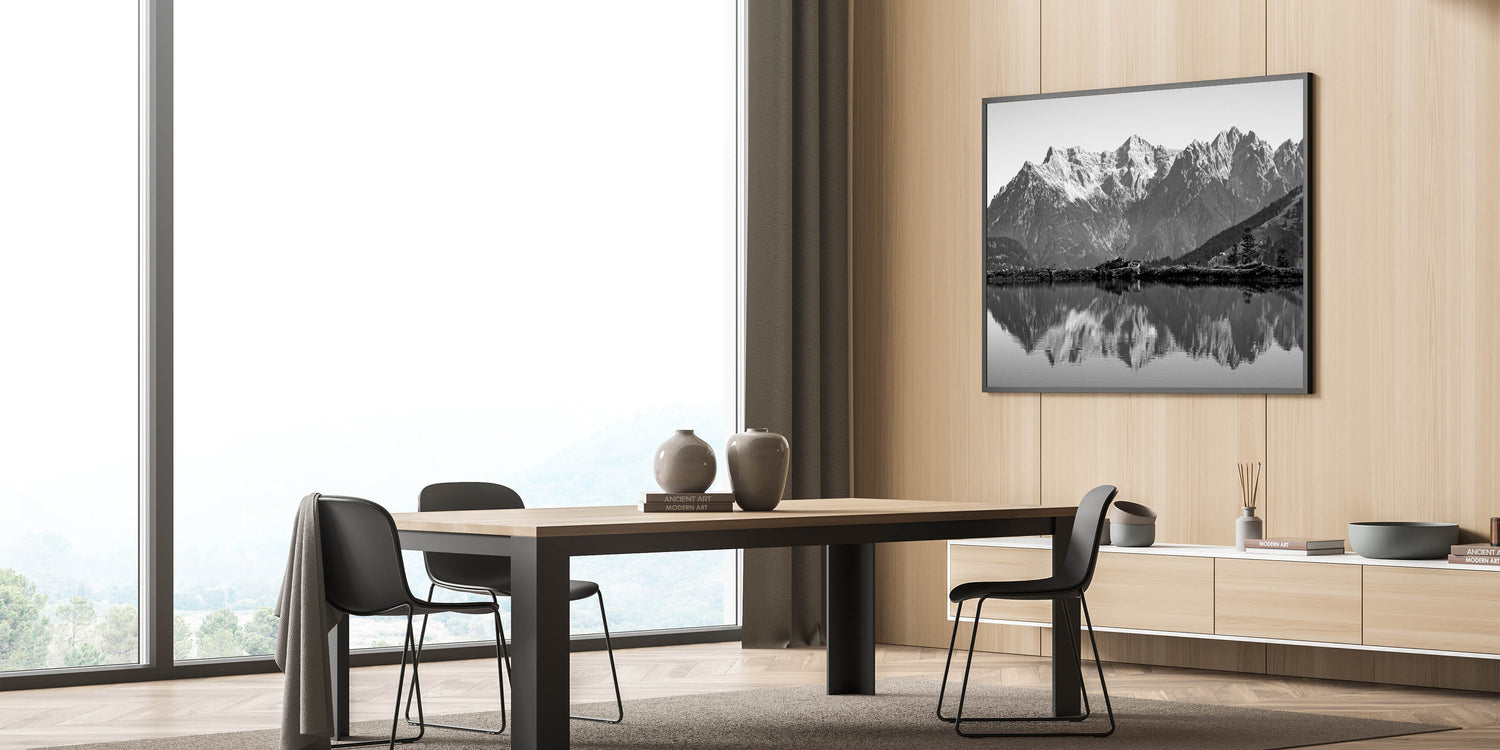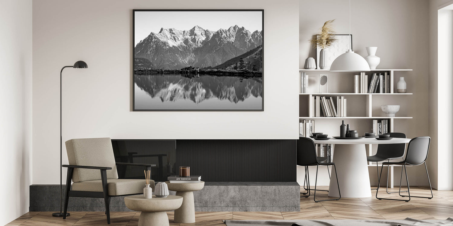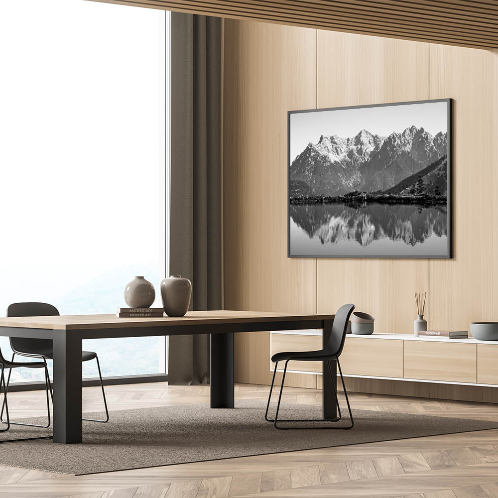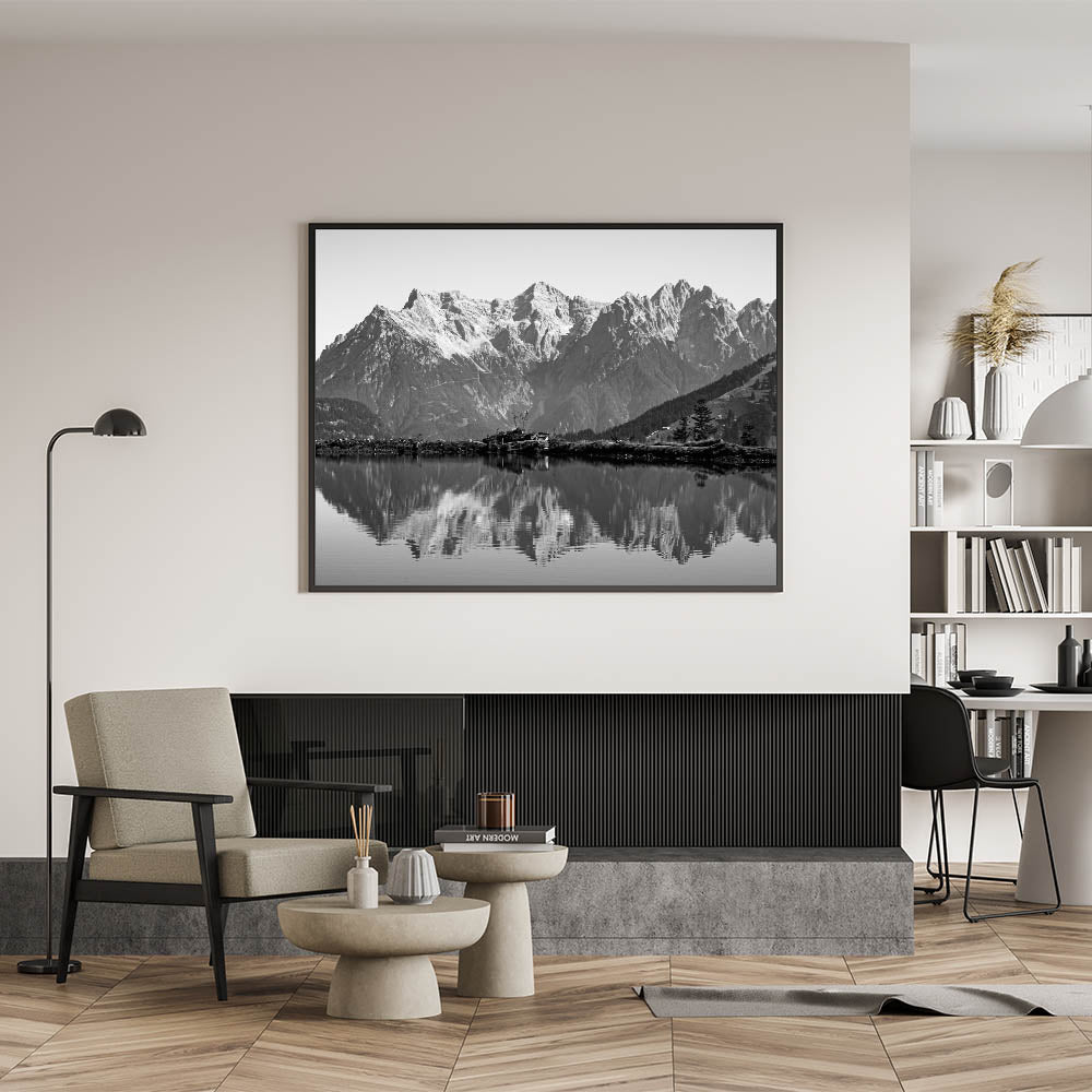 Experience the grandeur of nature with this Majestic Mountain Reflection wall art. Capturing a stunning black and white photograph of towering mountains perfectly mirrored in a tranquil lake, this piece is ideal for those who appreciate the beauty of rugged landscapes and serene waters. The monochromatic tones enhance the dramatic contrast between the towering peaks and their crystal-clear reflection, creating a visually striking piece of art.