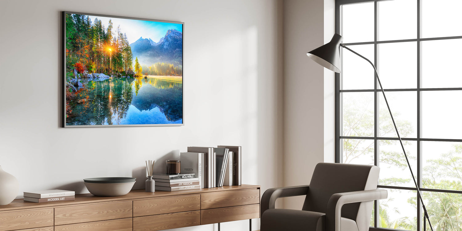 Add this Lakeview Art Print to your collection and let the brilliant sunrise and peaceful lake reflections fill your home with light and tranquility, transforming your space into a serene retreat.