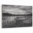 Embrace the nostalgic beauty of this Rustic Abandoned Boat Wall Art. Captured in stunning black and white, this artwork features an old wooden boat resting on the edge of a calm lake, surrounded by tall grass and a tranquil, cloud-filled sky. The monochrome tones lend a timeless, classic feel to the scene, making it a perfect piece for those who appreciate the charm of rustic, nature-inspired decor.