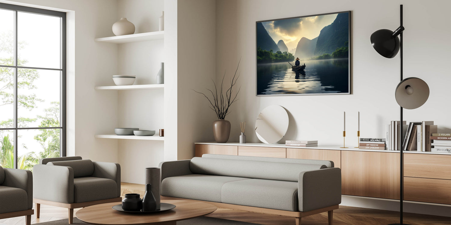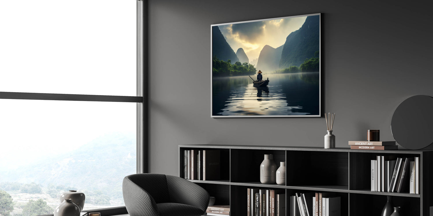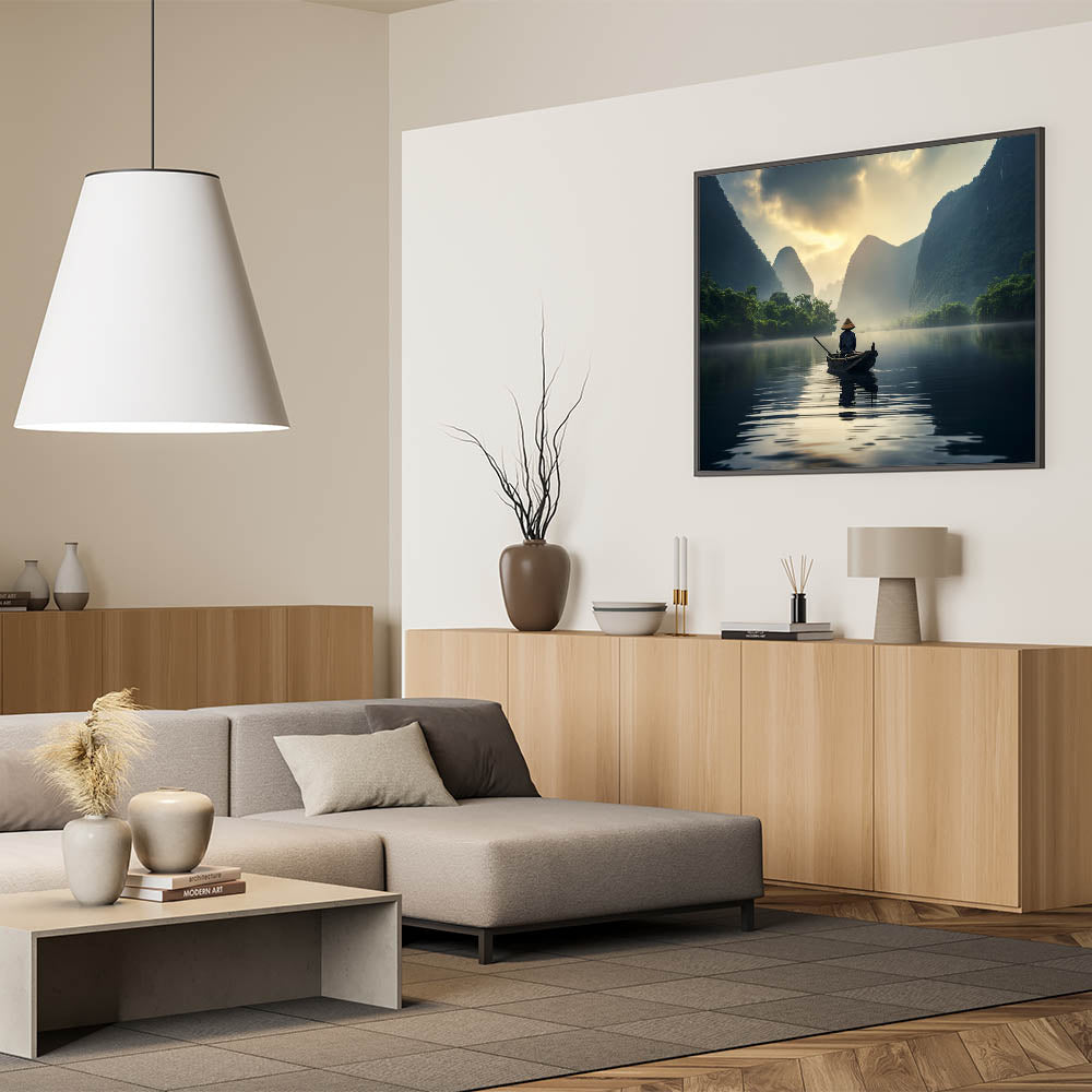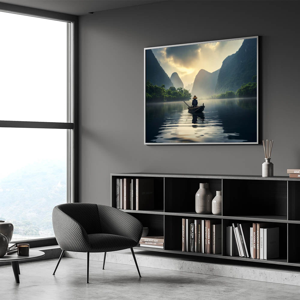 Enhance your space with the tranquil beauty of this stunning lake wall art, capturing the serene ambiance of misty mountains reflected in still waters. The image depicts a lone boatman drifting on a peaceful lake, surrounded by towering, lush green mountains enveloped in a soft morning mist. This artwork is perfect for bringing a sense of calm and serenity to any room.