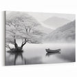 Embrace the elegance of simplicity with this tranquil black and white lake wall art. This minimalist artwork features a serene scene of a solitary tree and a small boat on a calm lake, all enveloped in a soft mist. The grayscale palette enhances the peaceful atmosphere, creating a timeless piece that brings a sense of calm and tranquility to any space. The balance between the delicate details and the open space in the composition invites the viewer to pause and reflect.
