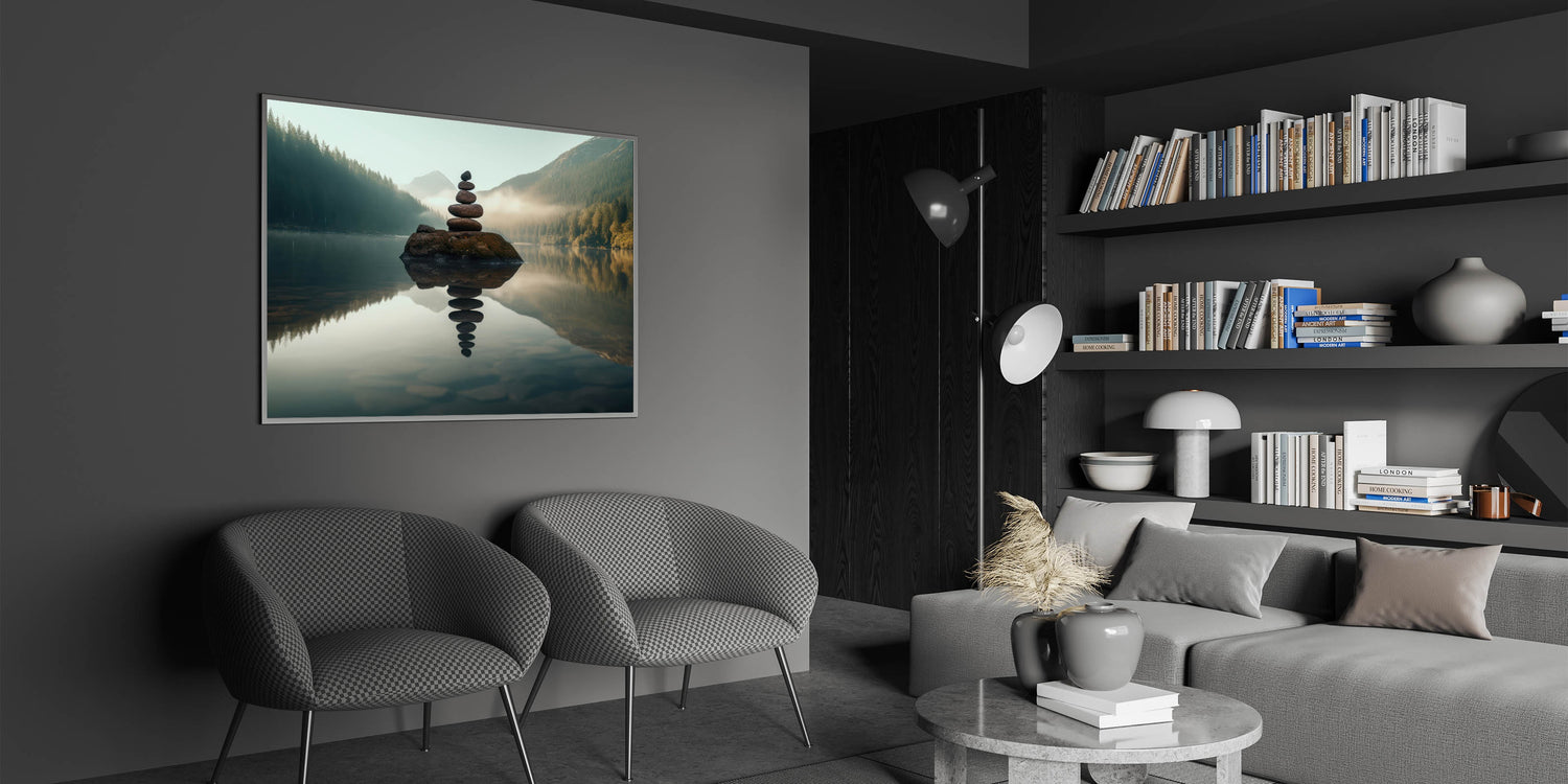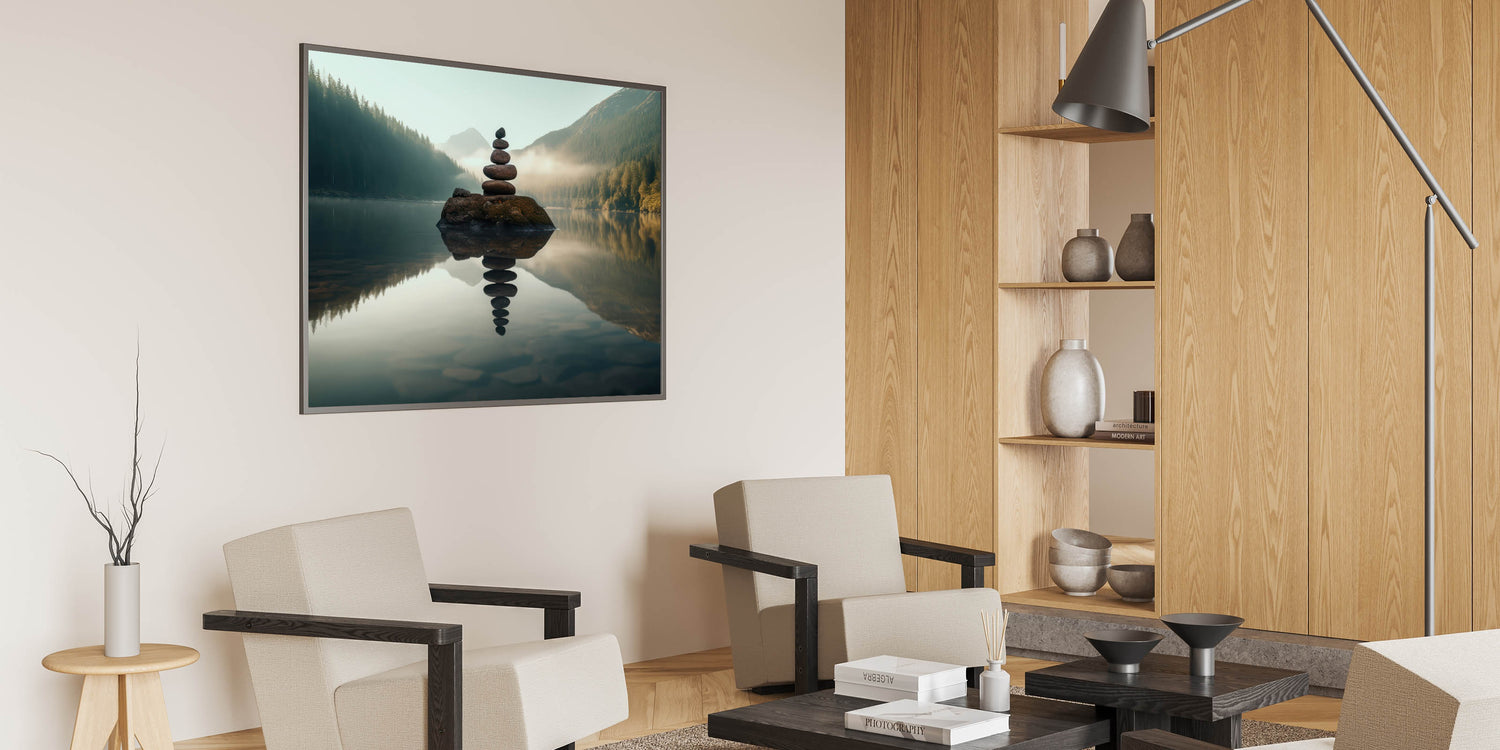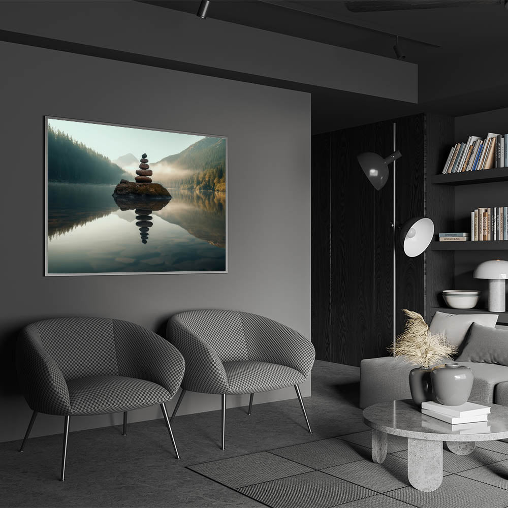 Bring a sense of balance and tranquility into your space with this stunning lake art print featuring a perfectly balanced stack of rocks on a serene lake. The calm water reflects the rock stack and surrounding forest, creating a mirror-like effect that adds depth and harmony to any room. This piece embodies the principles of Zen, making it an ideal addition for those seeking to create a peaceful, meditative environment in their home or office.
