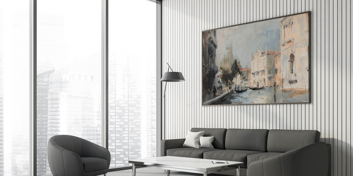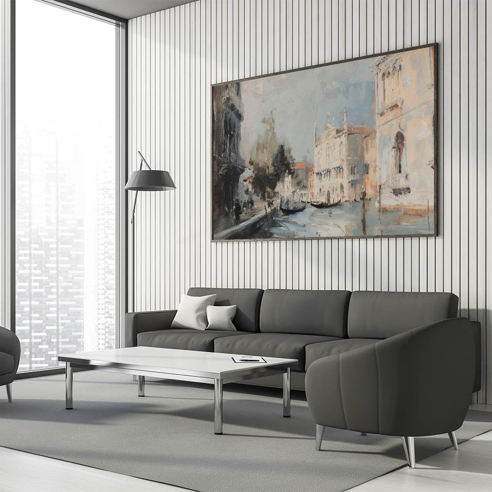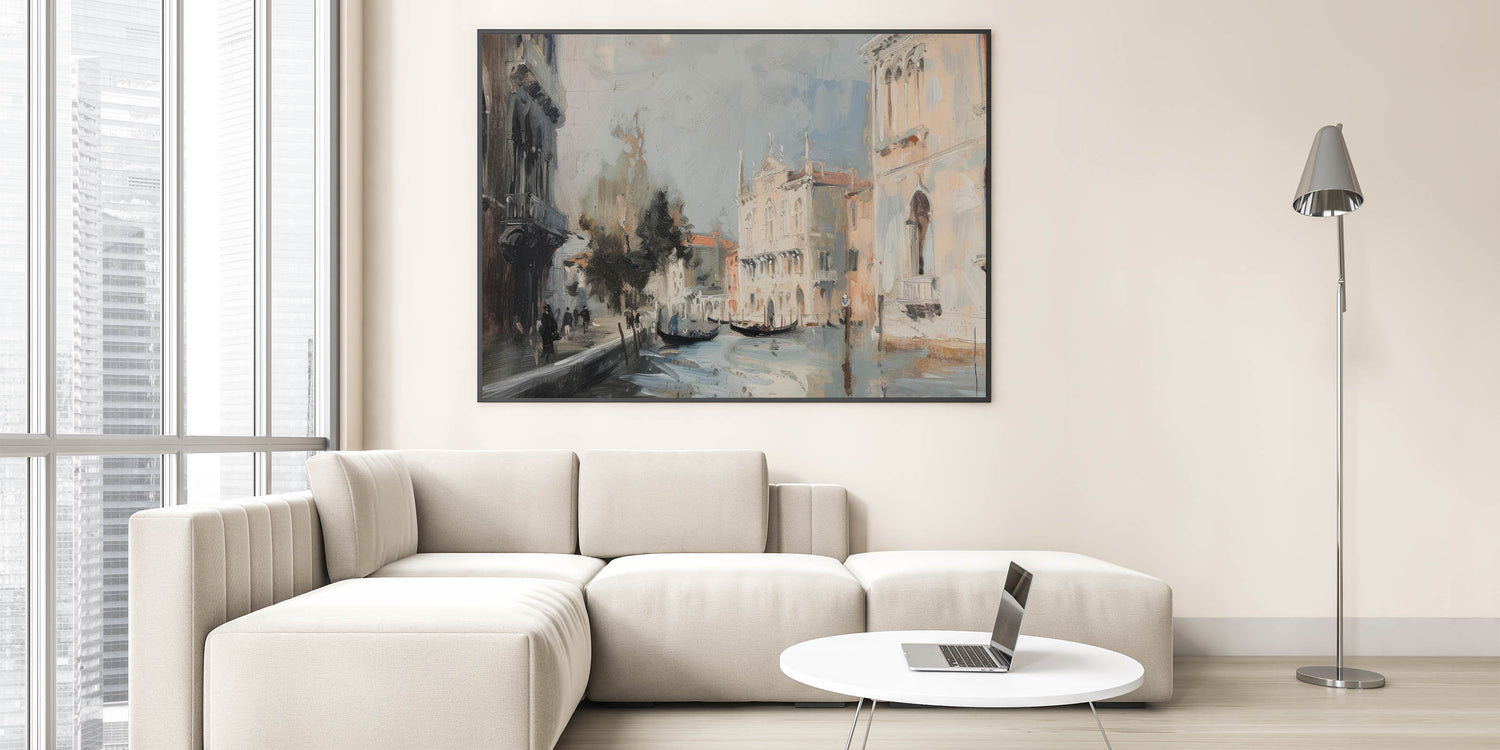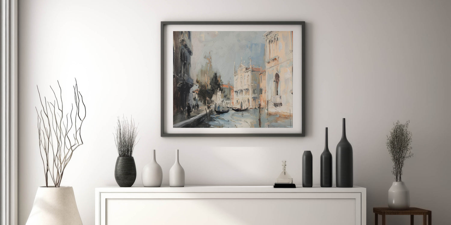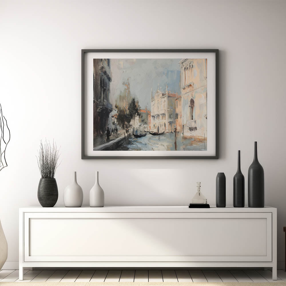 This Venetian canal art print transforms any room into a sophisticated haven. Whether displayed in a living room, office, or bedroom, it creates an ambiance of serenity and elegance. Pair it with complementary decor elements for a cohesive, stylish look.