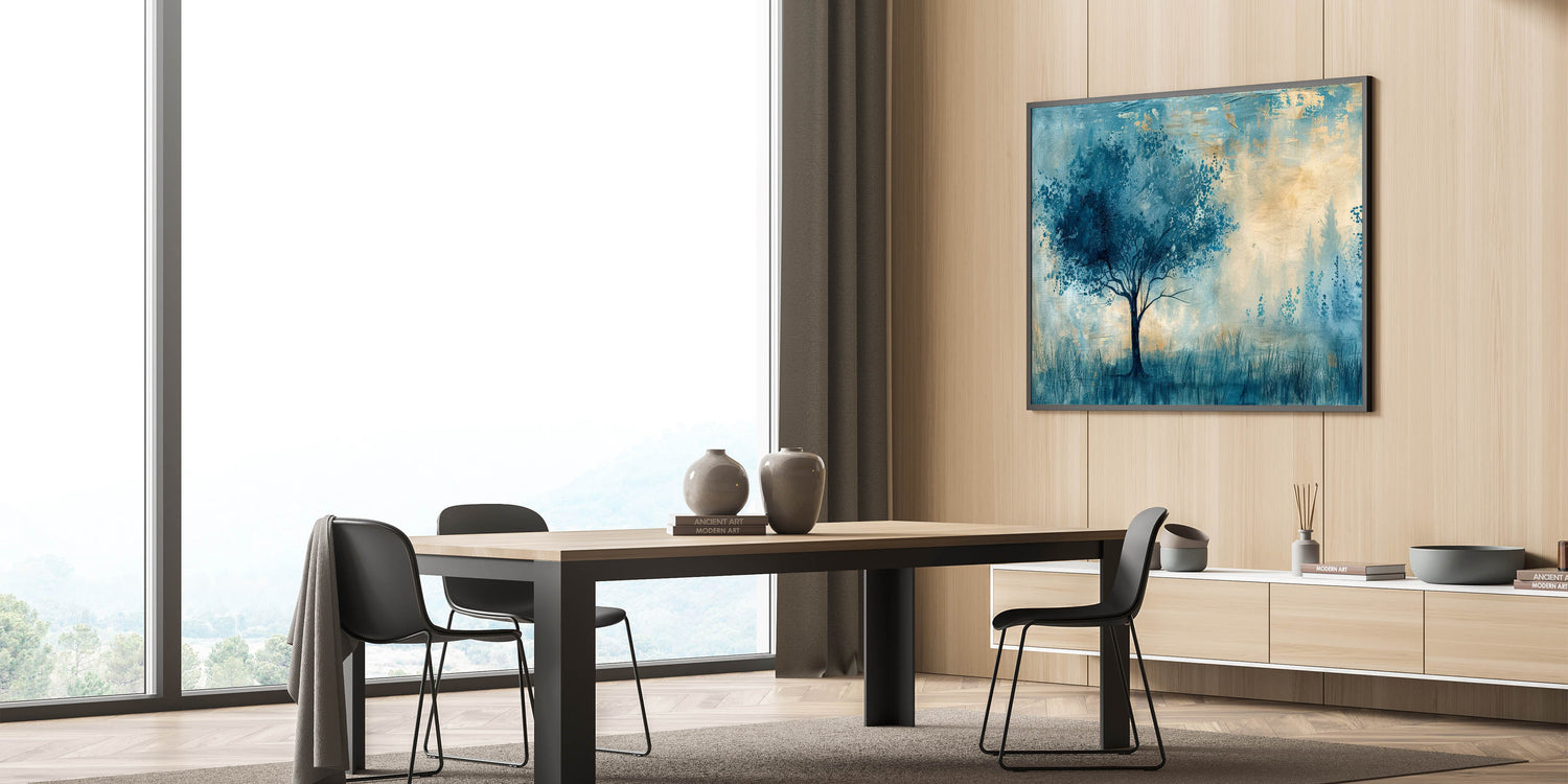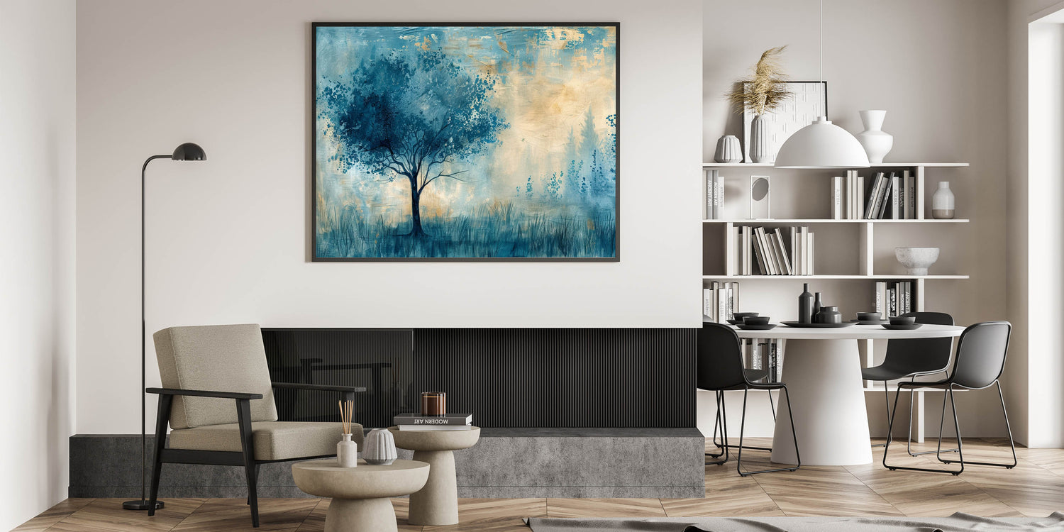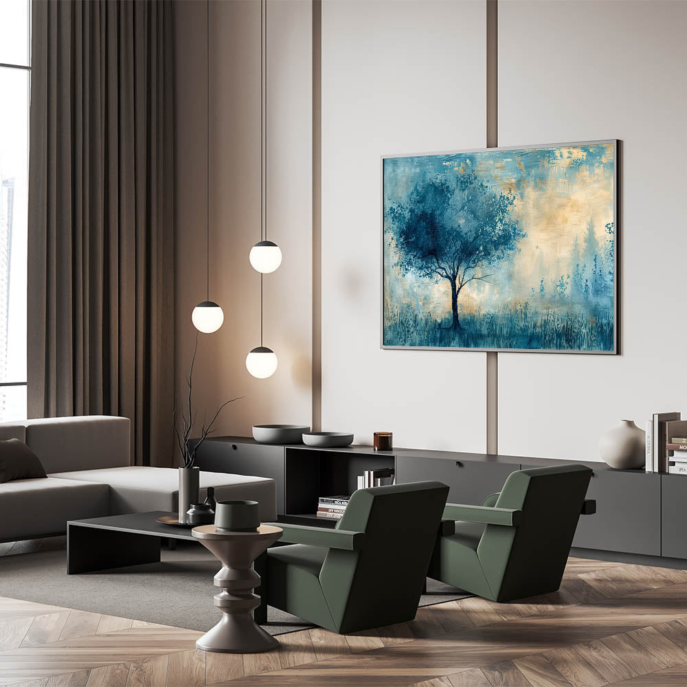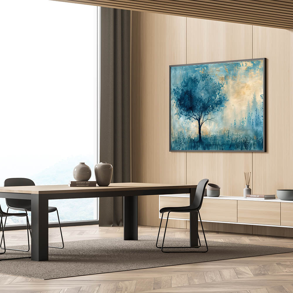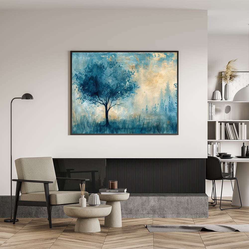 Abstract Landscape Wall Art - Blue Tree and Golden Glow