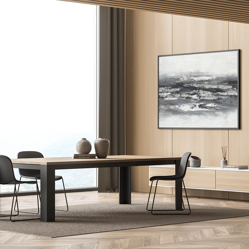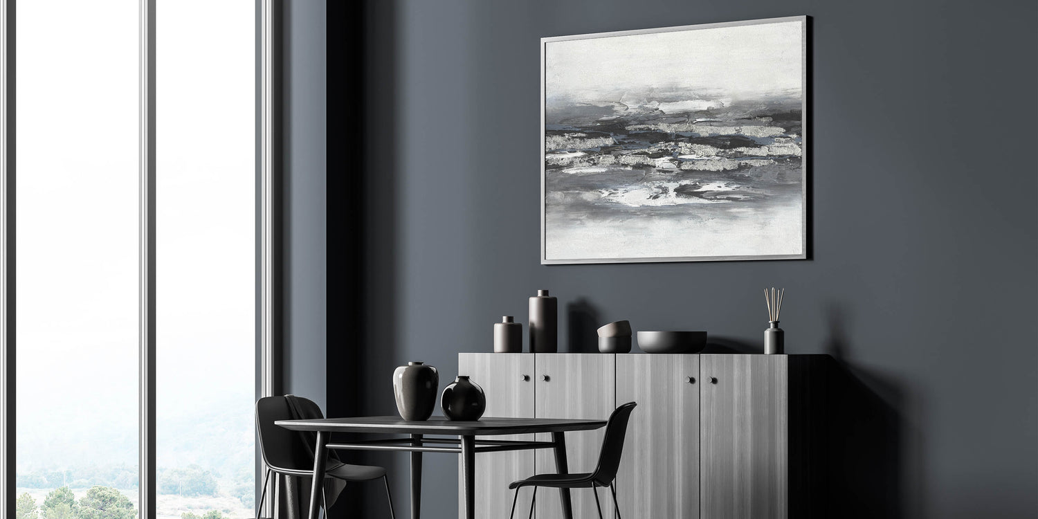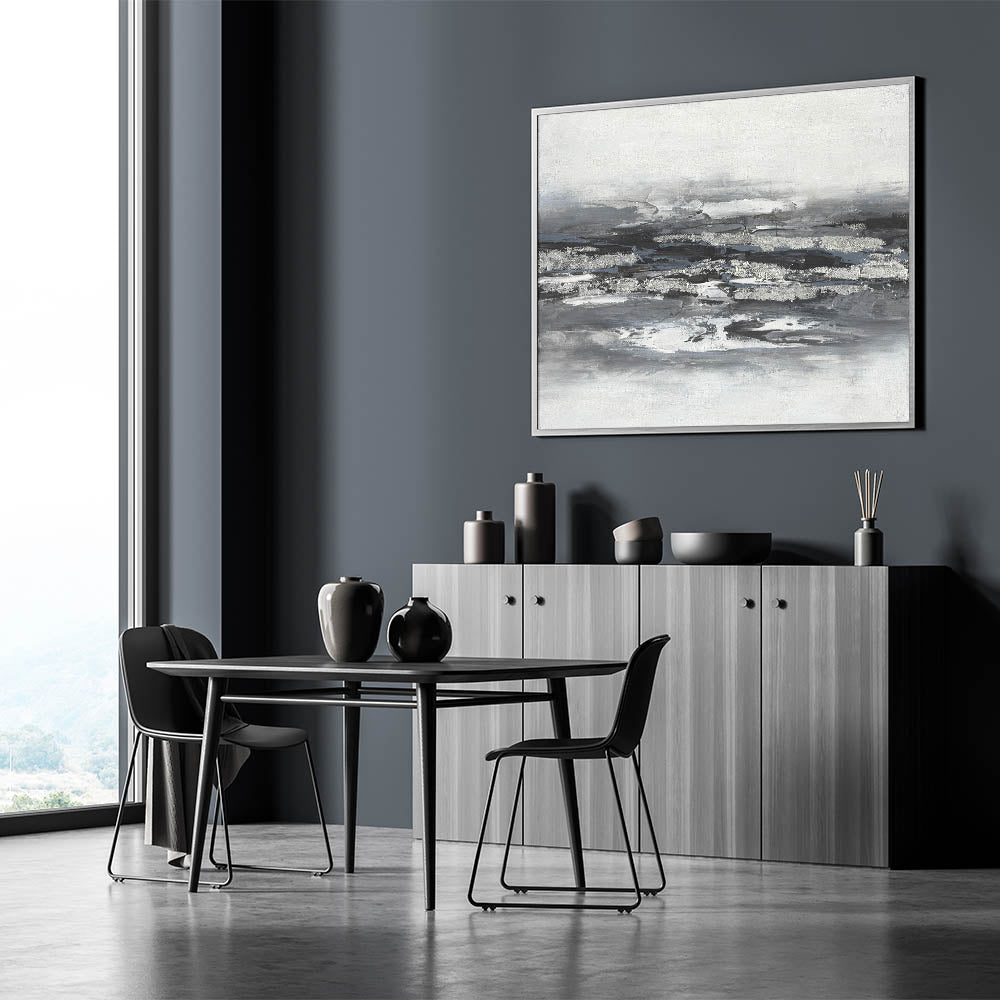 Introduce a sense of tranquility and sophistication with this calming landscape acrylic print, featuring a striking black, white, and silver abstract design. The bold, textured brushstrokes create a modern, layered effect that captures the essence of serene landscape artwork while maintaining a minimalist aesthetic. This piece is ideal for contemporary interiors, adding depth and elegance to any space.