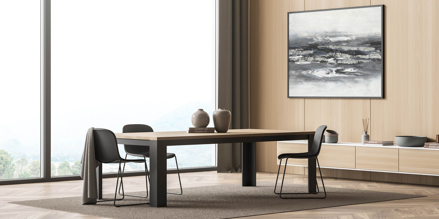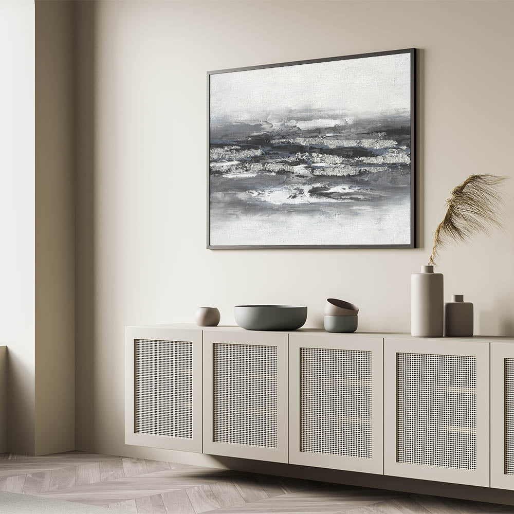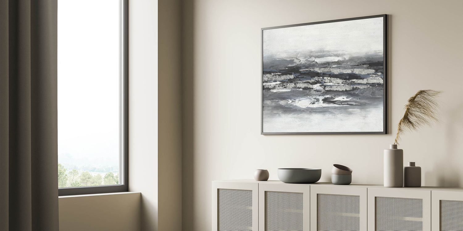 Introduce a sense of tranquility and sophistication with this calming landscape acrylic print, featuring a striking black, white, and silver abstract design. The bold, textured brushstrokes create a modern, layered effect that captures the essence of serene landscape artwork while maintaining a minimalist aesthetic. This piece is ideal for contemporary interiors, adding depth and elegance to any space.
