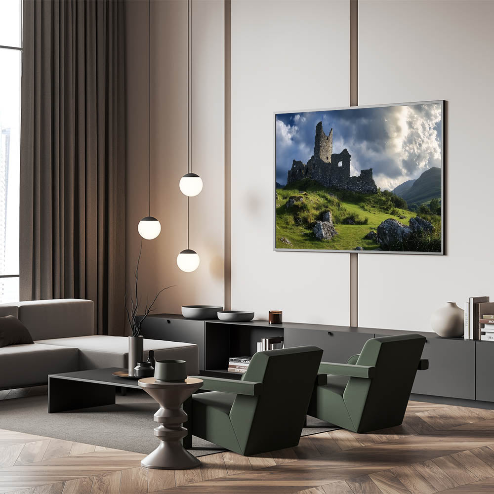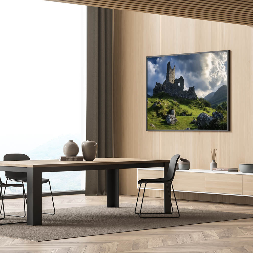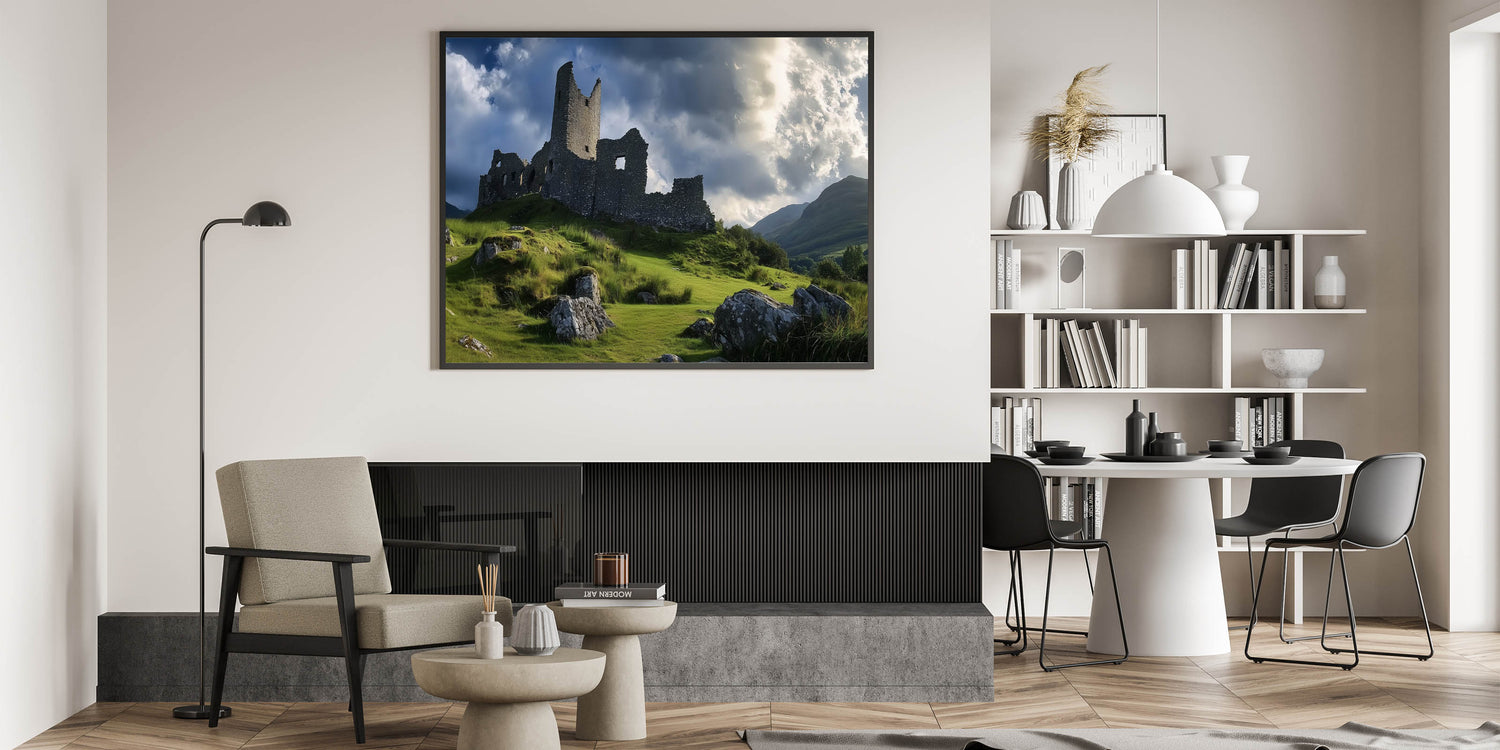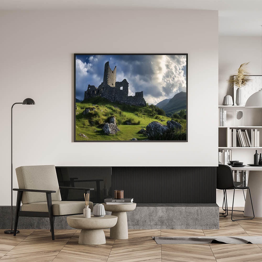 Immerse yourself in the dramatic beauty of this castle landscape print, featuring a striking ruined tower set against lush green hills and a backdrop of moody skies. This artwork captures the timeless allure of historic ruins, making it a captivating addition to any decor style.