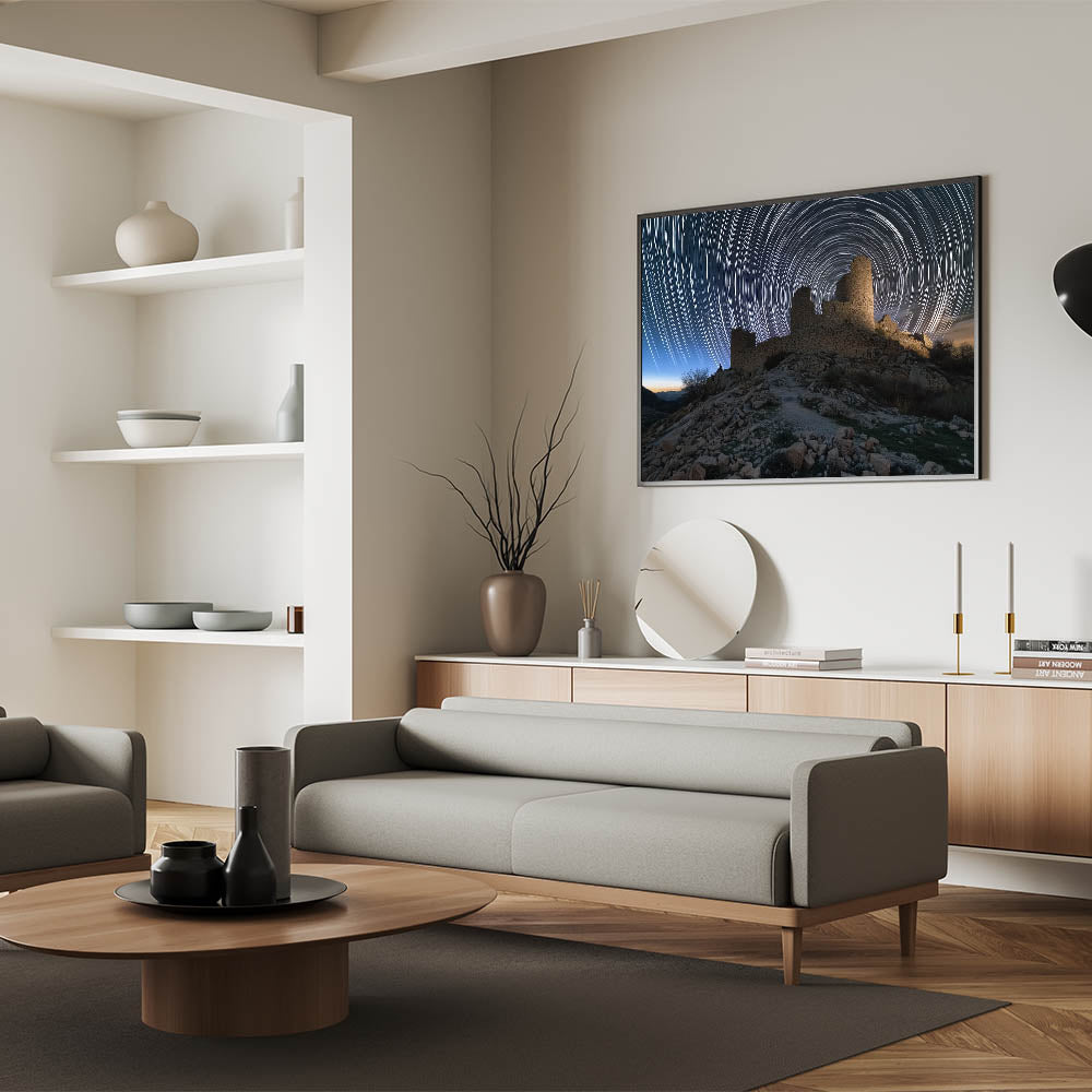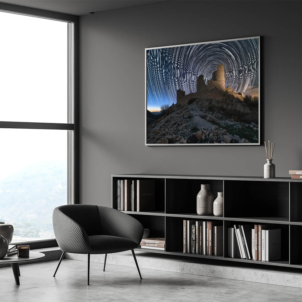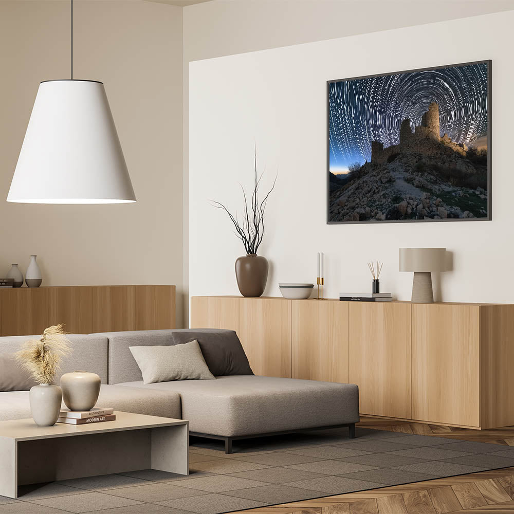 Transform your living room, bedroom, or office with this breathtaking scene of ancient ruins and swirling star trails. This unique piece adds a sense of wonder and timeless beauty to any setting. Experience the captivating blend of history and the cosmos today!