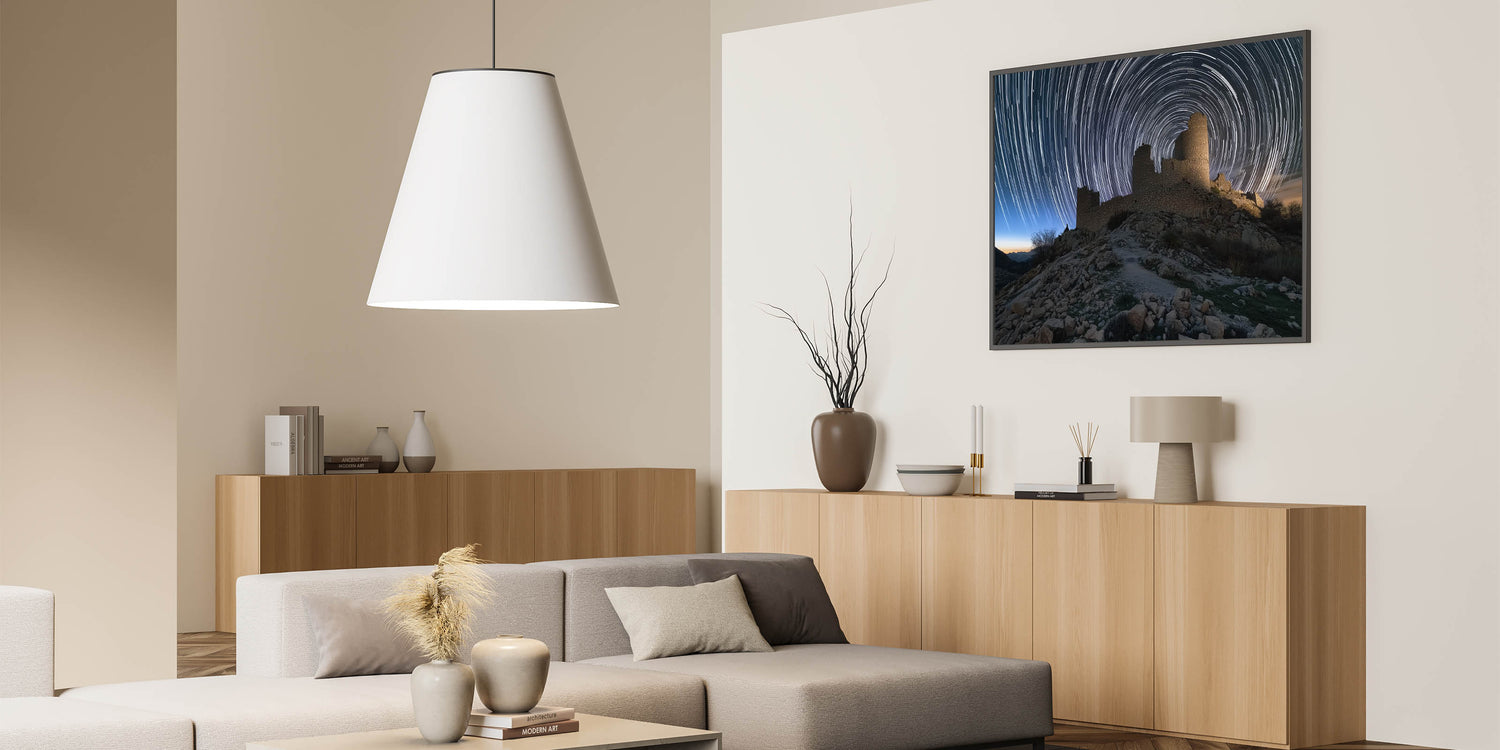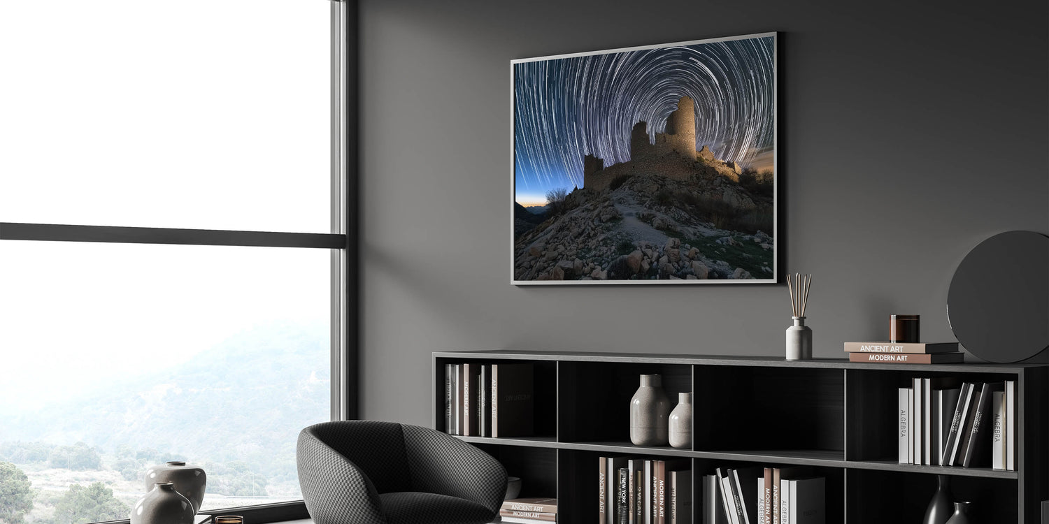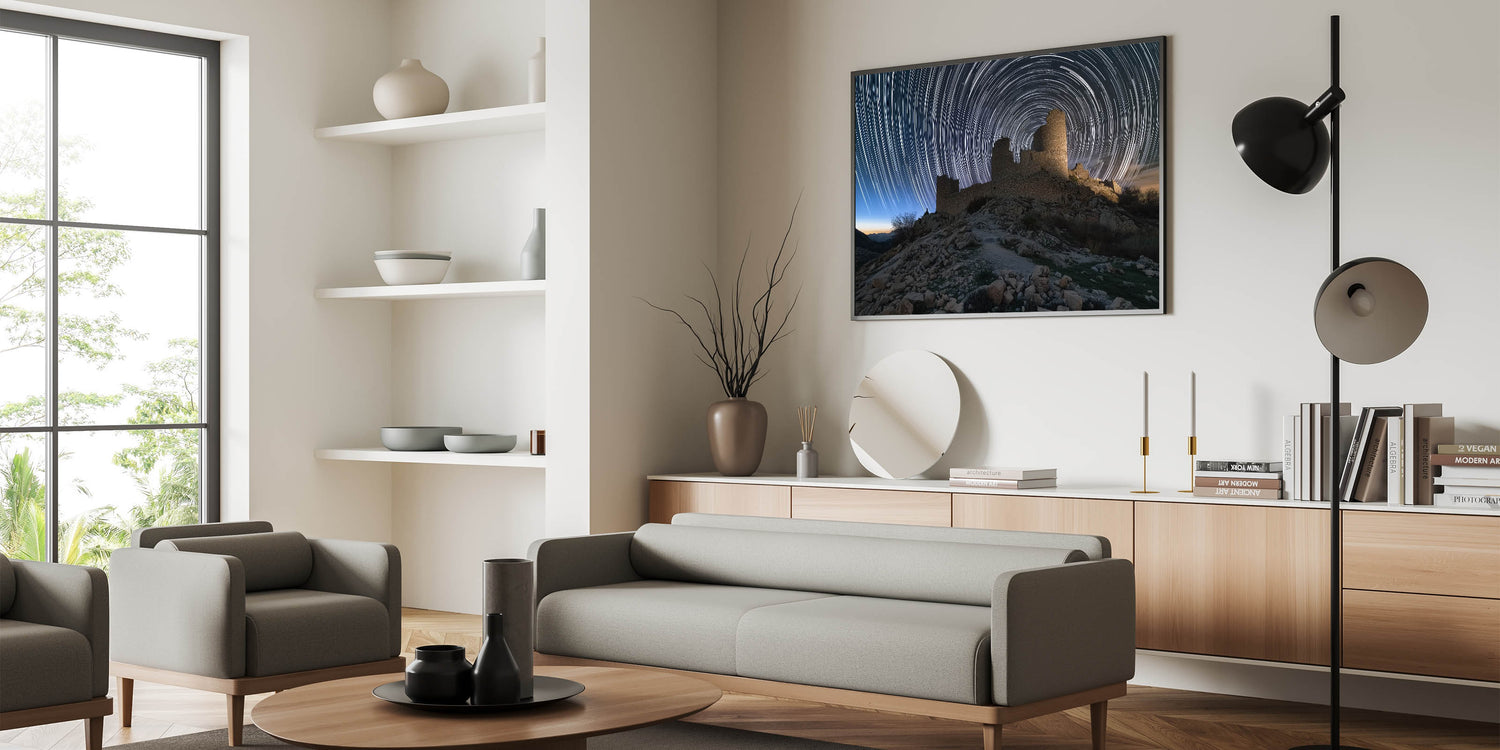 Transform your living room, bedroom, or office with this breathtaking scene of ancient ruins and swirling star trails. This unique piece adds a sense of wonder and timeless beauty to any setting. Experience the captivating blend of history and the cosmos today!