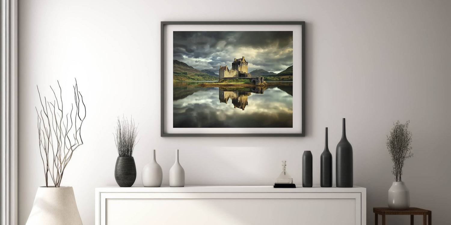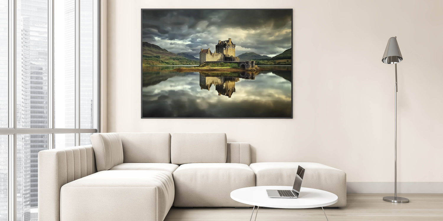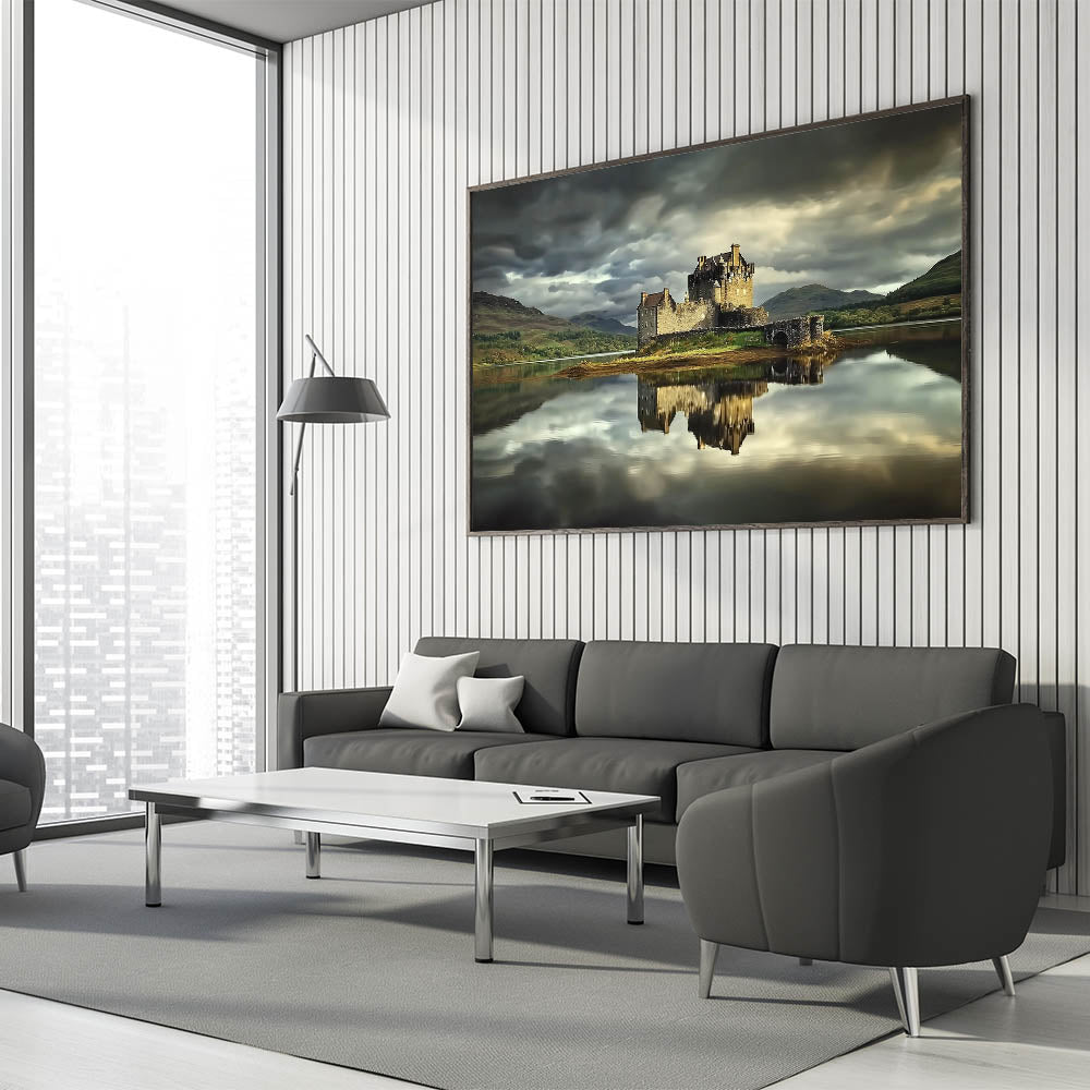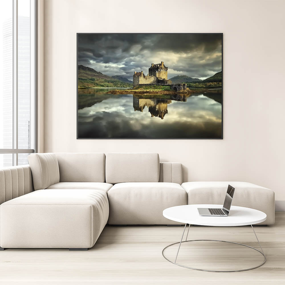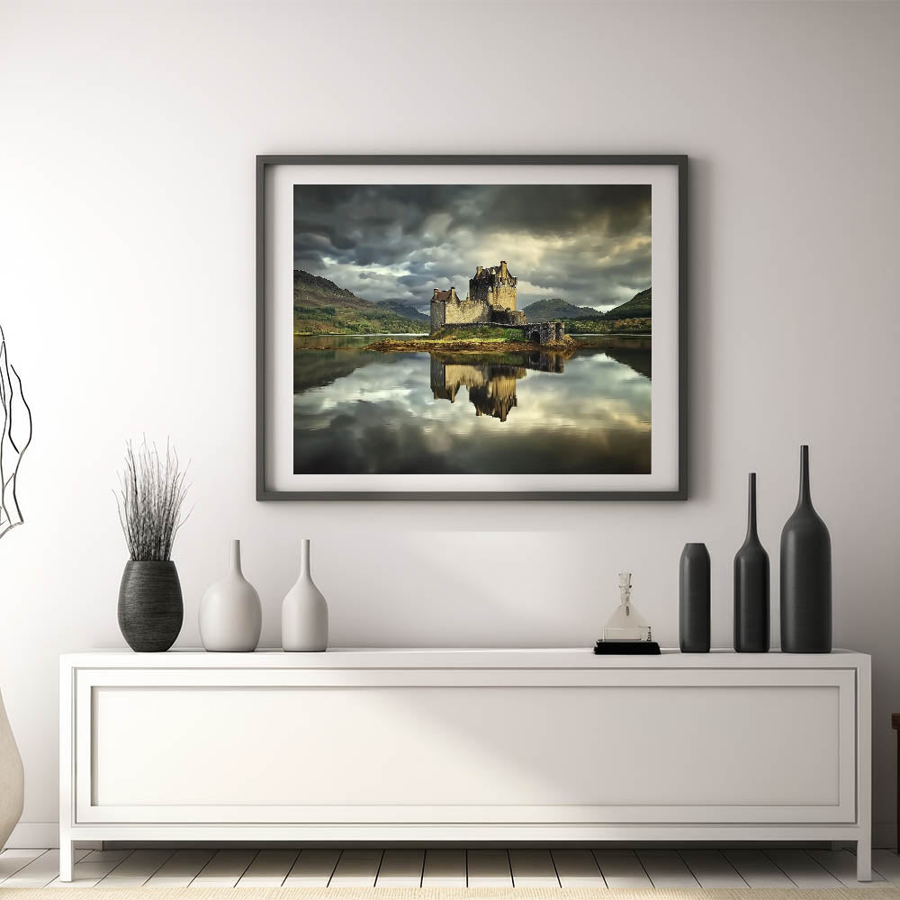 Discover the serene beauty of this castle print, featuring a historic fortress perfectly reflected on the still waters of a tranquil lake. The dramatic moody sky and lush green hills in the background add a captivating sense of depth and atmosphere, making this artwork a timeless and elegant addition to your space.