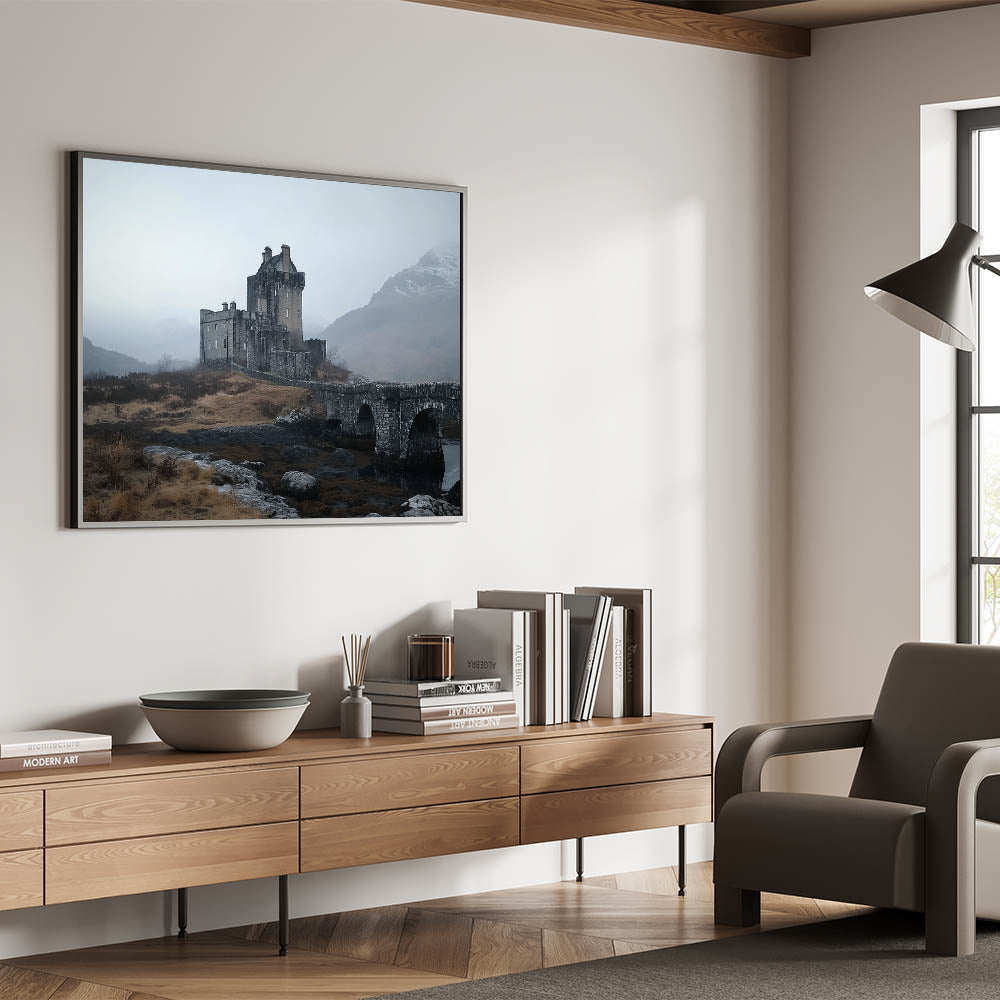 Immerse yourself in the tranquil beauty of this foggy castle wall art, showcasing a majestic medieval fortress surrounded by a soft, misty landscape. The muted tones of the stonework and the serene haze create a captivating and atmospheric scene that evokes timeless elegance and mystery. This artwork is perfect for adding a touch of history and serenity to your home.