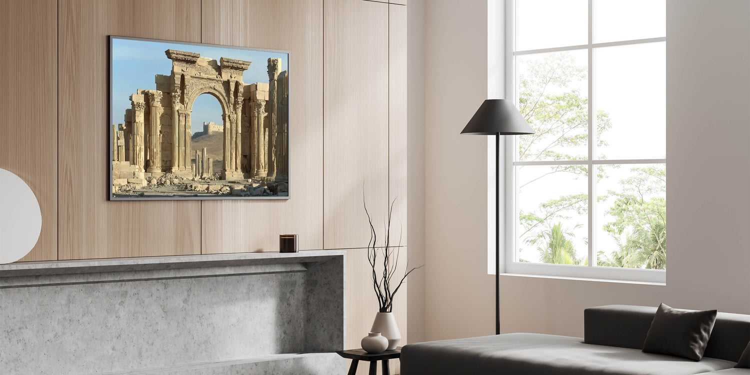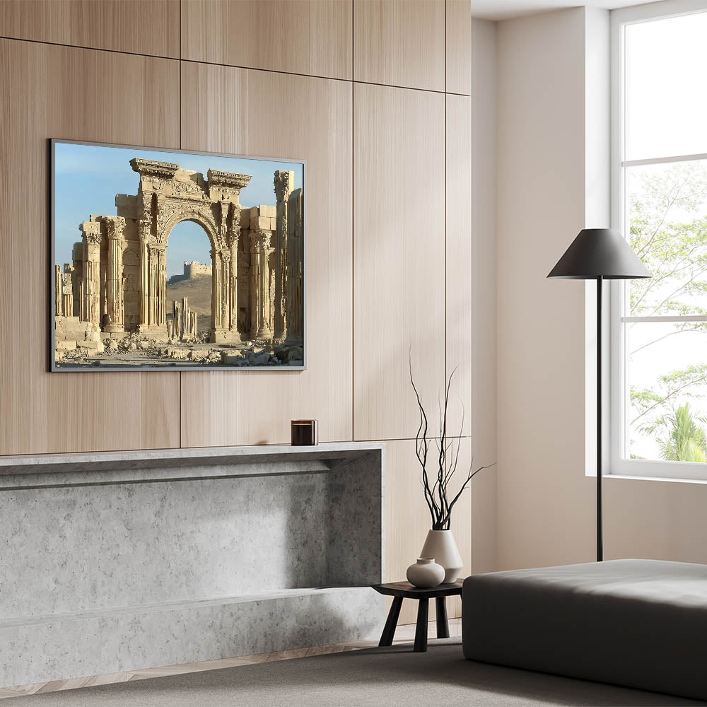 Step back in time with this exquisite artwork of ancient ruins featuring intricately carved columns and an iconic archway framing a distant fortress. The warm hues of the stonework contrast beautifully with the vast, serene desert landscape, creating a harmonious blend of history and nature. This artwork embodies the grandeur of ancient civilizations and their architectural mastery, making it a perfect centerpiece for any room.